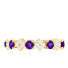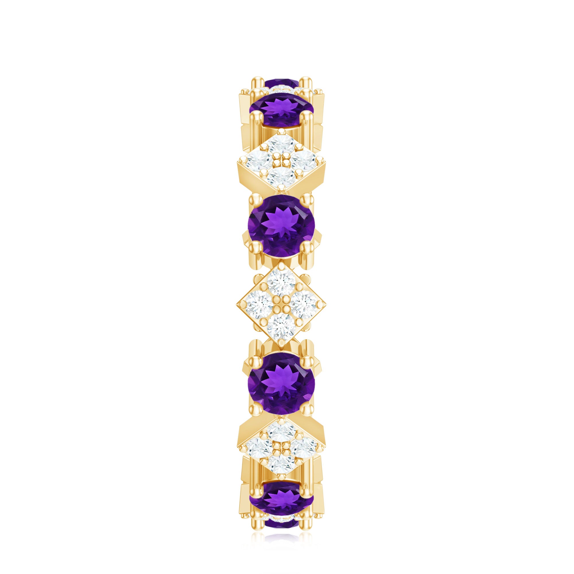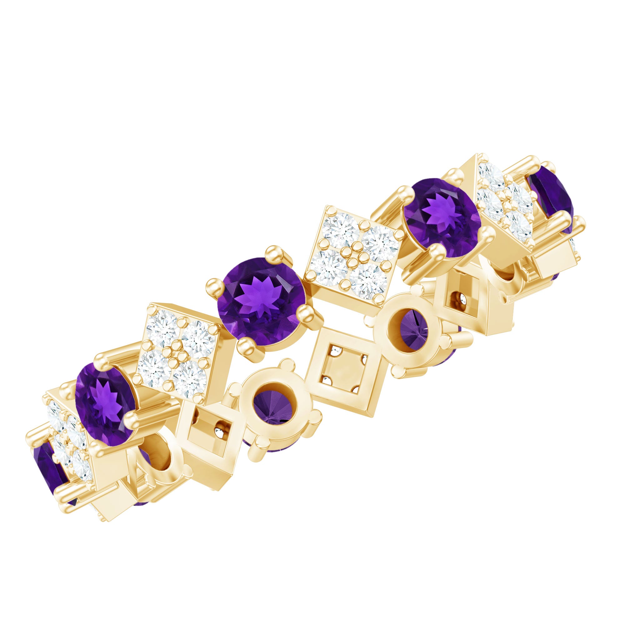 See your lady getting compliments when she will flaunt this Amethyst and Diamond Eternity Ring in a party. This Eternity Ring with Round Amethyst and Contemporary Diamond in Rhombus Shape is crafted in Solid Gold. Grab it for your beloved fast.