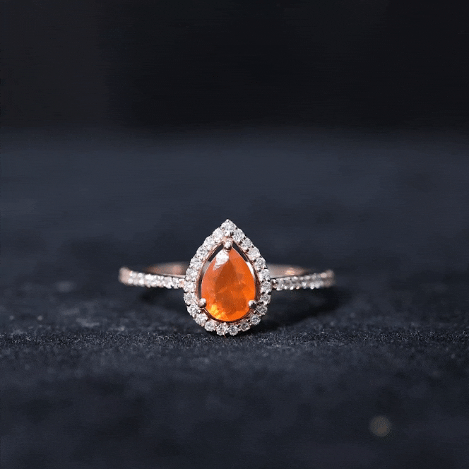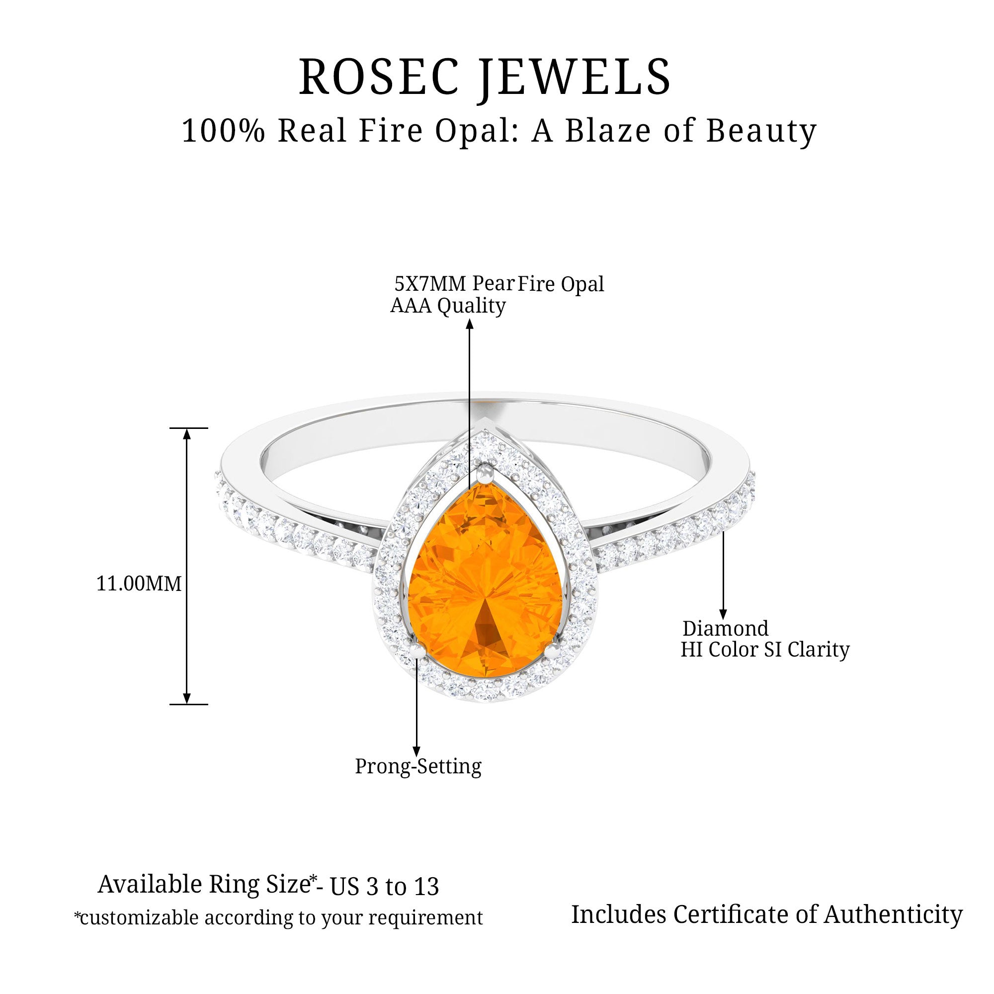 Real 0.6 Carat Fire Opal Teardrop Engagement Ring with Diamond Halo