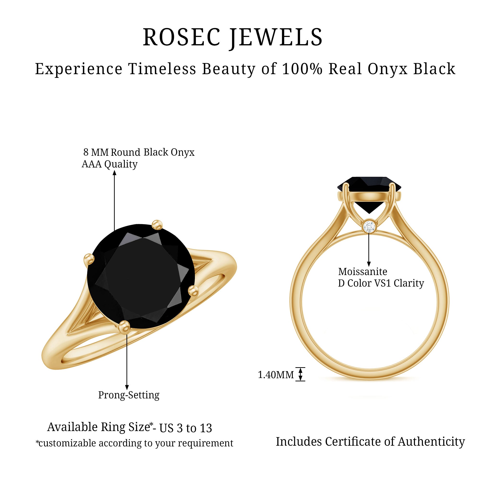 Seal your affection with this chic and sophisticated Black Onyx Solitaire Ring, which elegantly represents a profound bond and unwavering commitment. This Split Shank Engagement Ring serves as a delightful means to celebrate a significant moment or express your emotions. It features a 8 MM round shape Black Onyx, elegantly set in a prong solitaire setting with a split shank. Due to its versatile design, this December Birthstone Ring is both understated and refined, making it an excellent option for a solitaire ring, a birthday gift, or an everyday accessory. The AAA Quality Black Onyx embodies sophistication and importance, crafted to signify everlasting love. This Black Onyx Engagement Ring not only captivates with its brilliance but also boasts a contemporary aesthetic that merges classic charm with modern style. Achieving a harmonious blend of timeless elegance and a contemporary twist, this Round Engagement Ring exemplifies simplicity and iconic design, serving as a beautiful tribute to eternal romance. Its distinctive beauty renders this 2 Carat Engagement Ring appropriate for any occasion, be it an Engagement, Wedding, or Anniversary.