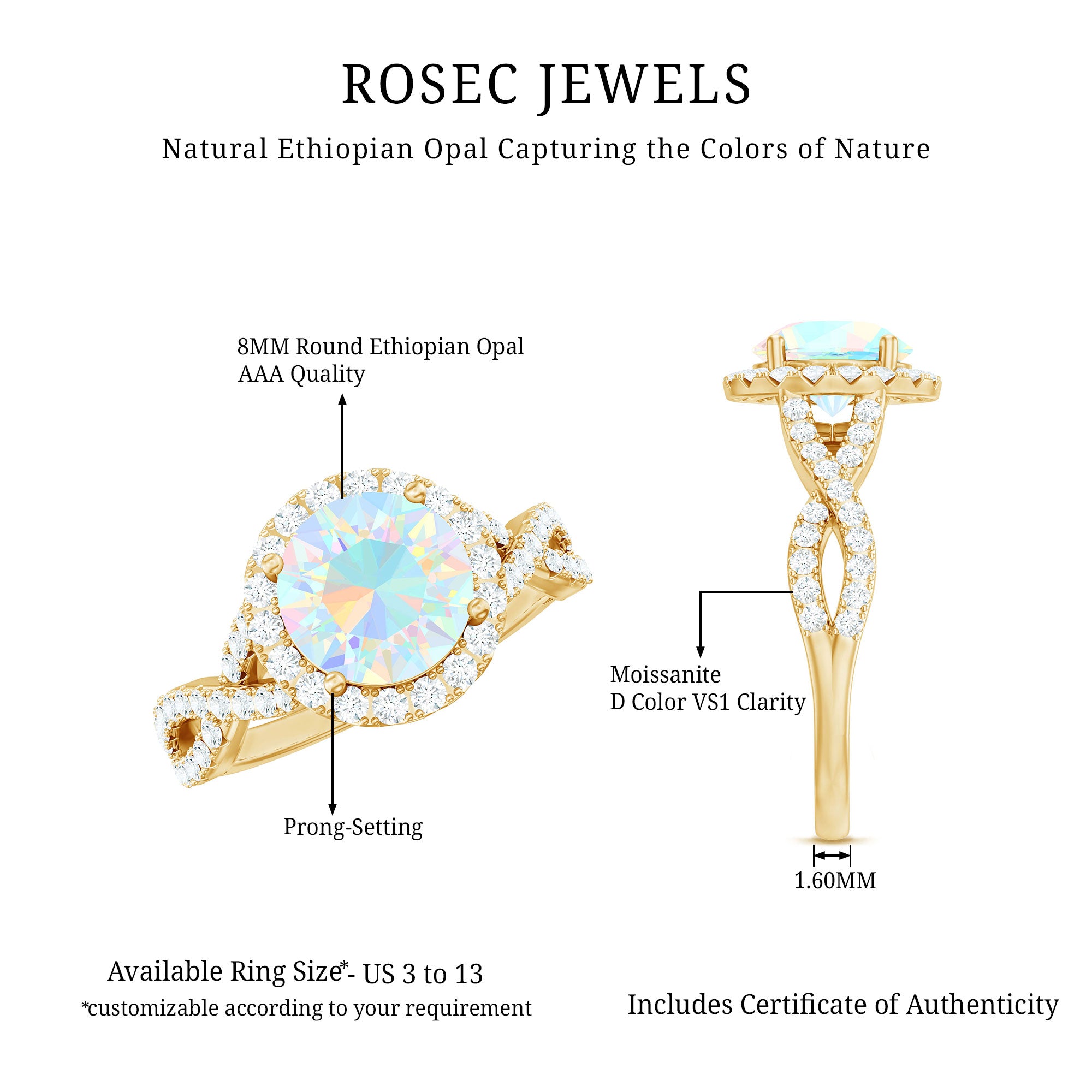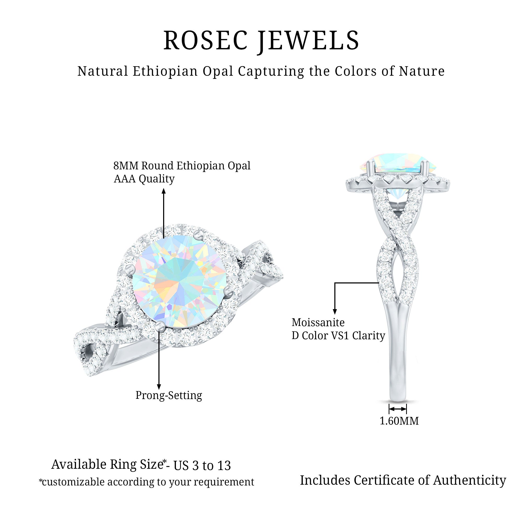 Slip into something truly unforgettable with this spellbinding Ethiopian Opal Engagement Ring, where magic meets meaning. This Classic Engagement Ring features a mesmerizing 8 mm Round Shape Ethiopian Opal set in Prong Setting, flickering with rainbow hues, surrounded by a sparkling Halo of Moissanite stones that captures every glance and holds it spellbound. The Crossover Shank adorned with Moissanite stones, delicately entwined, adds a modern twist to the timeless romance of this Opal Halo Engagement Ring, while two Hidden Moissanite stones placed beneath the centerpiece whisper secrets of a love that is deep and eternal. Available in a range of sizes to ensure the perfect fit for your forever moment, this Crossover Ring for Engagement comes in a signature jewelry box, ready to dazzle at first sight. Whether you are marking a proposal, an anniversary or a vow to love endlessly, this Real Opal Engagement Ring turns a moment into a lifetime.