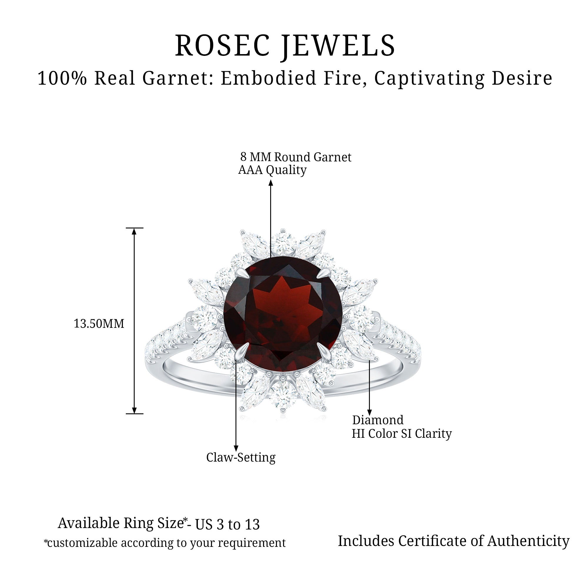 Make a stunning statement with this Garnet Engagement Ring, designed to capture the heart and the eye. The 8 mm Round Shape Garnet center stone in Claw Setting commands attention, surrounded by a sparkling Halo of Marquise and Round Shape Diamond stones that sparkle with every movement. This combination of shapes creates a dazzling effect that symbolizes the depth and brilliance of your love. The band is adorned with dainty Diamond stones, adding extra shimmer and elegance while perfectly complementing the bold central stone. The balance of the deep red Garnet and the shimmering Diamond stones makes this Halo Engagement Ring an unforgettable symbol of passion and commitment. Whether you are marking an engagement, anniversary or simply celebrating your journey together, this Garnet Diamond Ring speaks volumes. Presented in a signature jewelry box and available in various sizes, this Red Garnet Ring is ready to make your moment unforgettable.