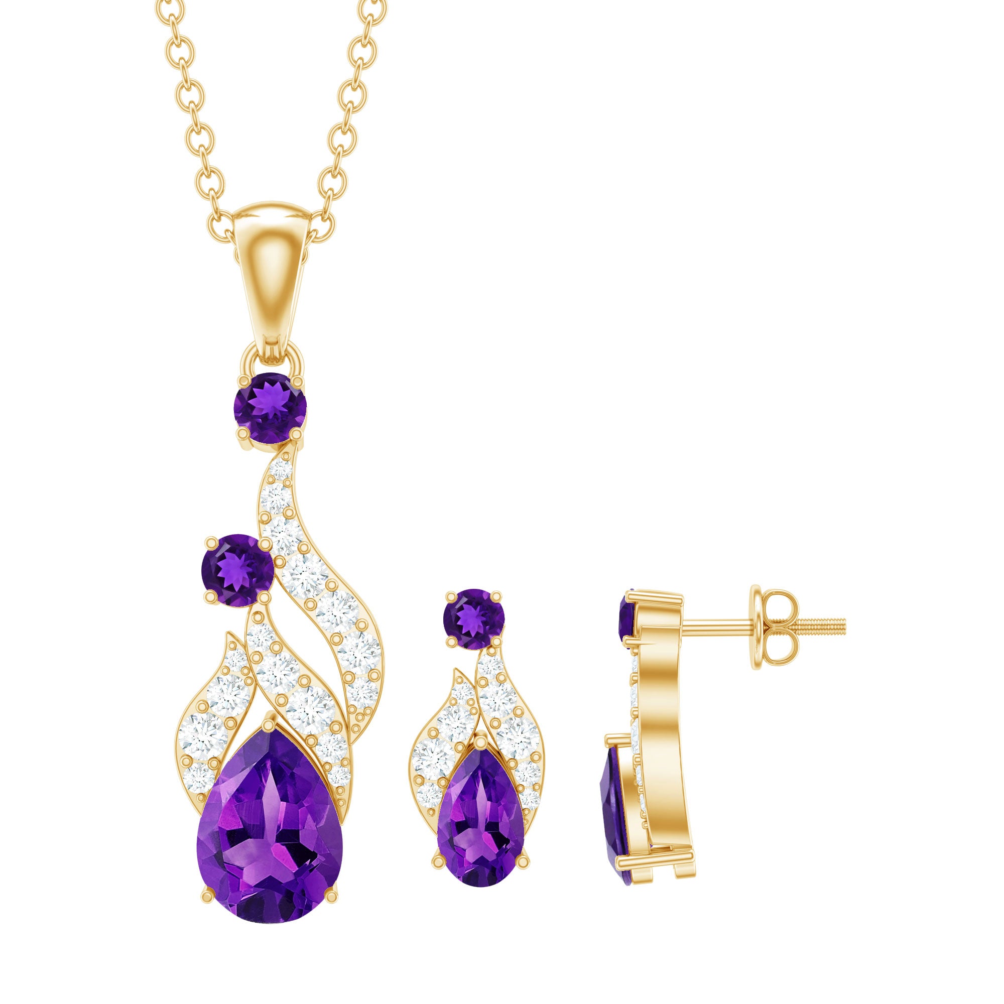 We understand the desire to add a touch of sparkle to everyday moments, which is why we present this exquisite Designer Amethyst and Diamond jewelry Set. It is carefully crafted to elevate your style and express your deep affection for the most important women in your life. This set features dazzling amethyst and Diamond dangle earrings, as well as a matching pendant necklace, creating a cohesive and elegant look.