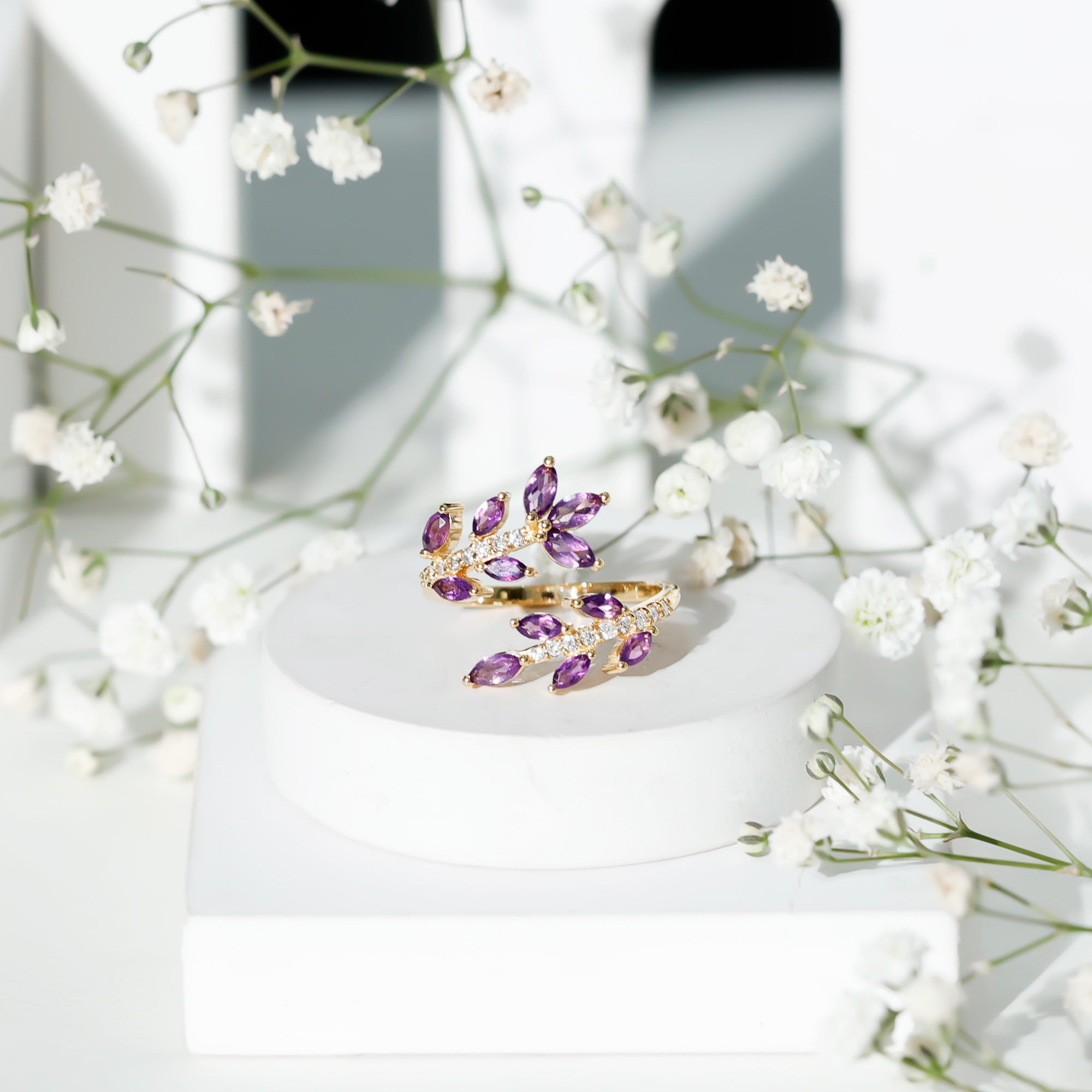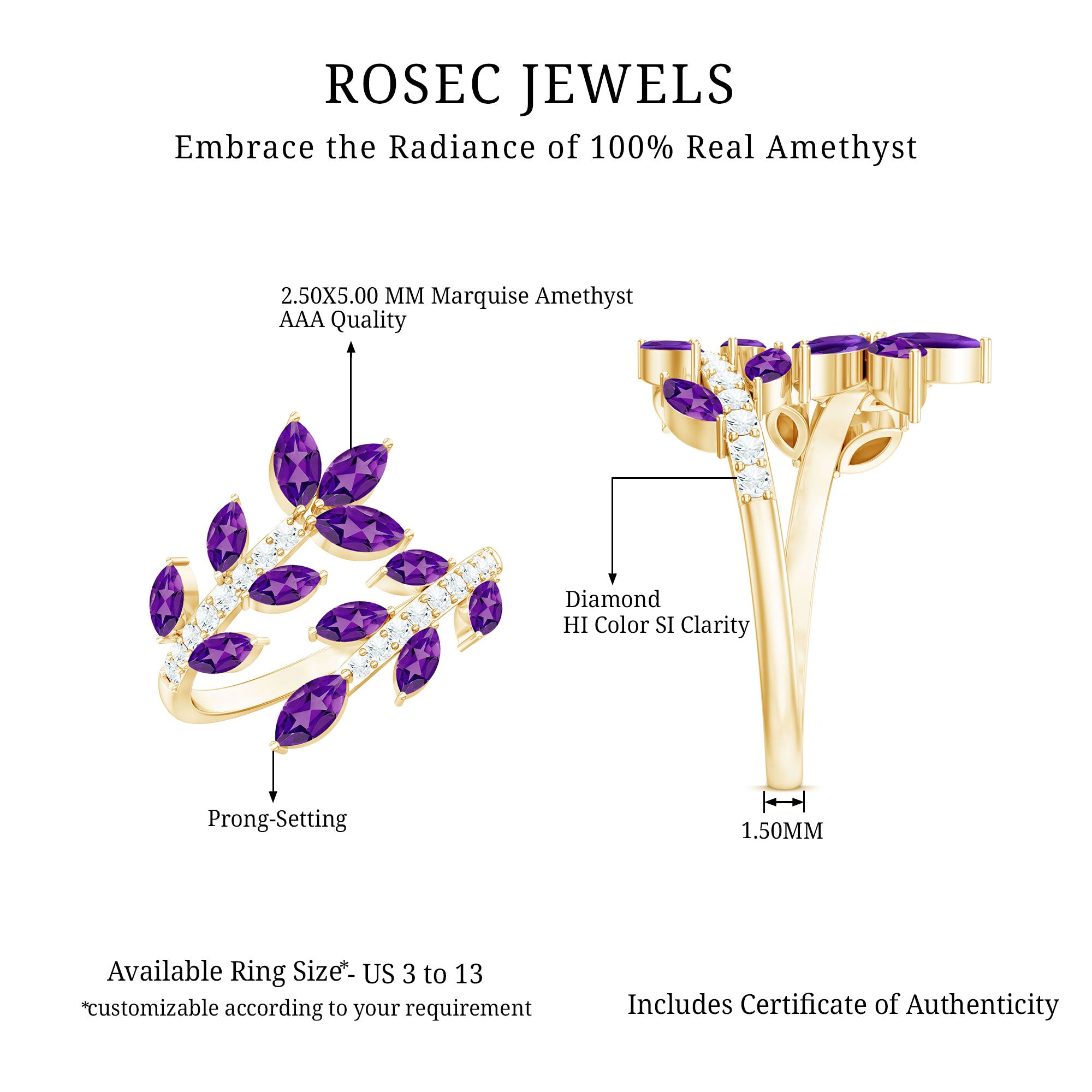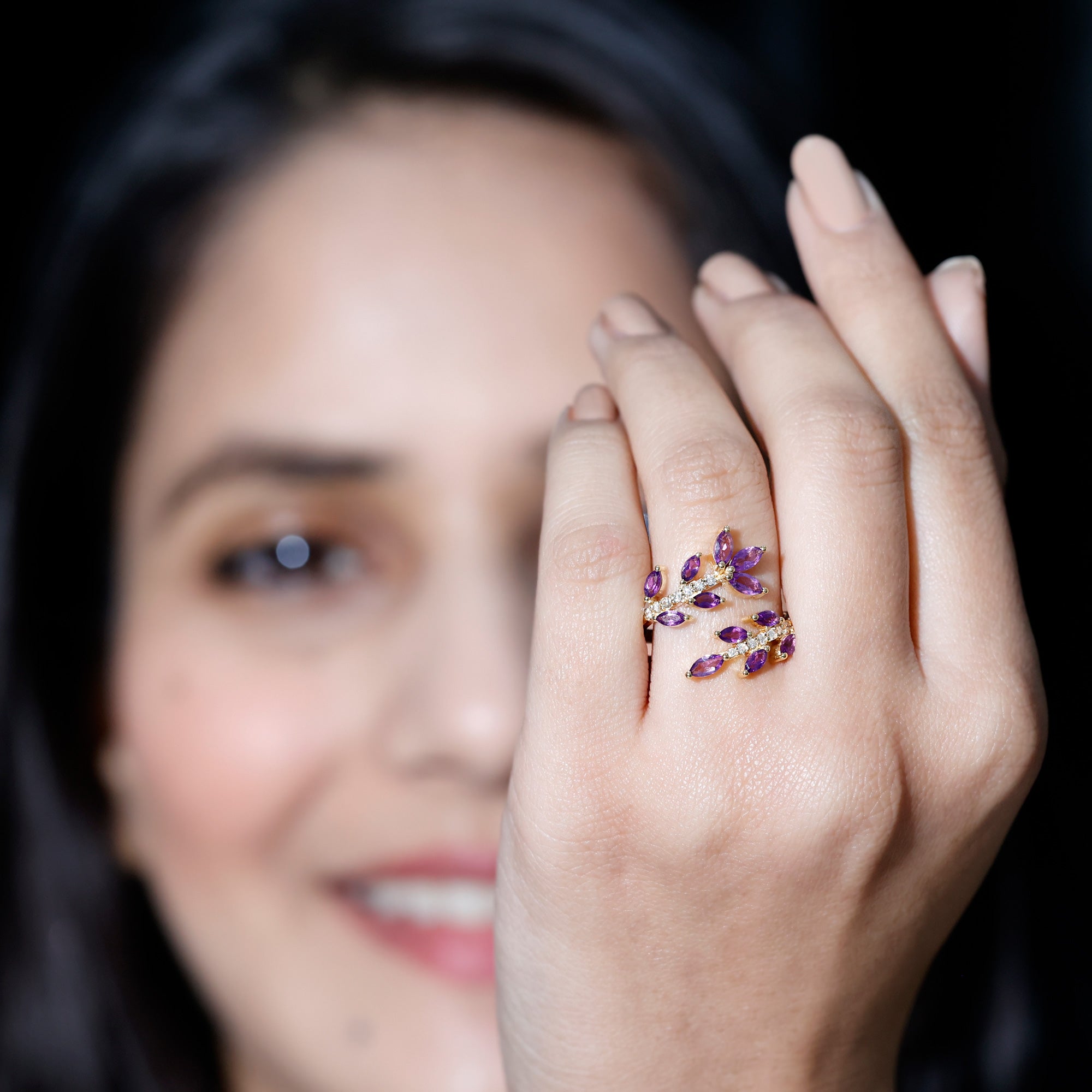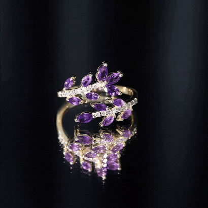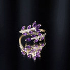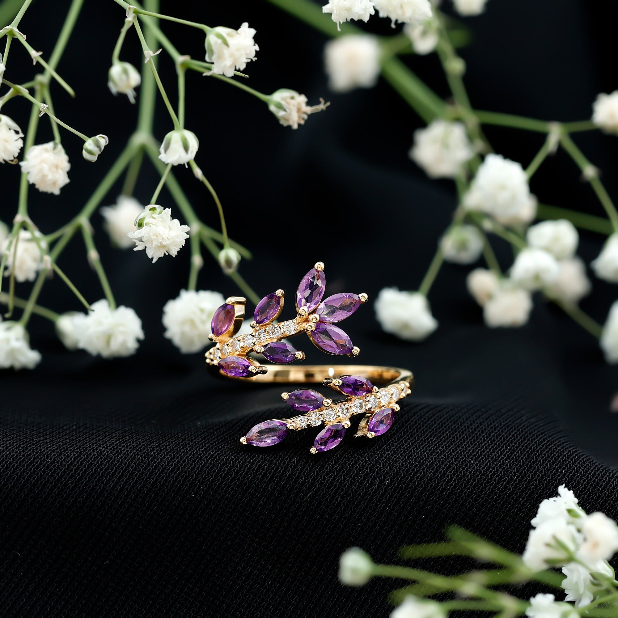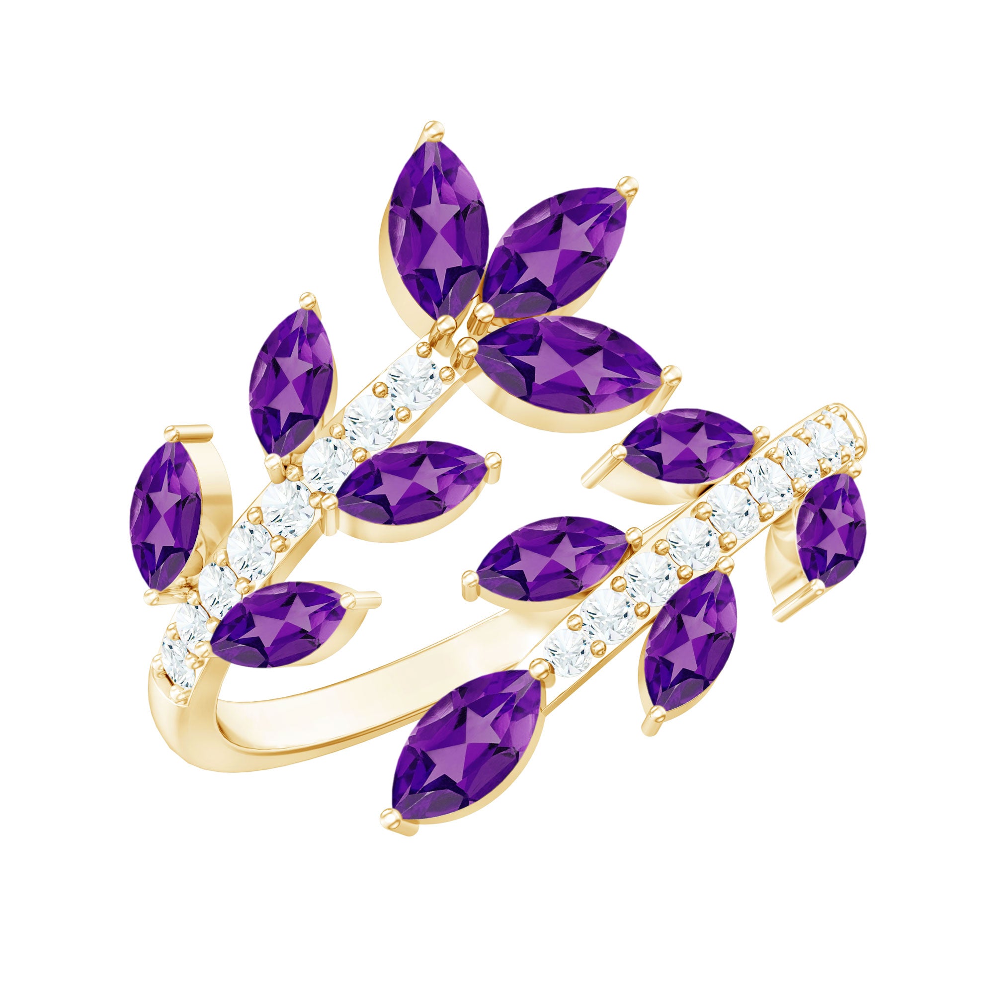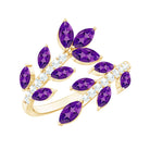 Indulge in elegance with this Amethyst Cocktail Ring. This ring features Marquise shape Amethyst and Round Shape Diamond. This Nature Inspired Ring will be a delightful addition to any womans jewelry collection. Adorn this beautiful Wrap Ring and rock that Cocktail party of the year. This Designer Ring beholds AAA quality Marquise Amethyst placed in a Leaf Branch Design that beautifully wraps your finger and adds an extra elegant touch with its unique Design. This ring will be delivered to you in a premium-quality box.