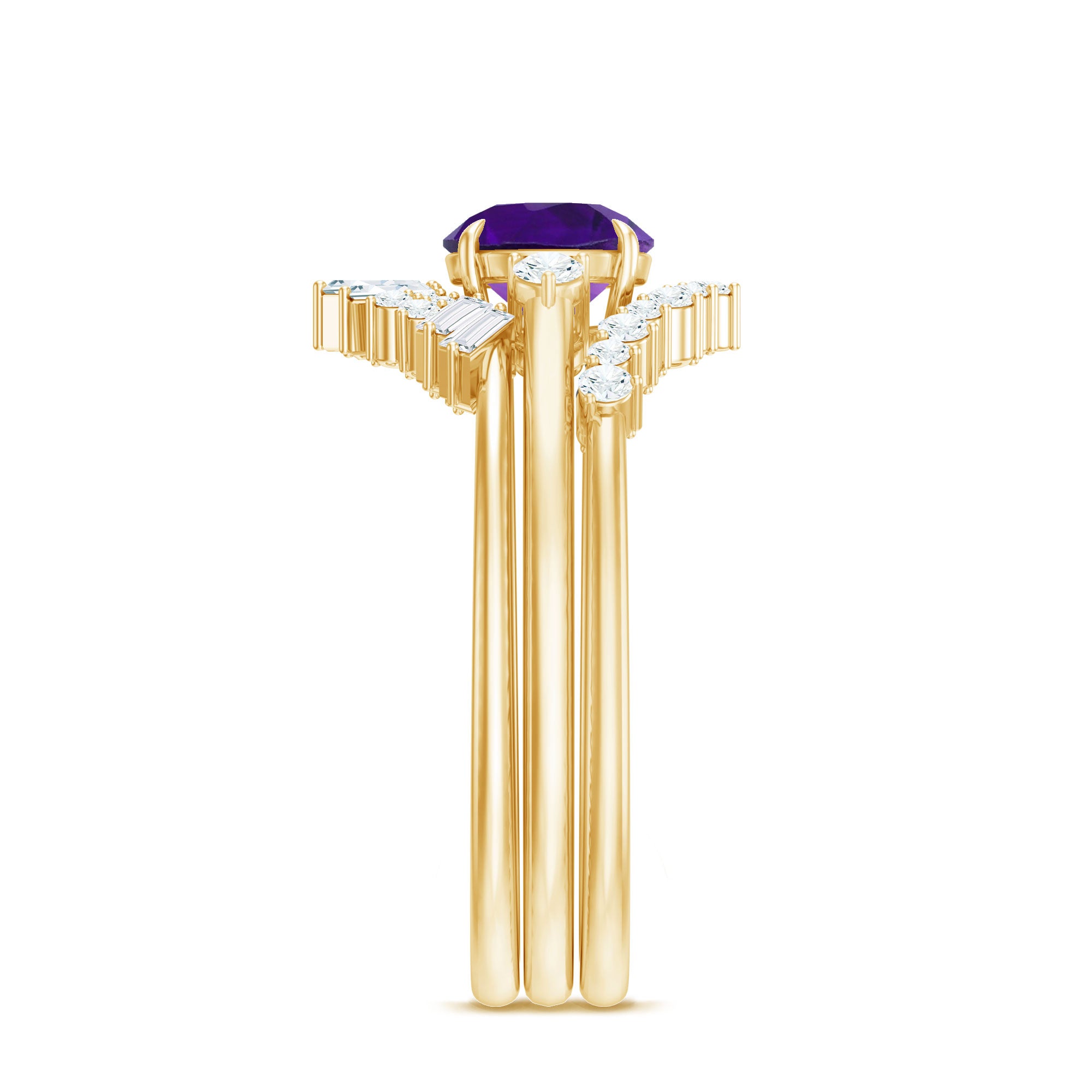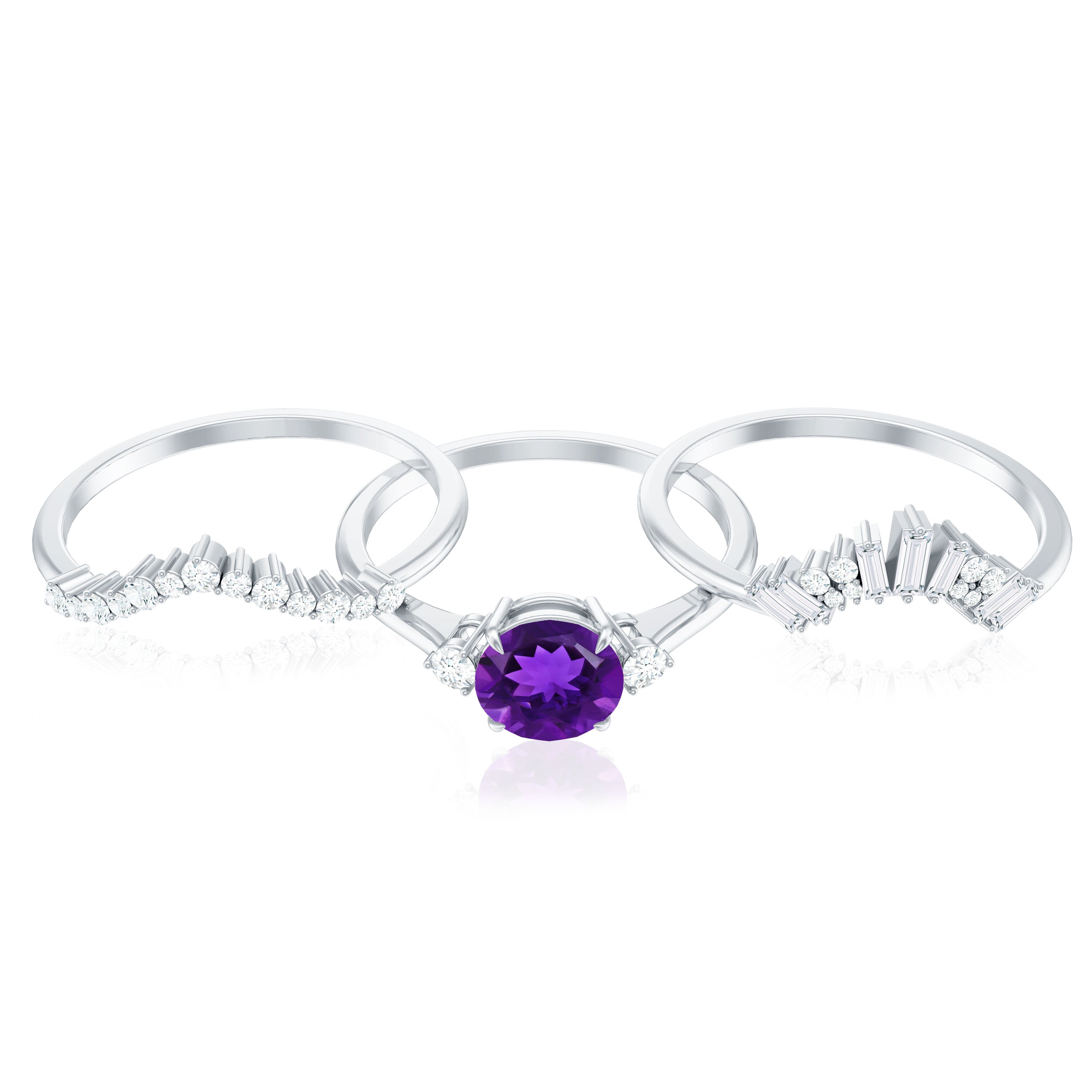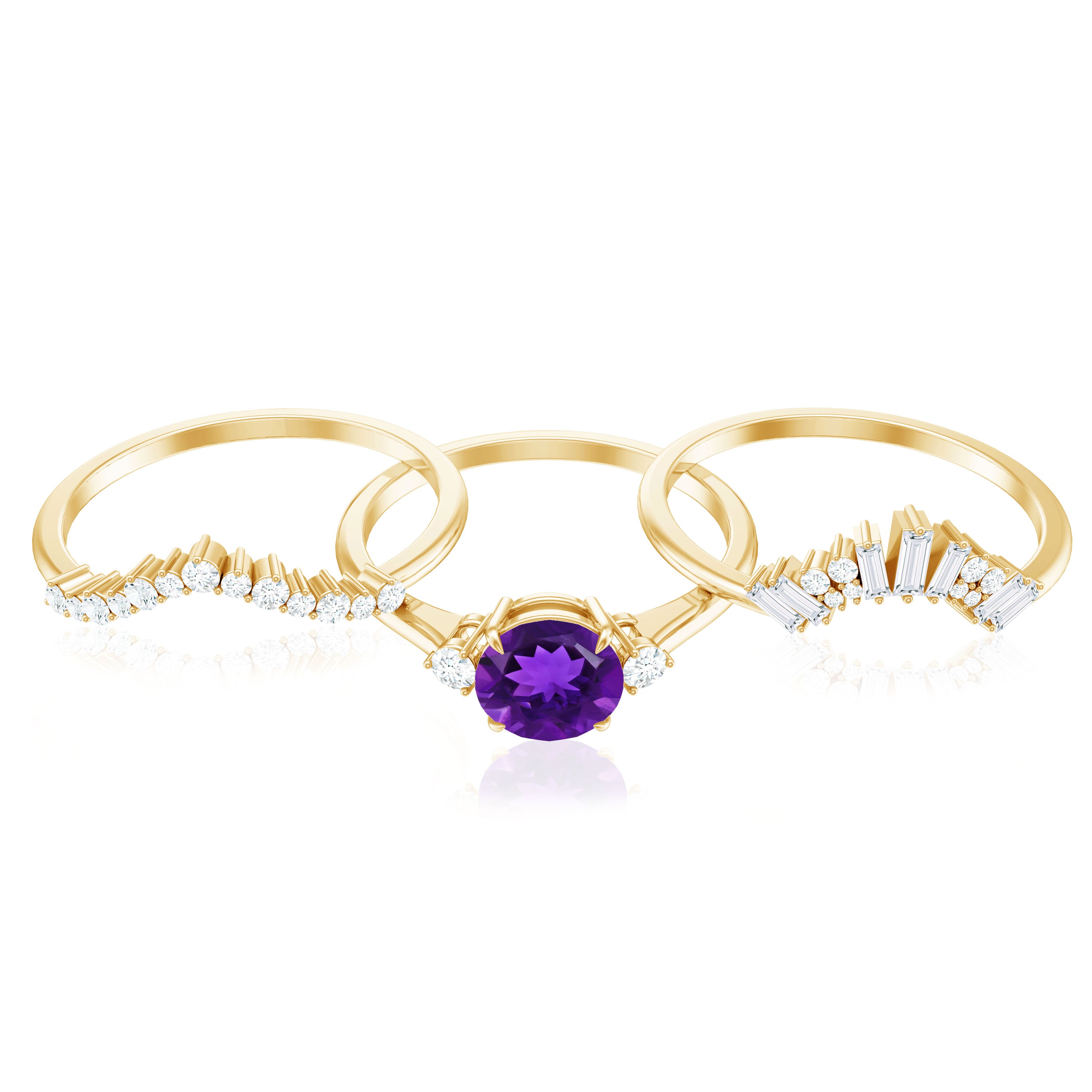 Celebrate your unique love story with this one-of-a-kind Engagement Ring Set. The center of the Amethyst Engagement Ring is adorned with a Round Brilliant Amethyst Solitaire held in a claw setting, and accented with Round Shape Diamond on both sides. The set also includes two Diamond Ring Enhancers, which are embellished with Round and Baguette Cut Diamond. All pieces in the set are crafted from Solid Gold, making it a beautiful choice for the special woman in your life.