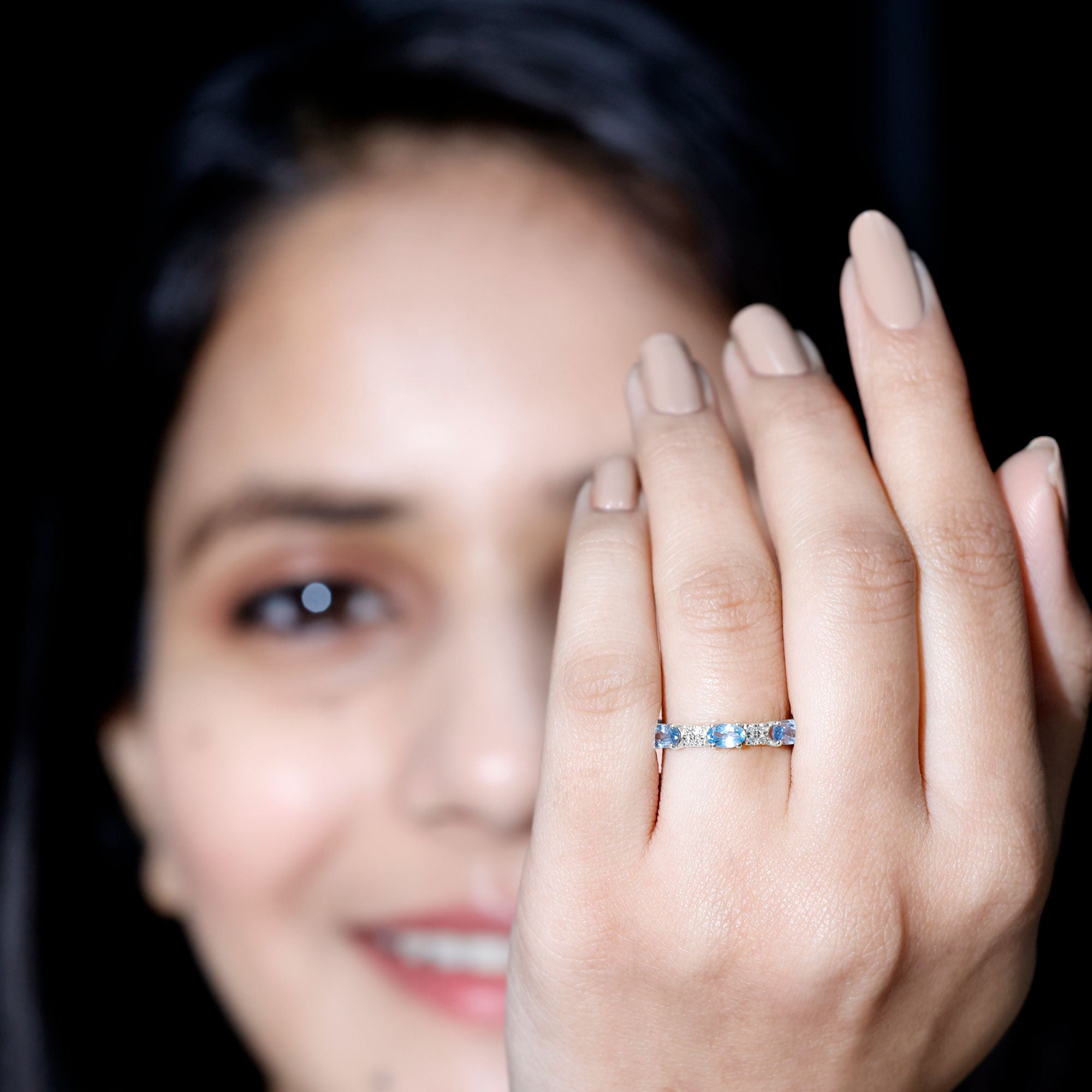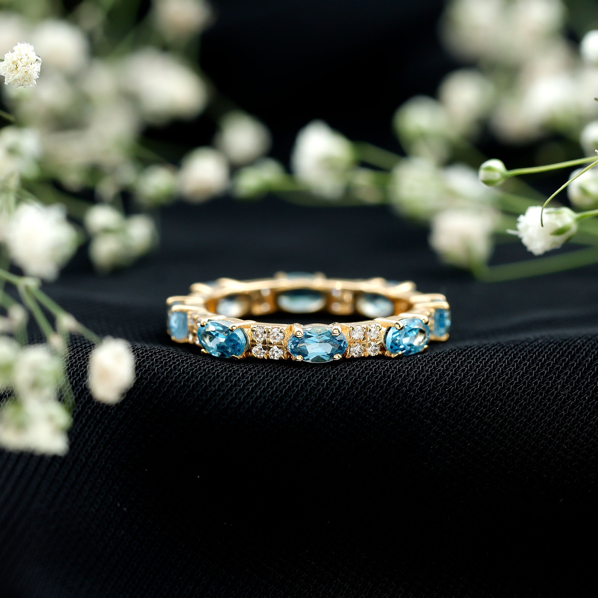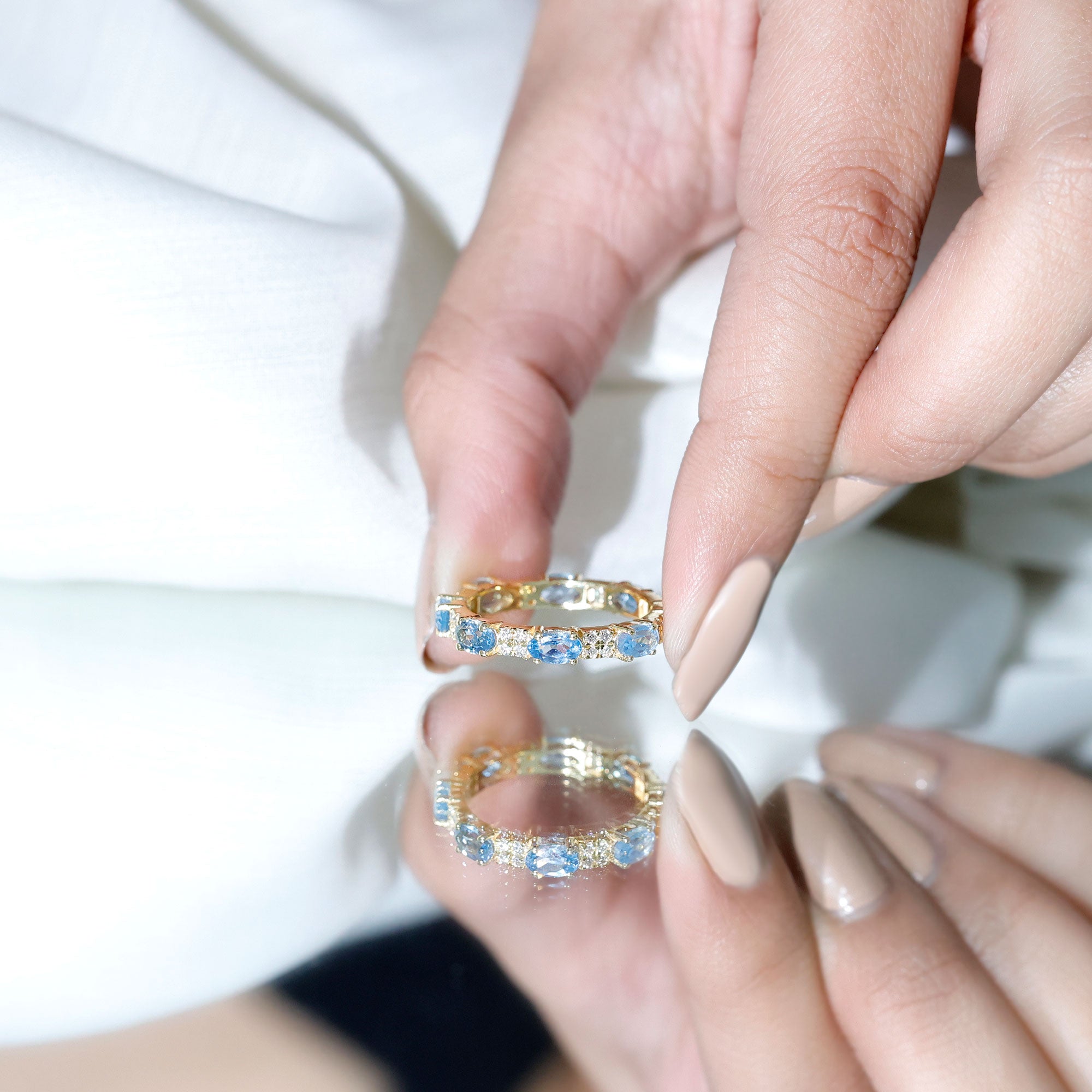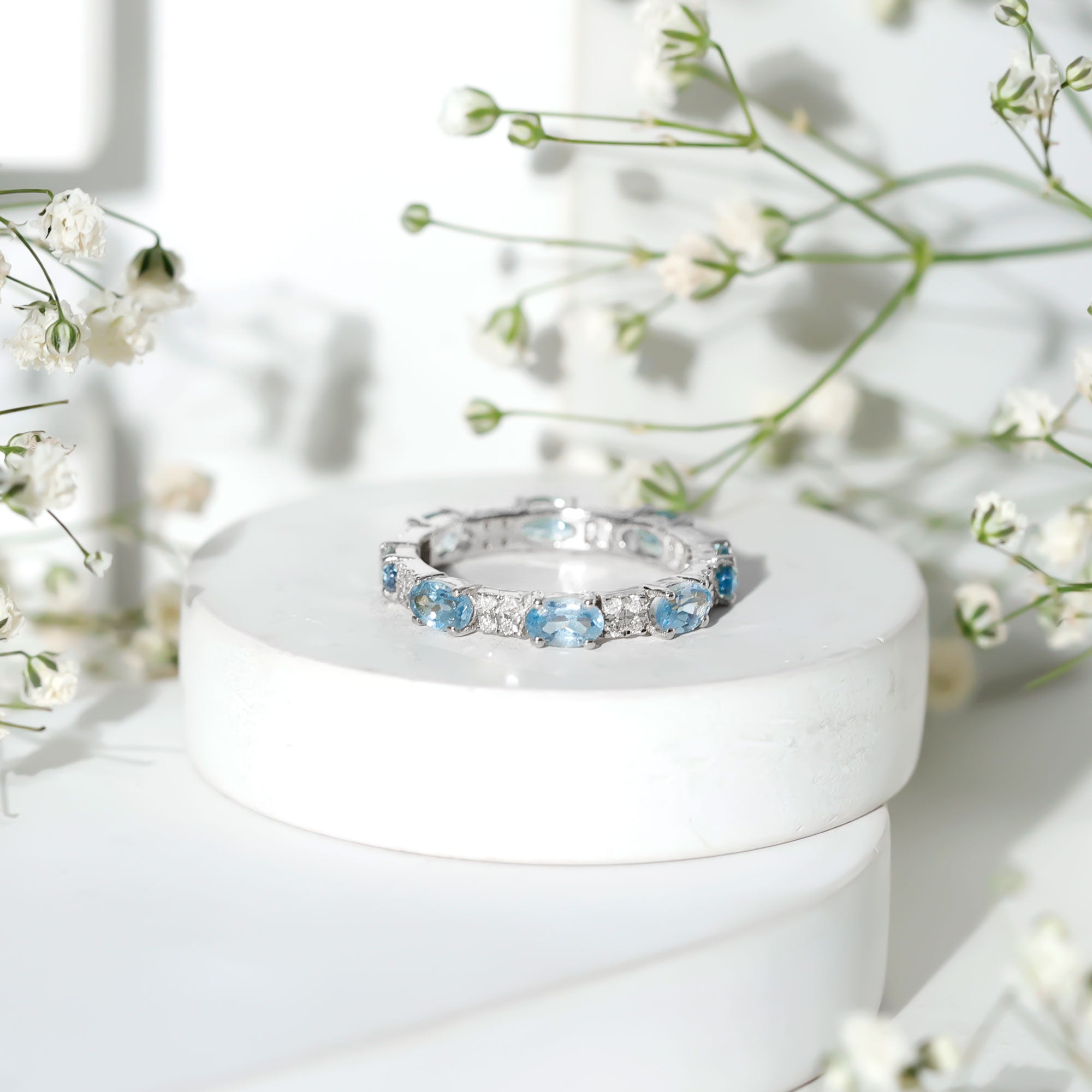Experience timeless charm with this exquisitely crafted Aquamarine Eternity Ring. Made to captivate from every angle, the band features a continuous circle of oval cut aquamarine gemstones, elegantly set in an east west style. Alternating between the aquamarines are meticulously set round cut diamonds, chosen for their exceptional sparkle and clarity. The harmonious contrast between the tranquil blue gemstones and the radiant diamonds results in a perfect beauty that is both sophisticated and visually striking. Each stone is carefully secured in prong setting to ensure lasting beauty and durability. As a full eternity design, this Aquamarine Stackable Ring symbolizes infinite love, commitment, and continuity, making it an ideal choice for anniversaries, milestones, or meaningful personal celebrations. Its simple design also makes it perfectly stackable, allowing it to be worn alone for a minimal look or paired seamlessly with other bands for a layered look. Crafted with genuine gemstones, this Aquamarine and Diamond Wedding Band is accompanied by a certificate of authenticity, providing assurance of quality and value. Suitable for both everyday wear and special occasions, it embodies versatility while maintaining a luxurious presence.