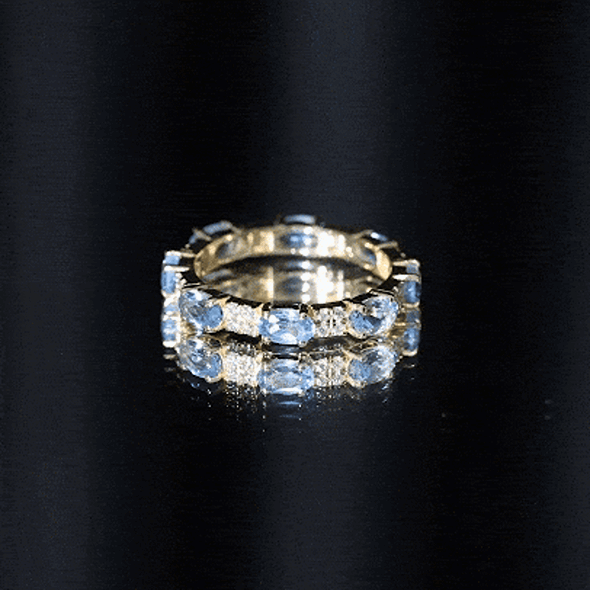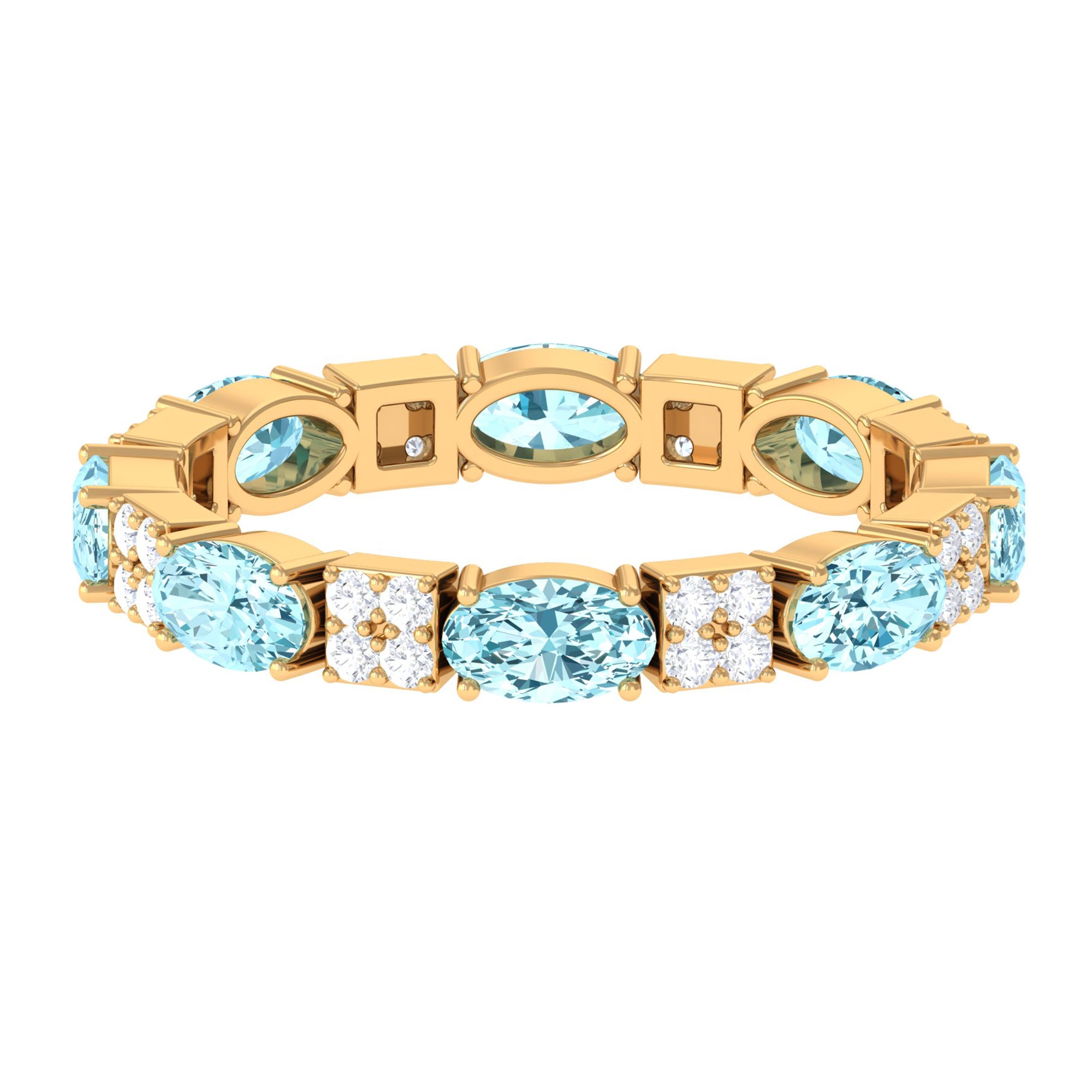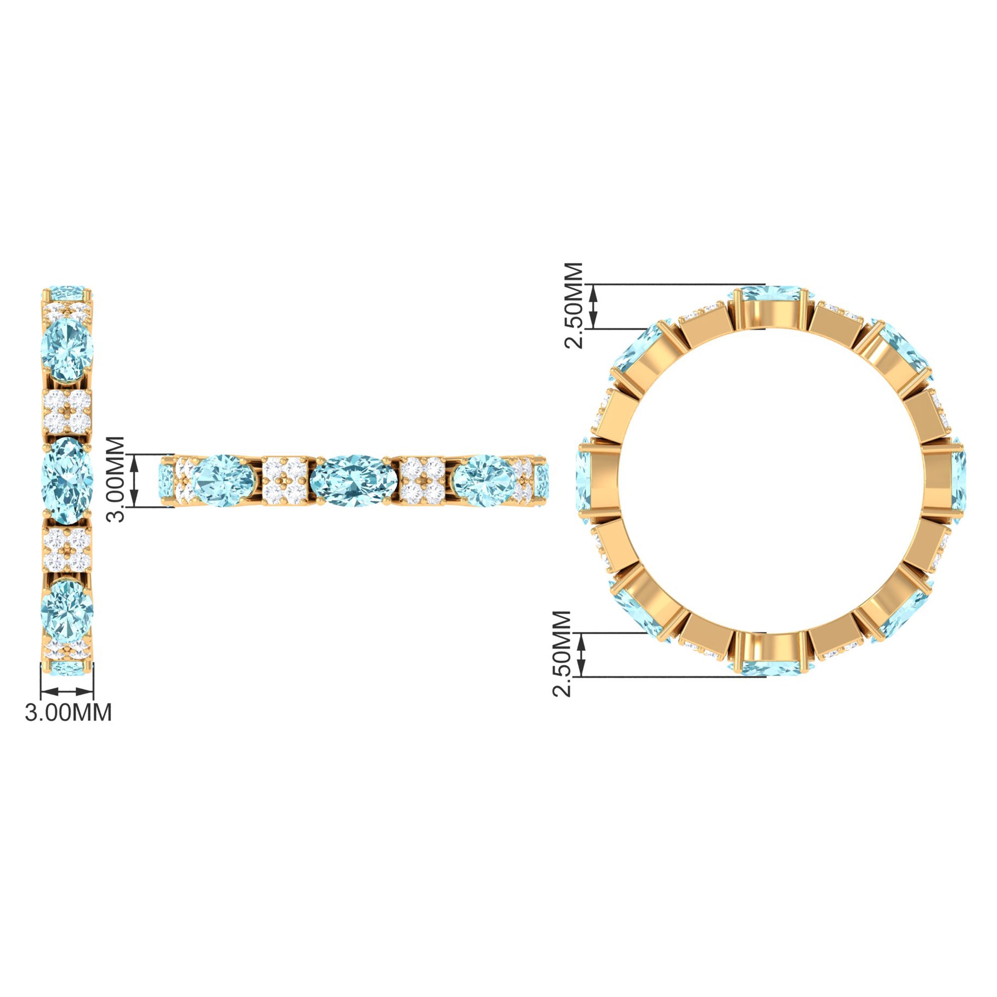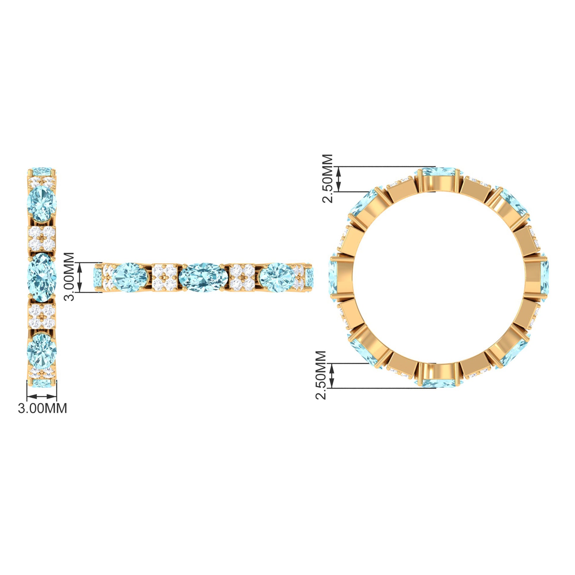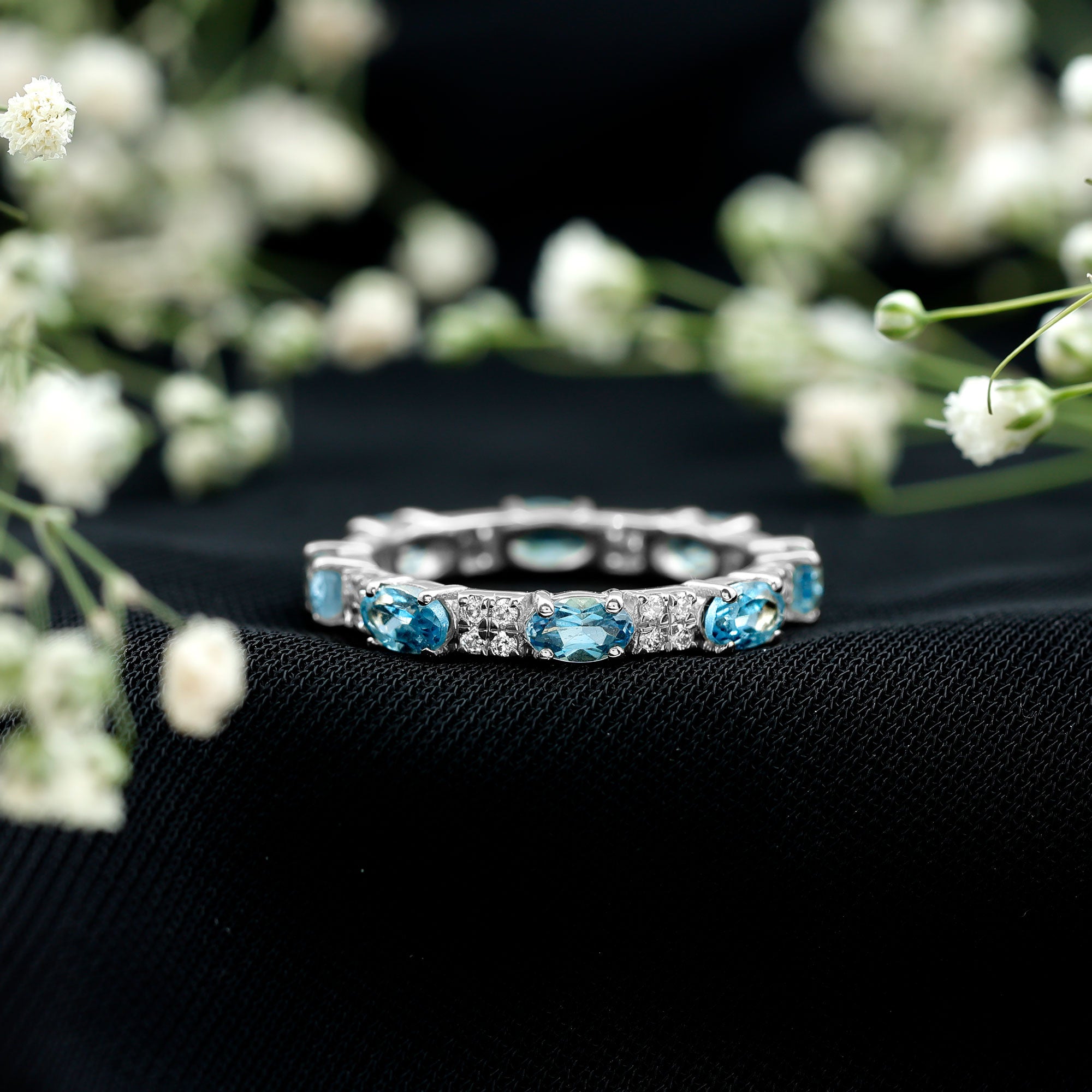 Experience timeless charm with this exquisitely crafted Aquamarine Eternity Ring. Made to captivate from every angle, the band features a continuous circle of oval cut aquamarine gemstones, elegantly set in an east west style. Alternating between the aquamarines are meticulously set round cut diamonds, chosen for their exceptional sparkle and clarity. The harmonious contrast between the tranquil blue gemstones and the radiant diamonds results in a perfect beauty that is both sophisticated and visually striking. Each stone is carefully secured in prong setting to ensure lasting beauty and durability. As a full eternity design, this Aquamarine Stackable Ring symbolizes infinite love, commitment, and continuity, making it an ideal choice for anniversaries, milestones, or meaningful personal celebrations. Its simple design also makes it perfectly stackable, allowing it to be worn alone for a minimal look or paired seamlessly with other bands for a layered look. Crafted with genuine gemstones, this Aquamarine and Diamond Wedding Band is accompanied by a certificate of authenticity, providing assurance of quality and value. Suitable for both everyday wear and special occasions, it embodies versatility while maintaining a luxurious presence.