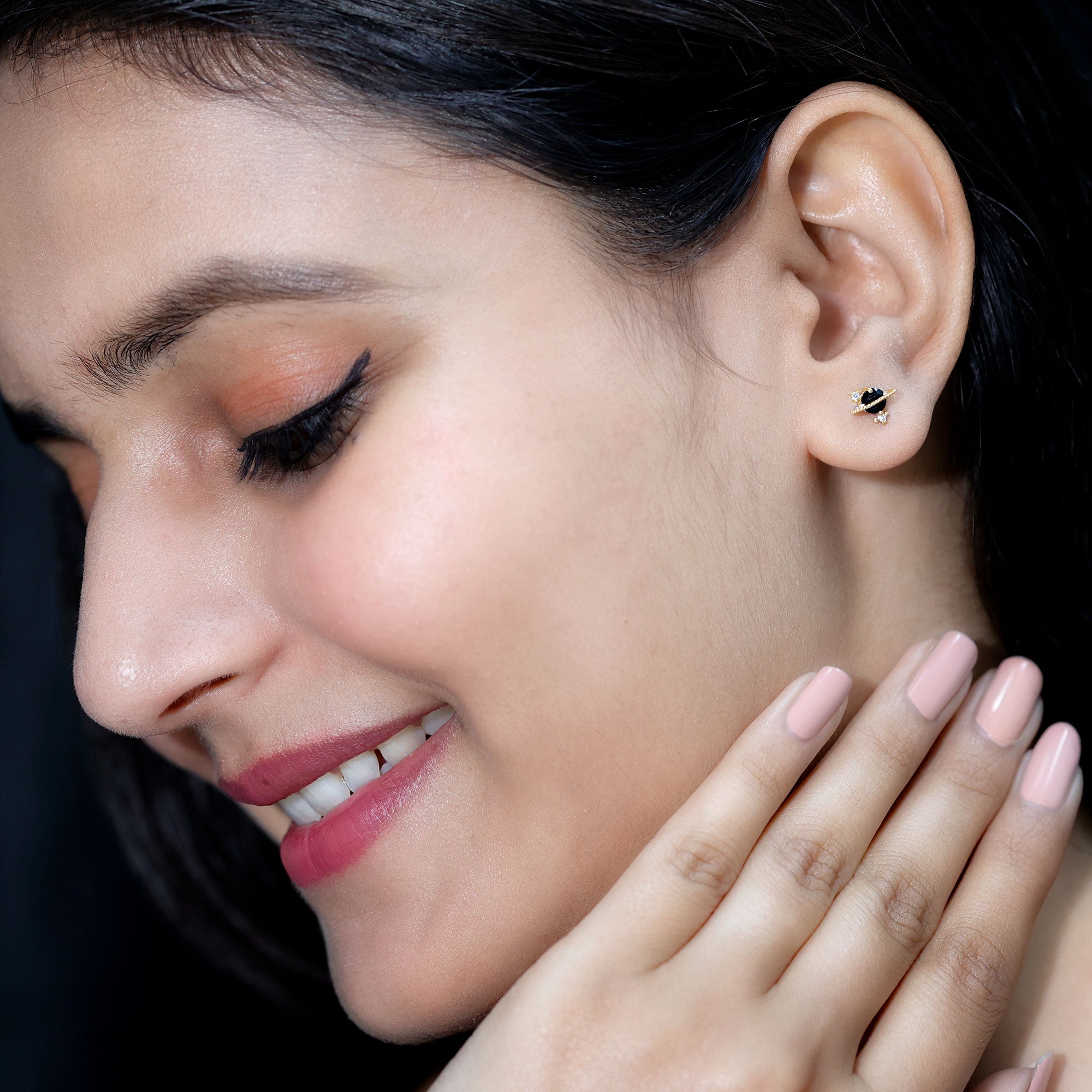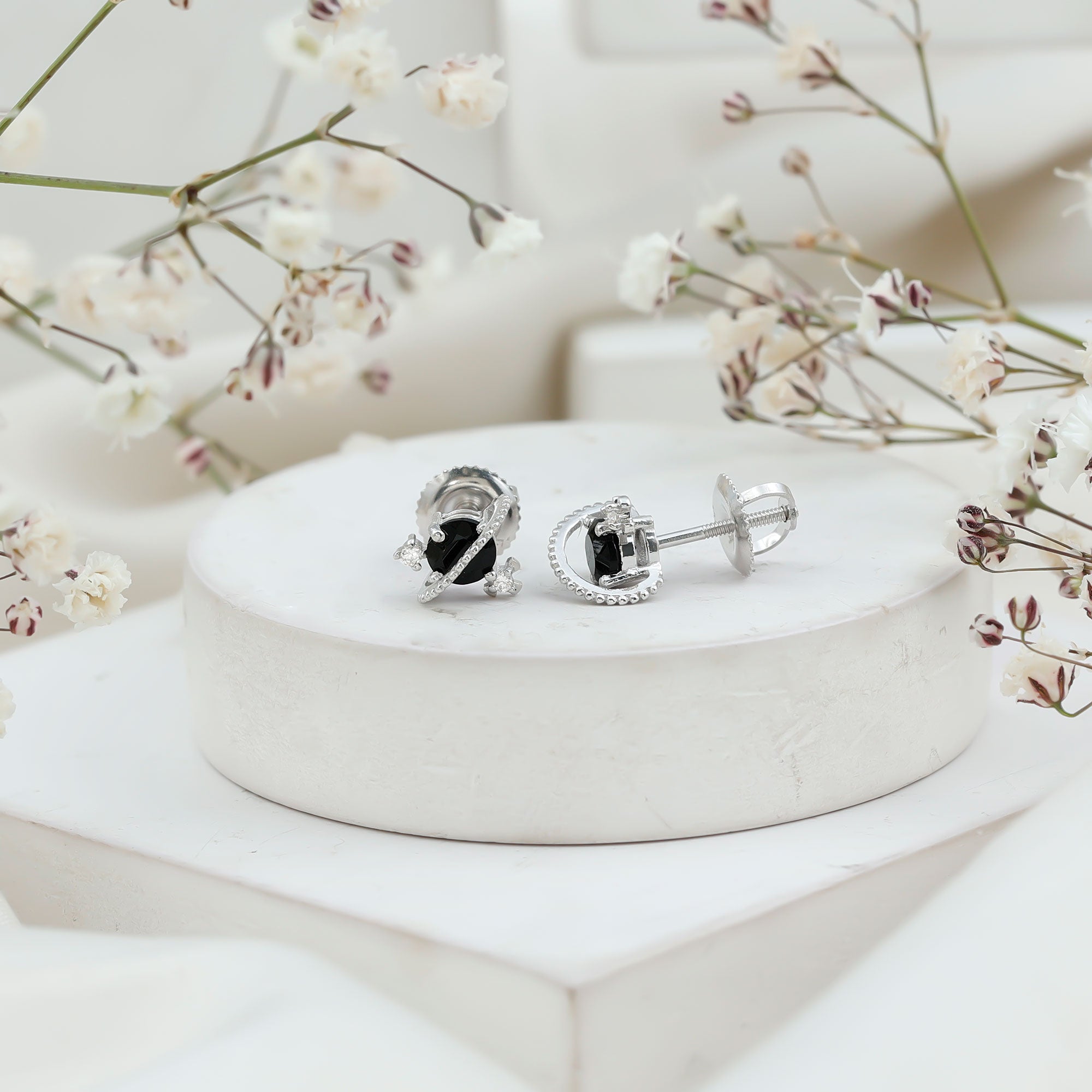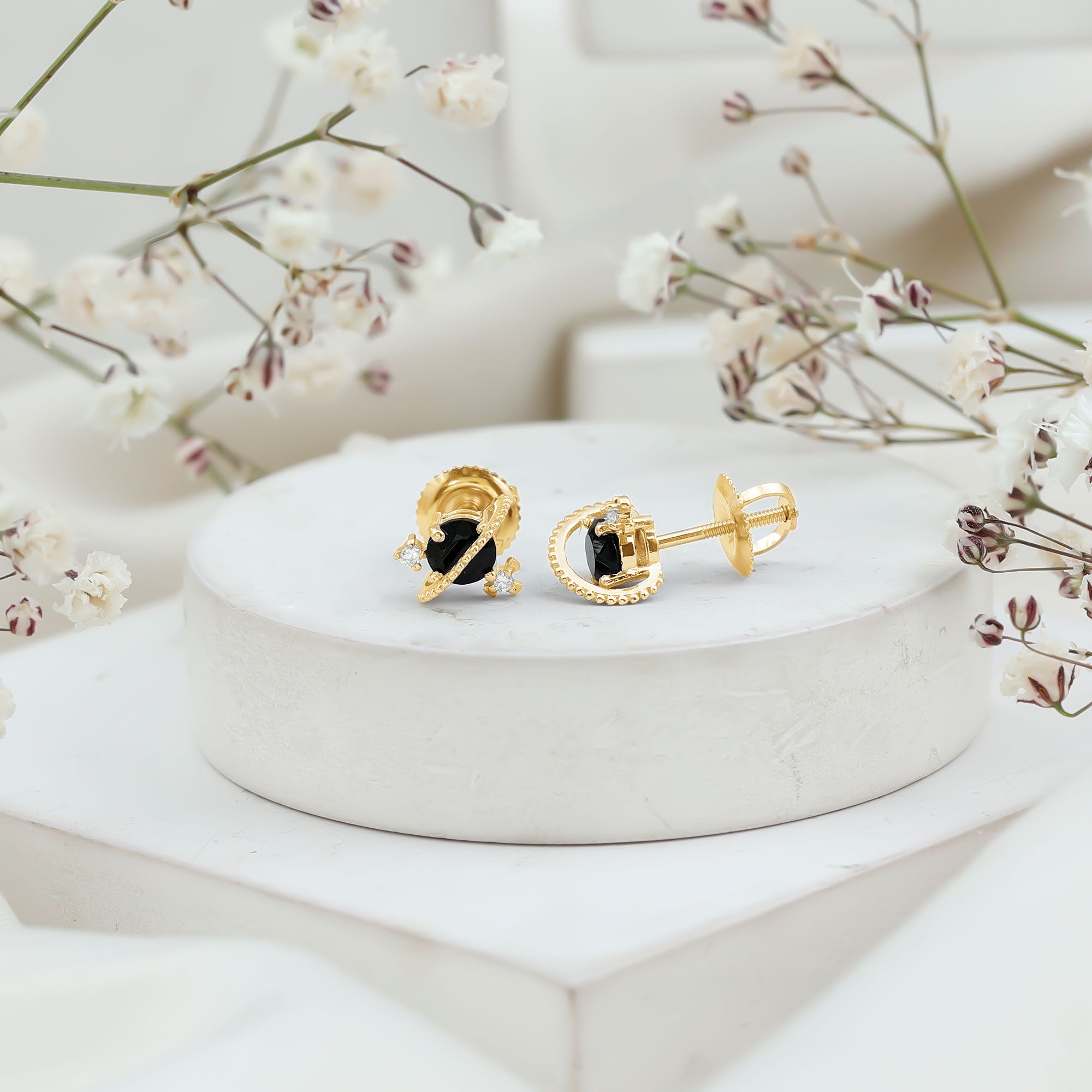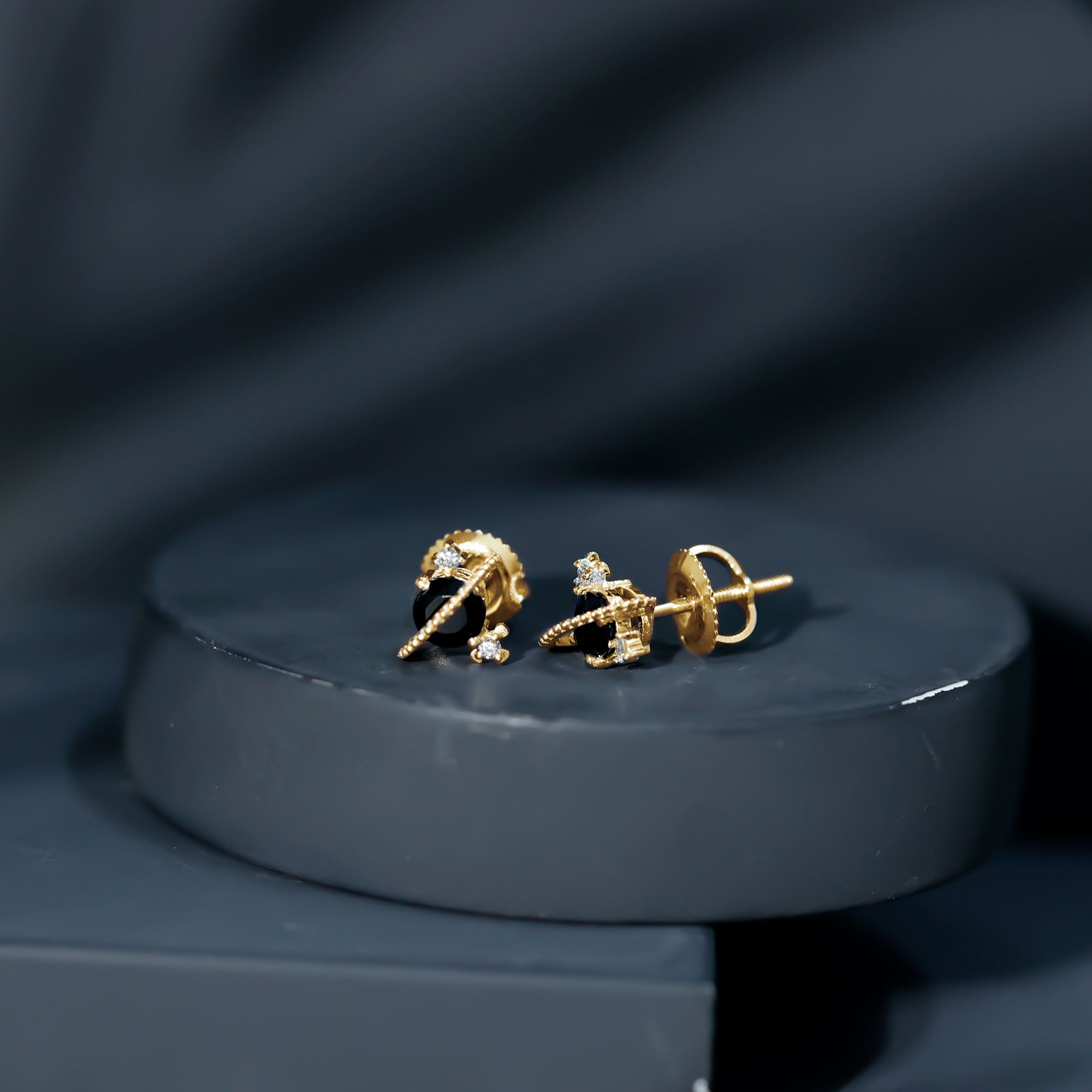 Style gets a cool upgrade with these Contemporary Stud Earrings that are made to stand out in a subtle but confident way. Curated for everyday wear with a modern twist, they are a great pick if you like keeping things minimal but still a bit different. The design features a 4 MM round shape black onyx, paired with two small diamonds that add just the right amount of sparkle. The Black Onyx Stud Earrings are decorated with fine beaded detailing, giving them extra texture and a slightly edgy feel that sets them apart from basic studs. They are compact and lightweight, making them super easy to wear all day, whether you are heading to work or stepping out for the evening. The overall look is simple but has enough detail to make people notice. Screw-back closures keep these Black Onyx and Diamond Earrings secure, so you can wear them confidently throughout your day. Available in multiple metal colors and types, you can choose what suits your personal style best. These Unique Stud Earrings come packed in a jewelry box, making them a nice option for gifting too. A great addition to your collection if you want something unique that still fits into your daily routine.