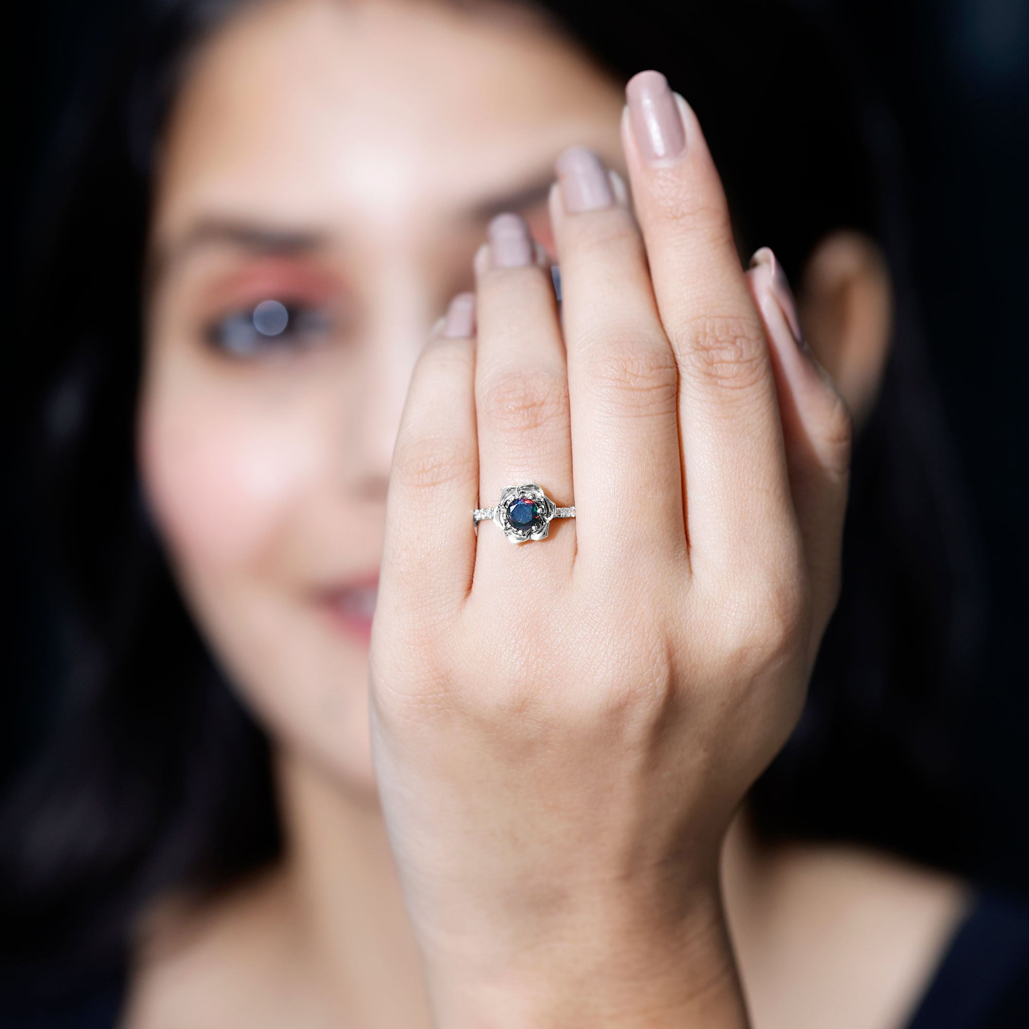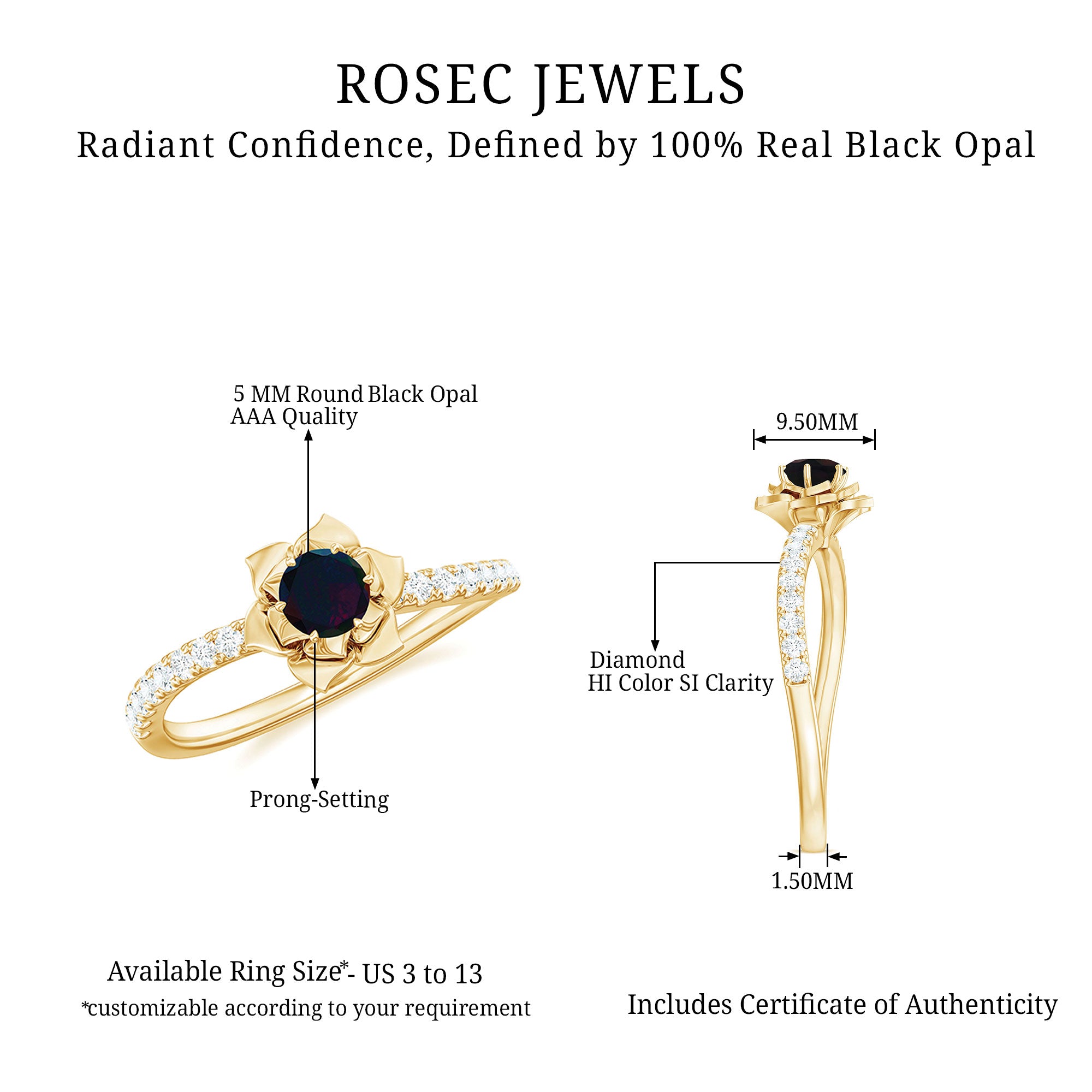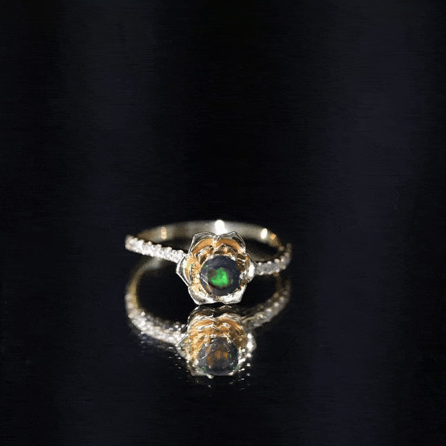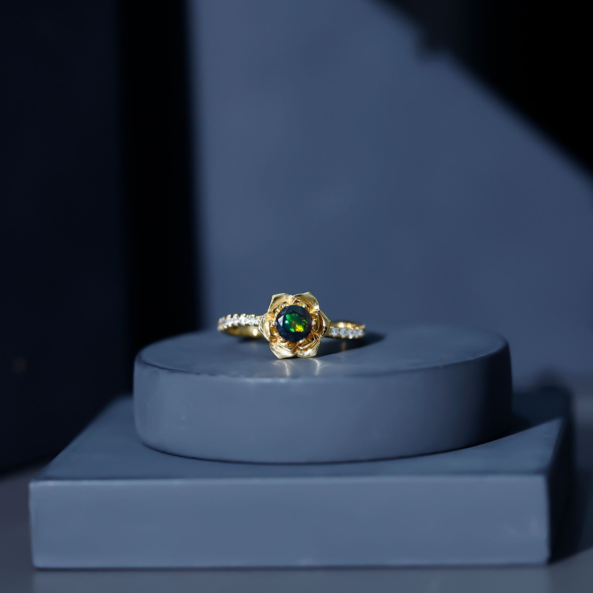 The Perfect Combination of Black Opal and Diamond in this Rose Flower Ring is mesmerizing. The Round Natural Black Opal is set in Centre of a Gold Petals of Rose Flower in the curved shank. Get this Floral Inspired Engagement Ring for your Blooming Lady Love, this Black Opal and Diamond Engagement Ring is a stunning jewelry, which she will cherish her whole life.
