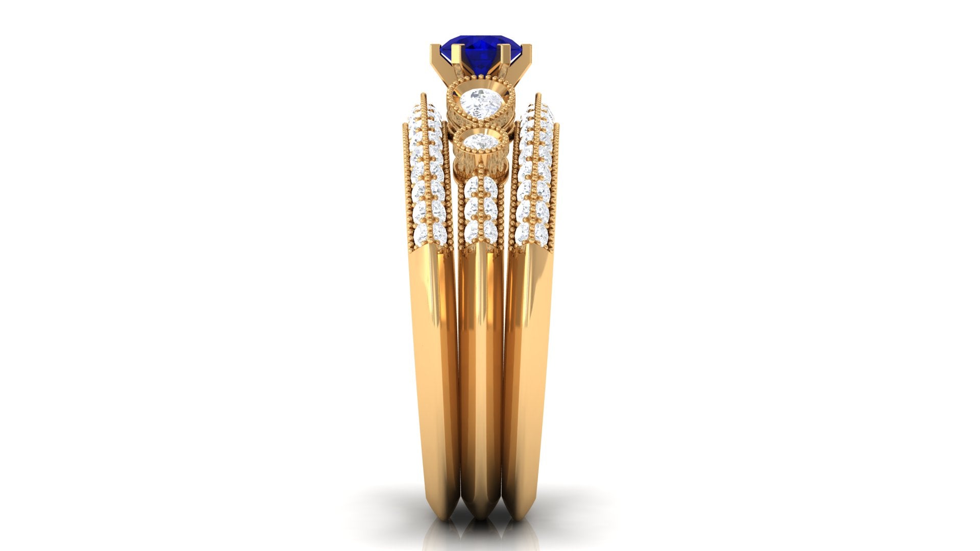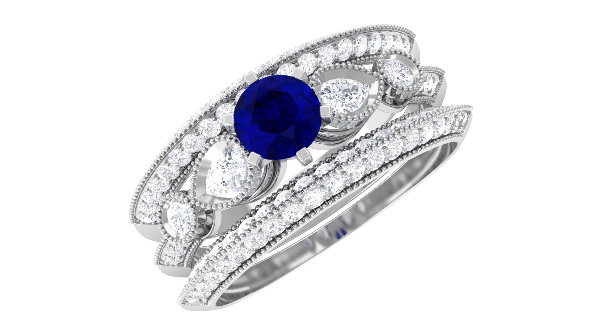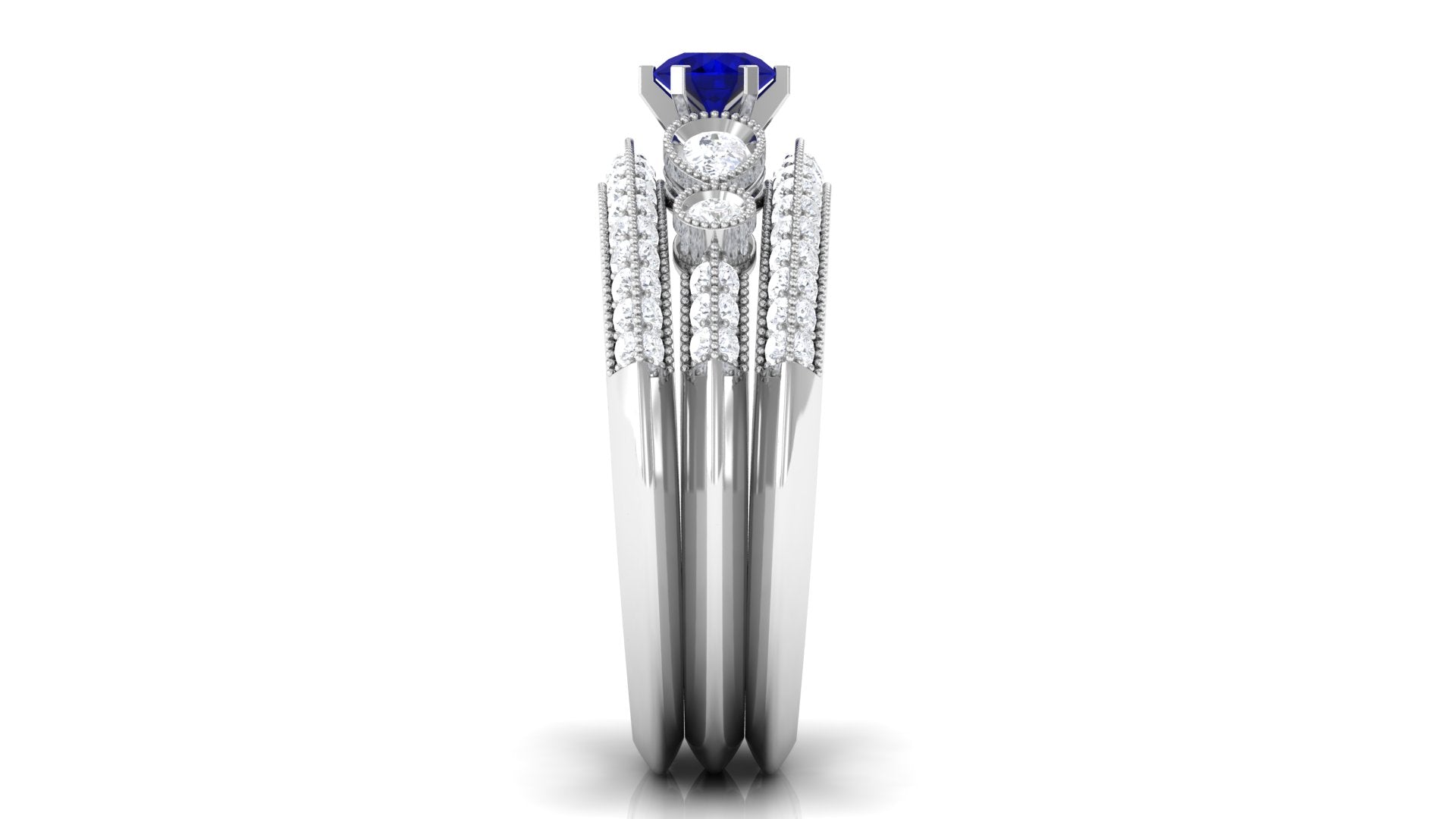 Real Blue Sapphire and Diamond Bridal Ring Set with Beaded Details