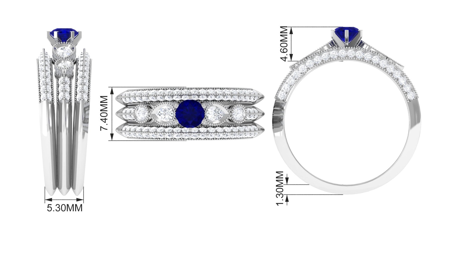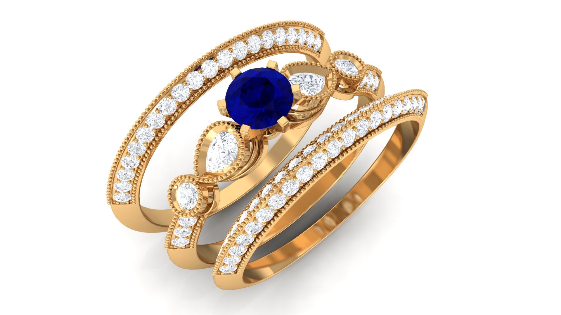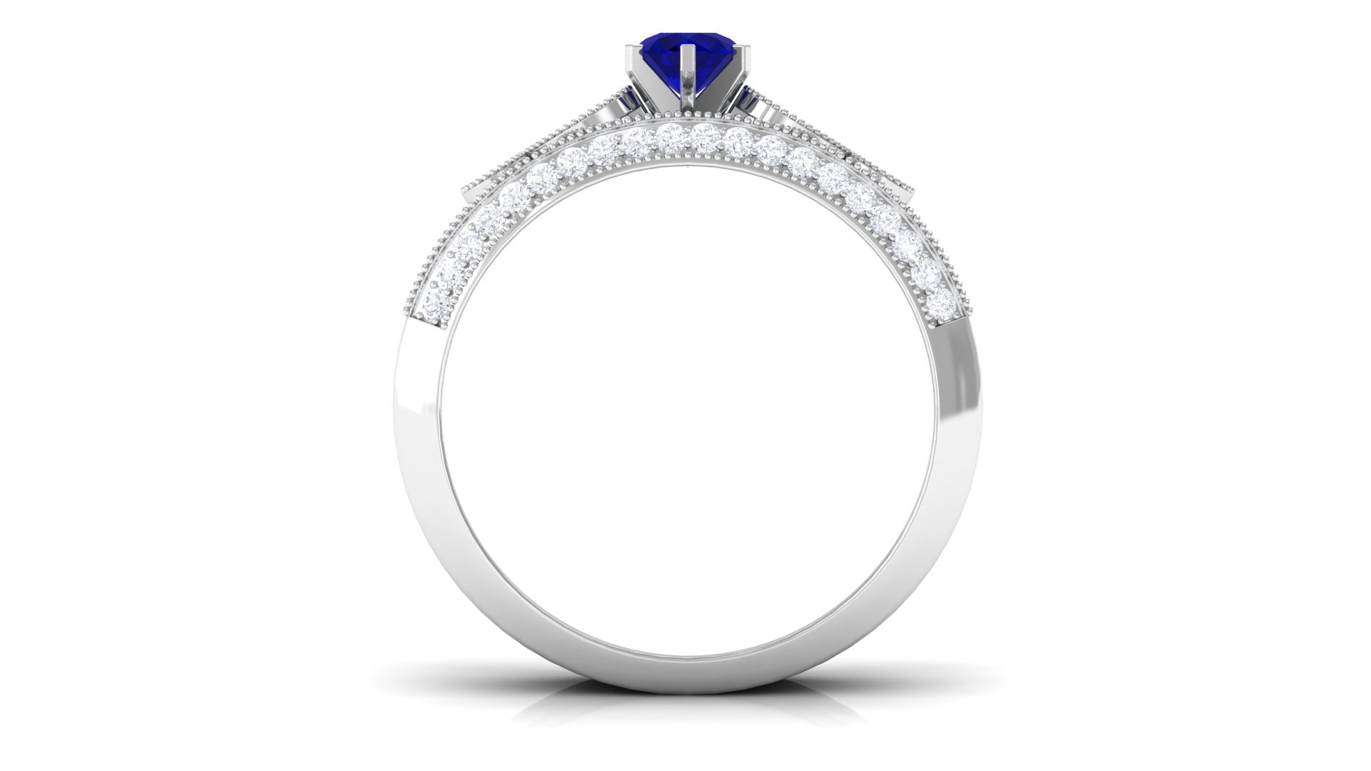 Real Blue Sapphire and Diamond Bridal Ring Set with Beaded Details