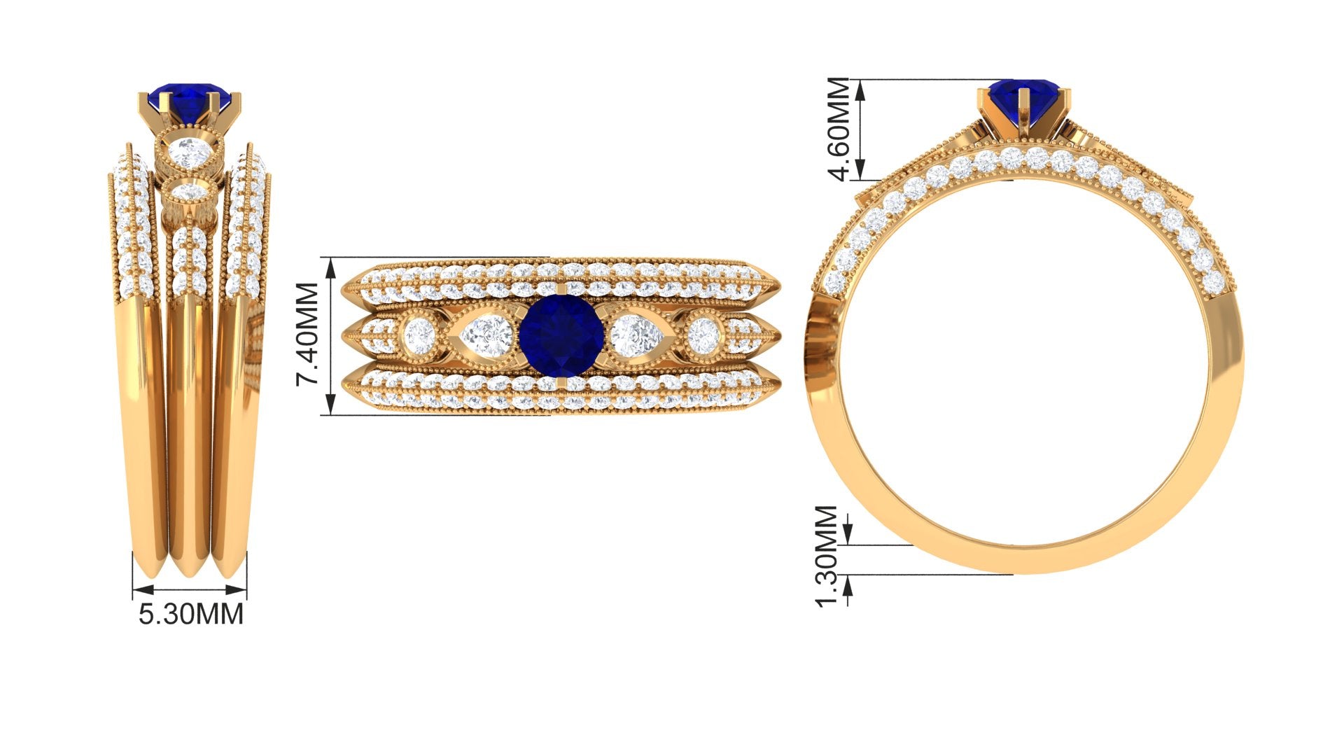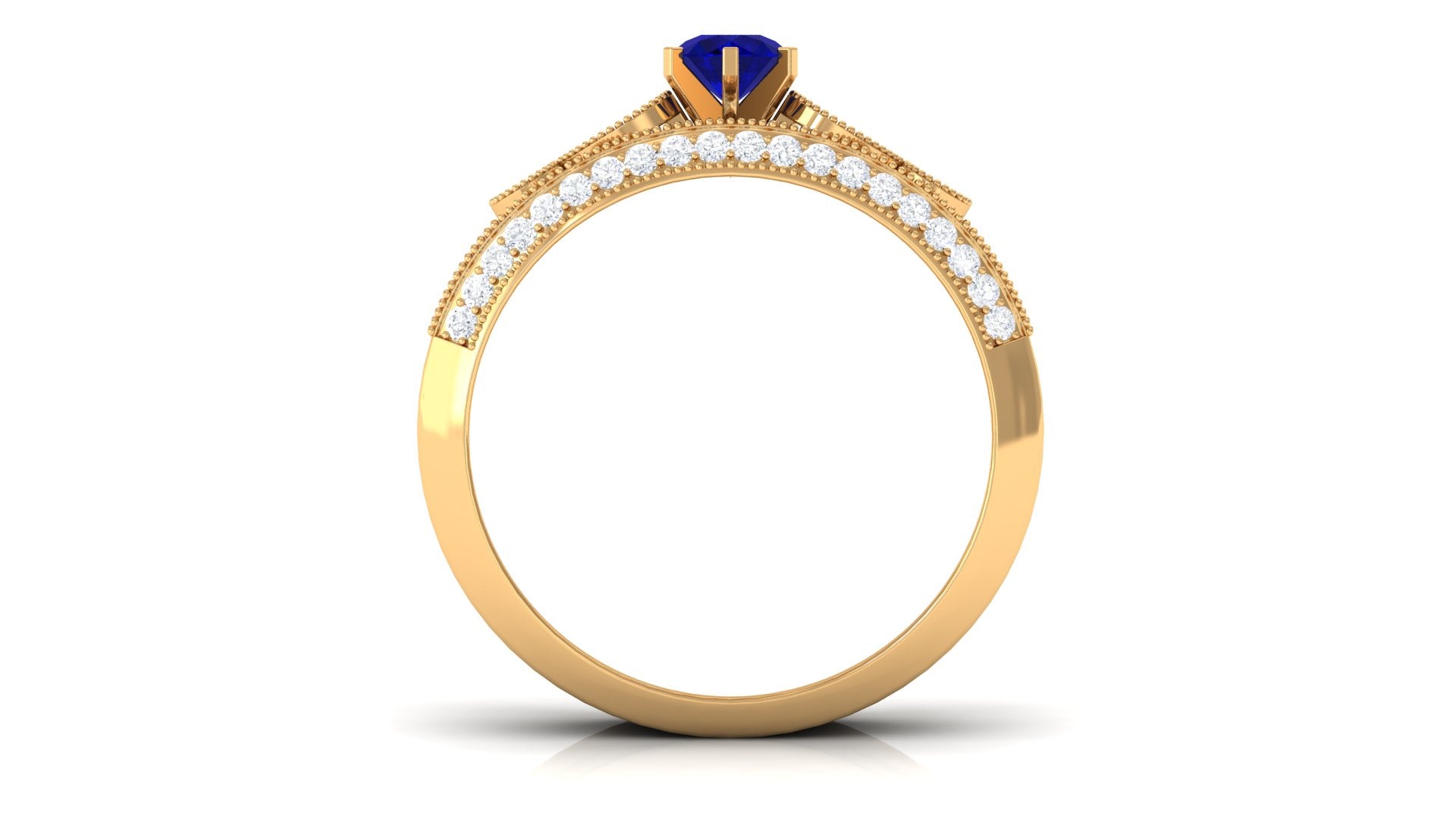 This beautiful Bridal Ring Set is adorned with Blue Sapphire and Diamond to make for a gorgeous choice for special occasions. Milgrain beaded details on the Band give a vintage appeal to this Wedding Ring Set.