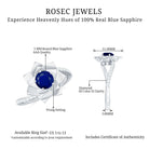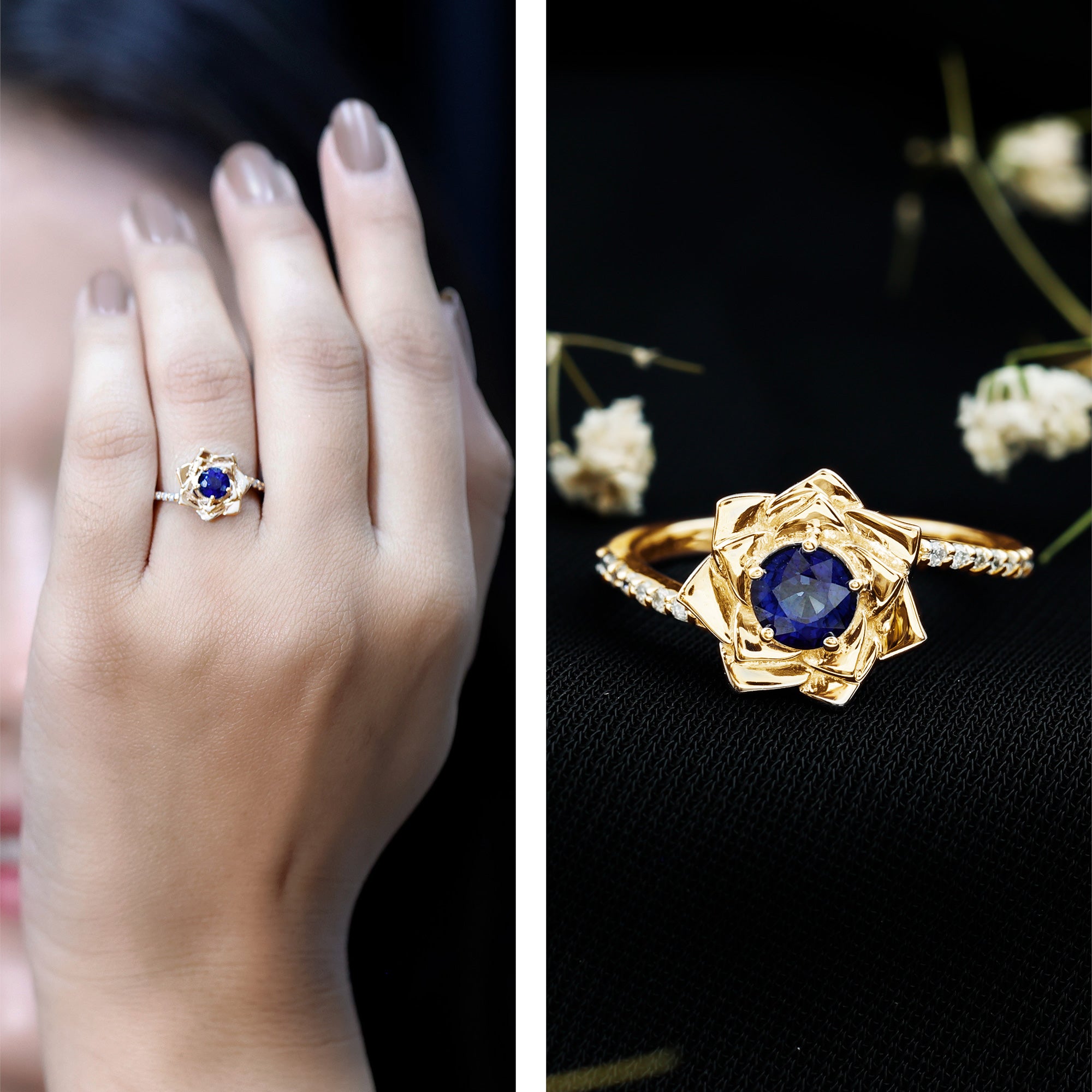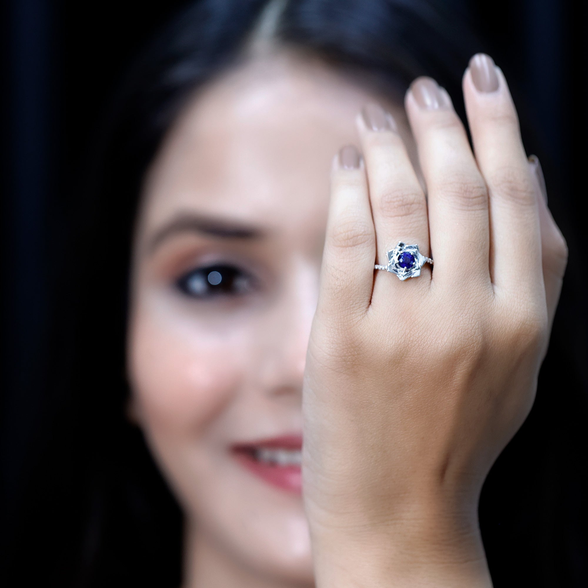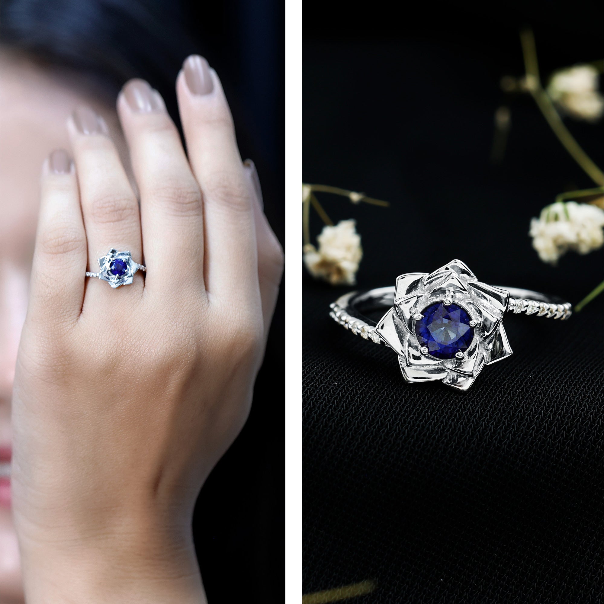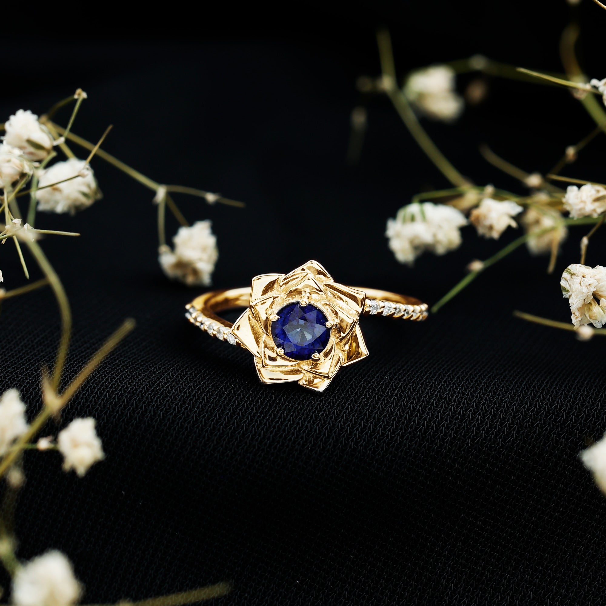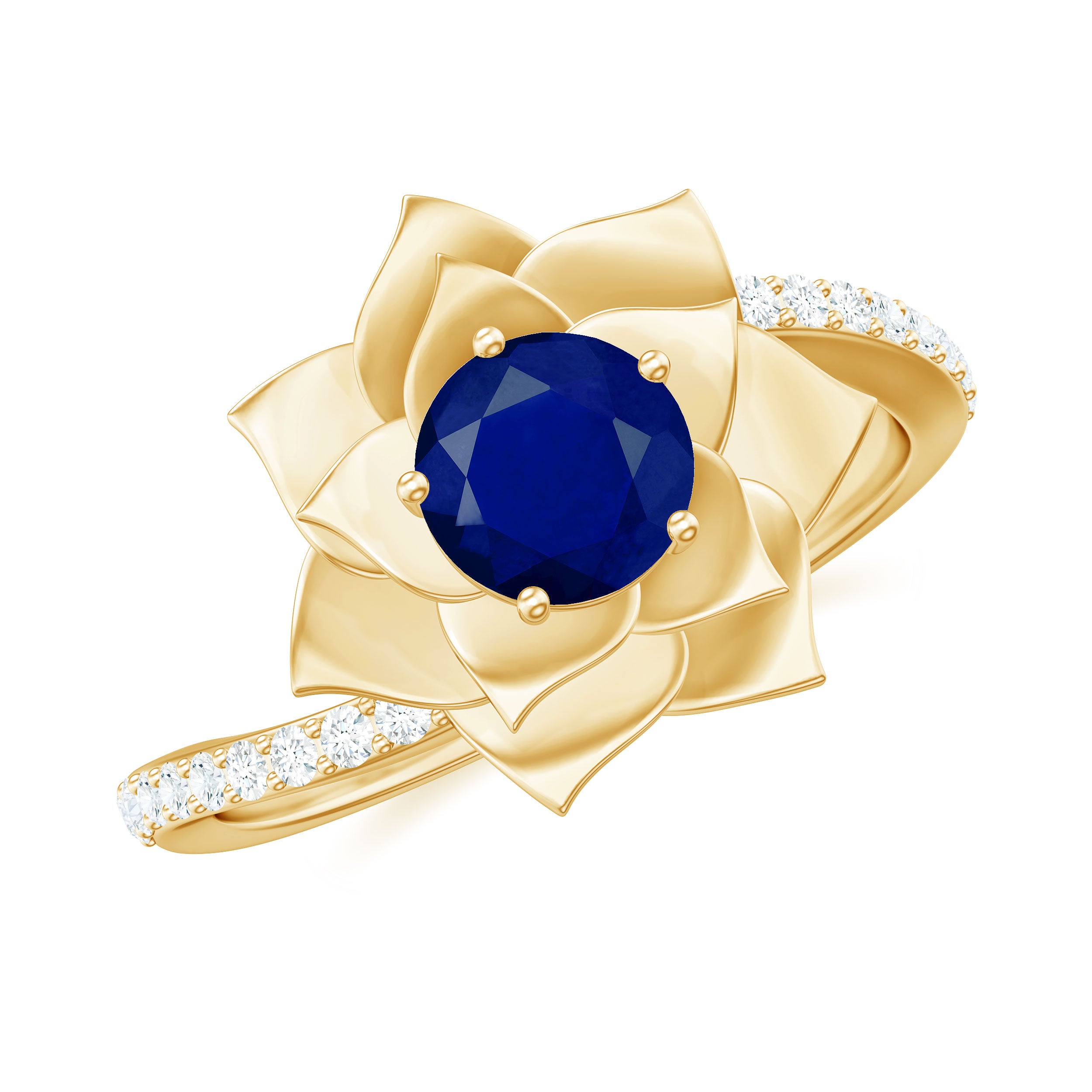 This Floral Engagement Ring is both glamorous and captivating. It showcases a Round Shape Blue Sapphire set in a Prong Setting, accented by sparkling Diamond Side Stones.