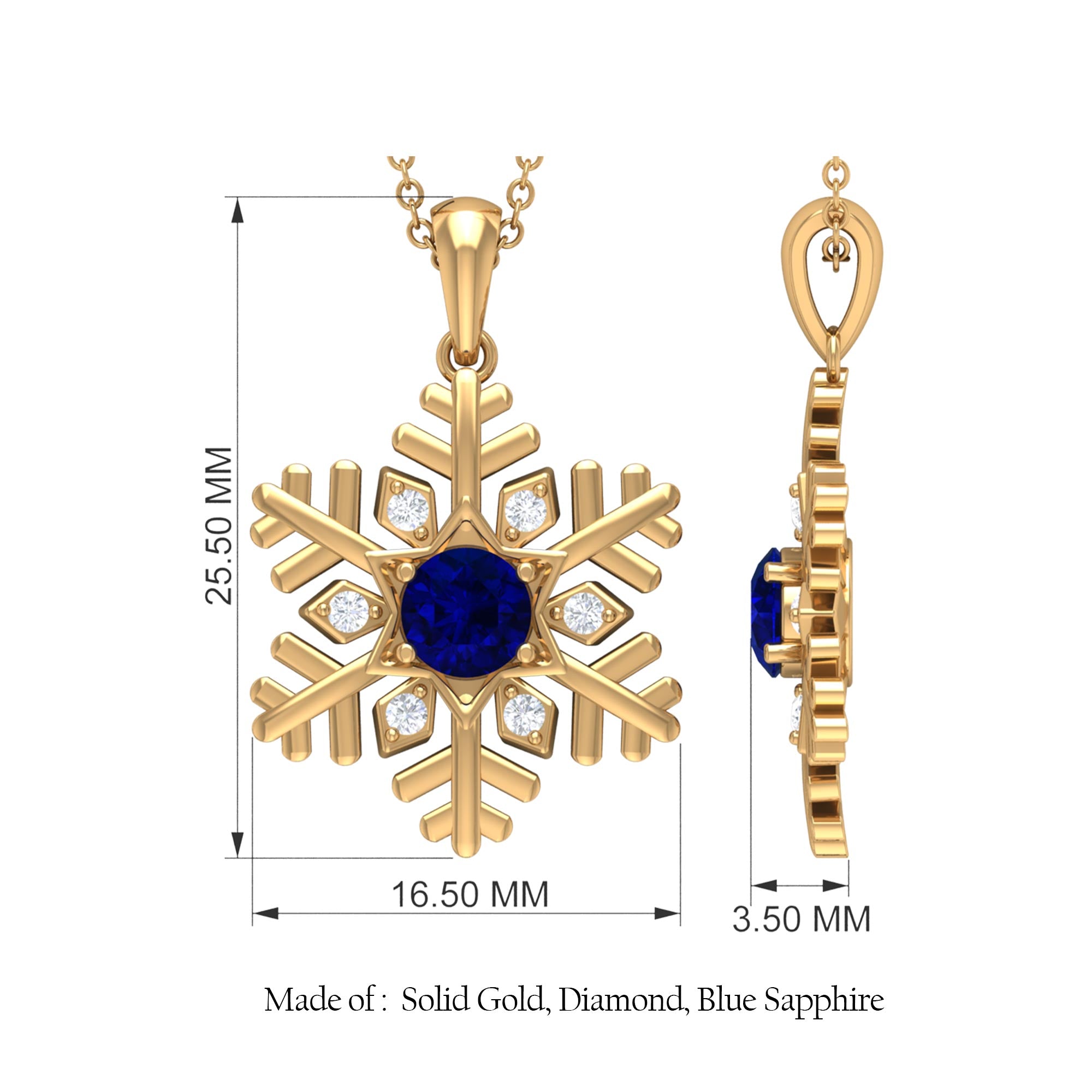 Make your special day even more enchanting with this stunning Snowflake Pendant, adorned with Round Shape Blue Sapphire and Round Shape Diamond stones in a delicate prong setting. The Blue Sapphire Snowflake Necklace is crafted in various types of Metal, adding a luxurious touch to your bridal look. This beautiful piece of jewelry is sure to leave a lasting impression.