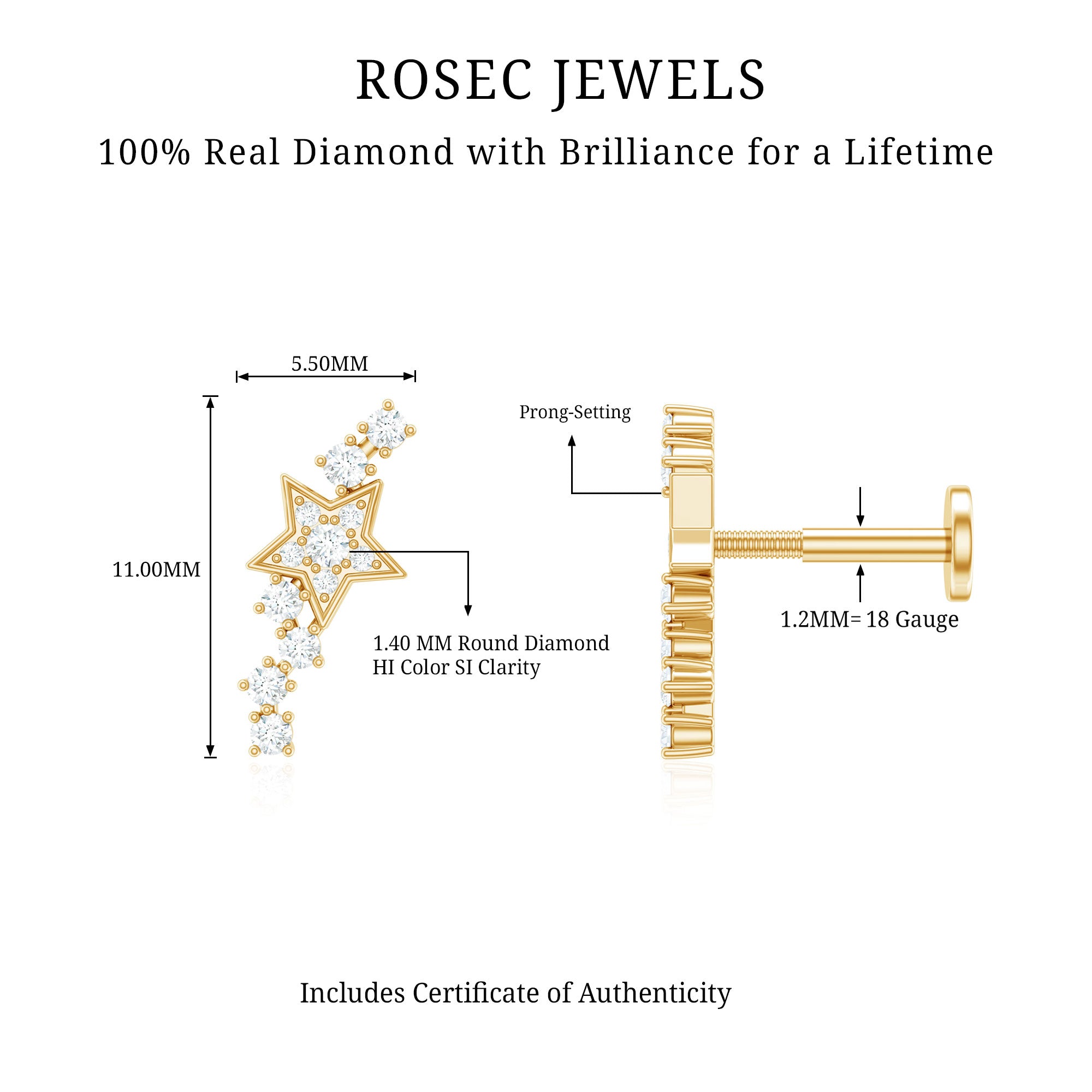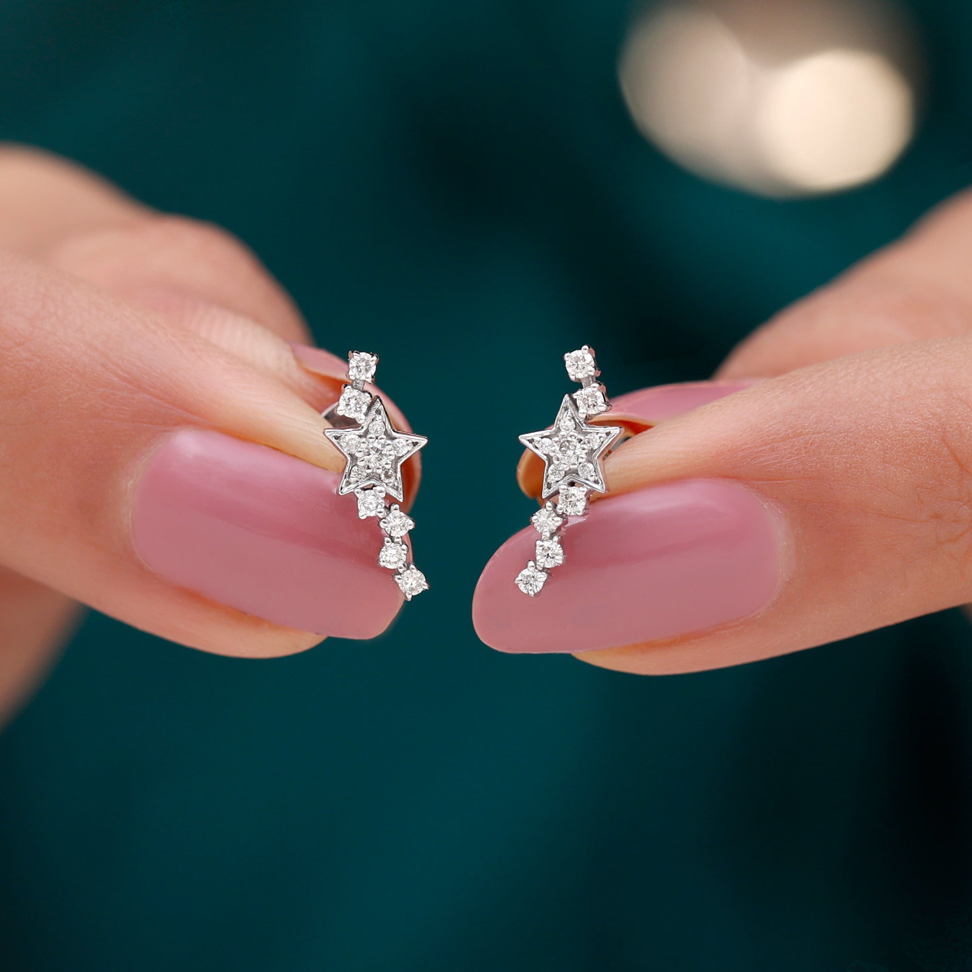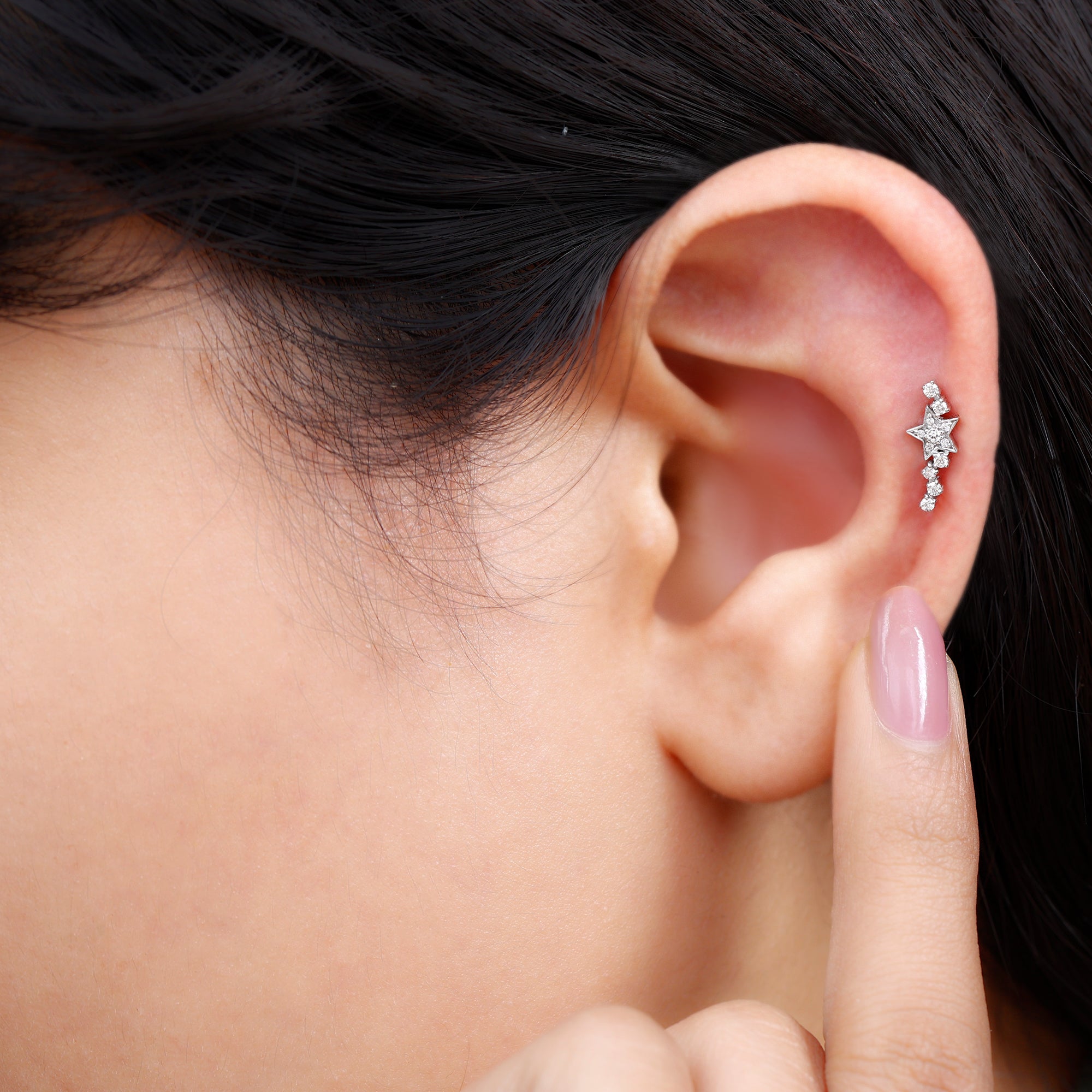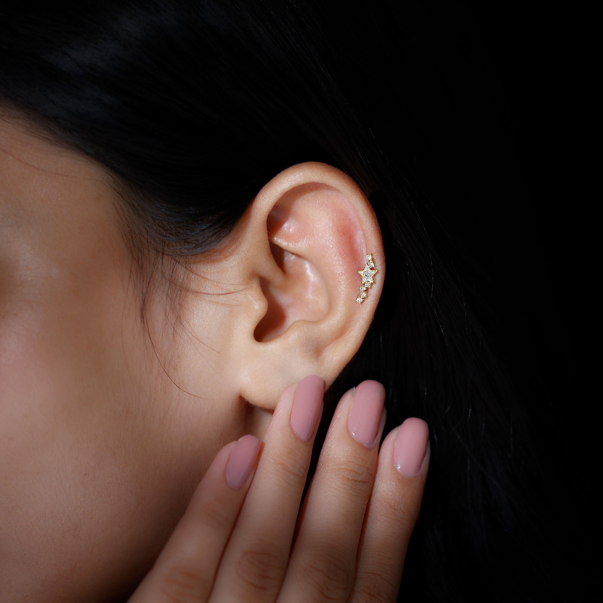 Enhance your fashion and embrace the celestial charm with this enchanting Diamond Star Earring. The Crawler Earring showcases tiny, shimmering round diamonds arranged in a star design, embodying the wonder of the night sky. This exquisite celestial accessory is perfect for Helix Piercing, but it can also embellish other ear places, such as Cartilage or Upper Lobe. Meticulously crafted for comfort and safety for all-day wear, and featuring a flat back, this Star Stud Earring makes a wonderful gift to commemorate special occasions and milestones. The lovely design of this Helix Earring holds significant symbolism while embodying the essence of light. The star motif carries profound meaning and shines like a star. As a symbol of positivity and happiness, it also acts as a daily reminder of hope, adding a hint of brilliance to your outfit. Striking and elegant, this Diamond Ear Piercing Jewelry pays homage to beauty, showcasing captivating sophistication by infusing a touch of whimsy and grace into your look, reflecting light with every movement.