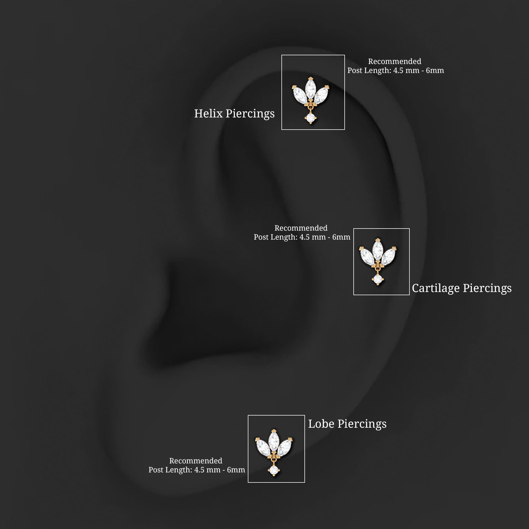 Soft floral charm meets sparkling elegance in this beautifully crafted Diamond Lotus Earring. Designed to add a gentle glow to your everyday style, it captures the peaceful beauty of a blooming lotus in a way that feels both modern and meaningful. At the center of the piece lies a graceful lotus motif made from marquise cut real diamonds that shine with HI color and SI clarity. Just below it, a tiny round diamond drop adds a little movement and sparkle, giving the Flower Helix Earring a airy look every time you wear it. Made for multiple piercings, it fits comfortably on the helix, cartilage, or upper lobe, letting you style it however you like, wear it solo for a dainty look or pair it with other earrings for a stacked style. The flat back closure keeps it secure and comfortable all day long, so you can enjoy its shine without any discomfort. This Diamond Cartilage Earring is crafted with fine attention to detail, making it a lovely addition to both simple and dressy outfits. Whether you want something meaningful to wear every day or a special piece that adds subtle elegance to your look, this lotus piercing brings a gentle sparkle that feels soothing, stylish, and easy to love.