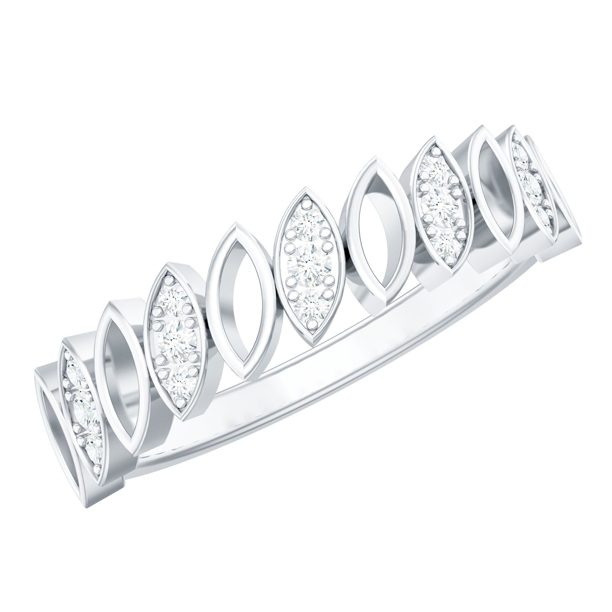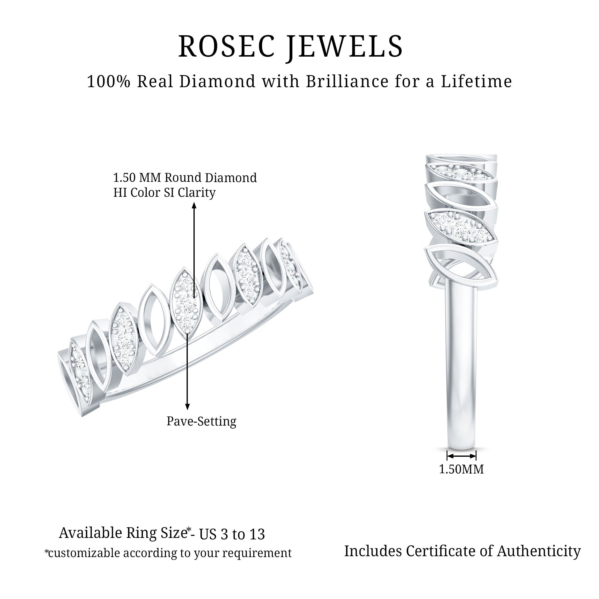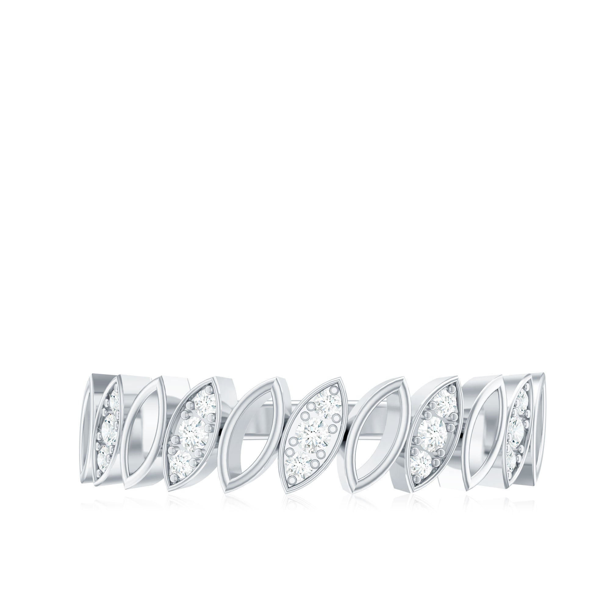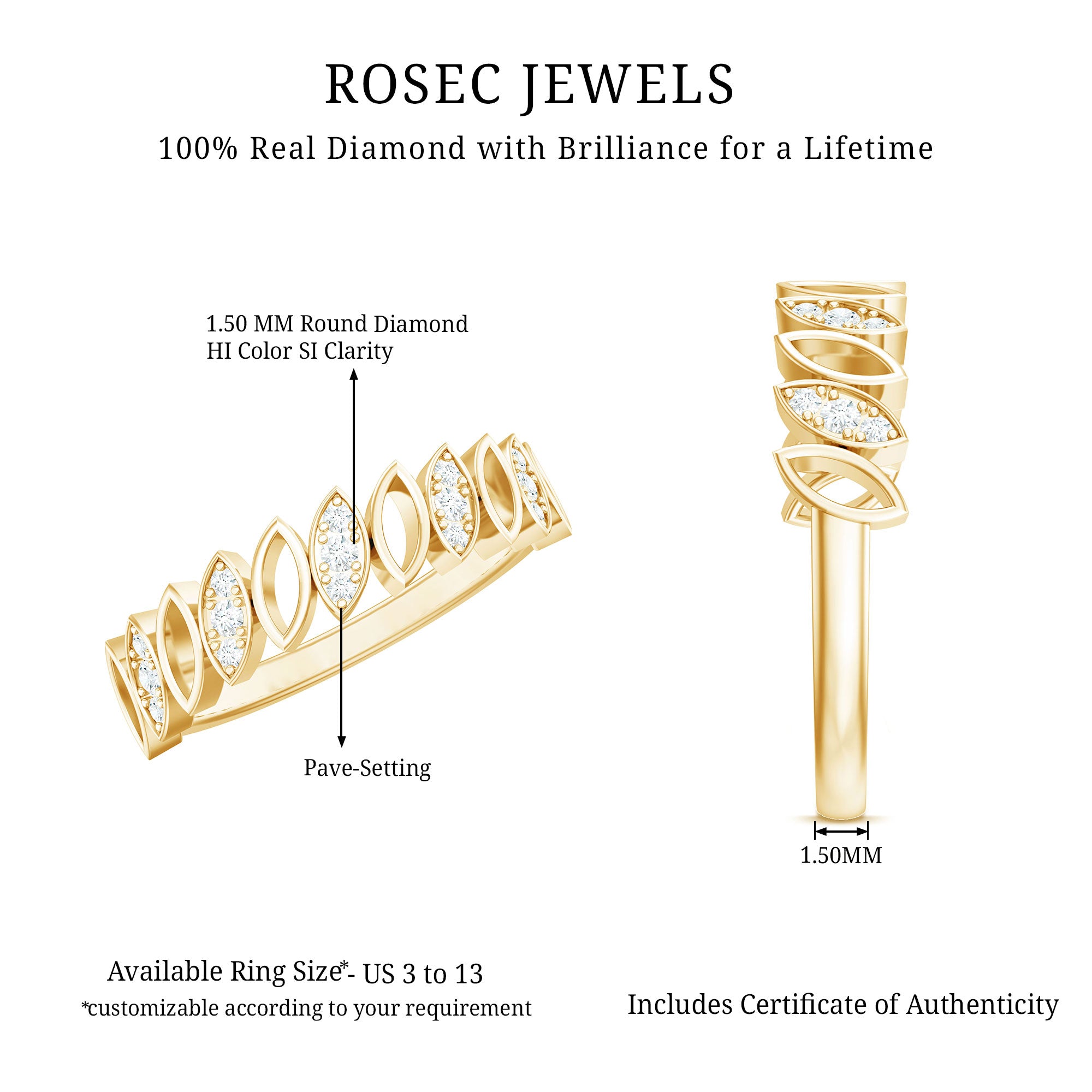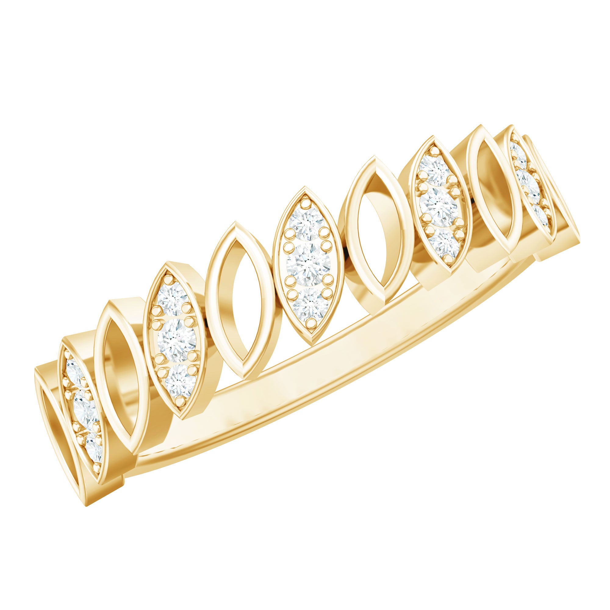 Surprise her on her special day with this elegant marquise-shaped half eternity band. The band is crafted with gold and features round-shaped diamonds set in a pave setting. The unique marquise shape design adds a touch of opulence to this pave set half eternity band, making it a perfect way to commemorate a special moment or occasion.