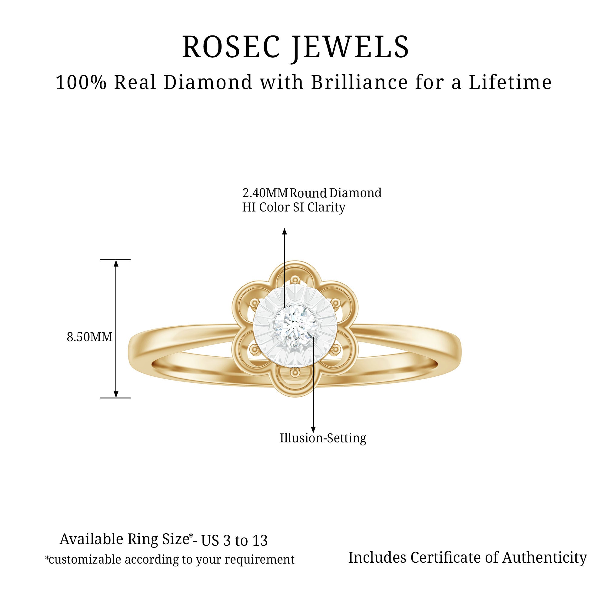 Add a touch of elegance to your look with this beautifully crafted Miracle Plate Diamond Solitaire Ring. The ring features a sparkling Round Cut Diamond in the center, surrounded by a Miracle Plate in an illusion setting. Made of solid gold, this floral design ring is perfect for your special someone.