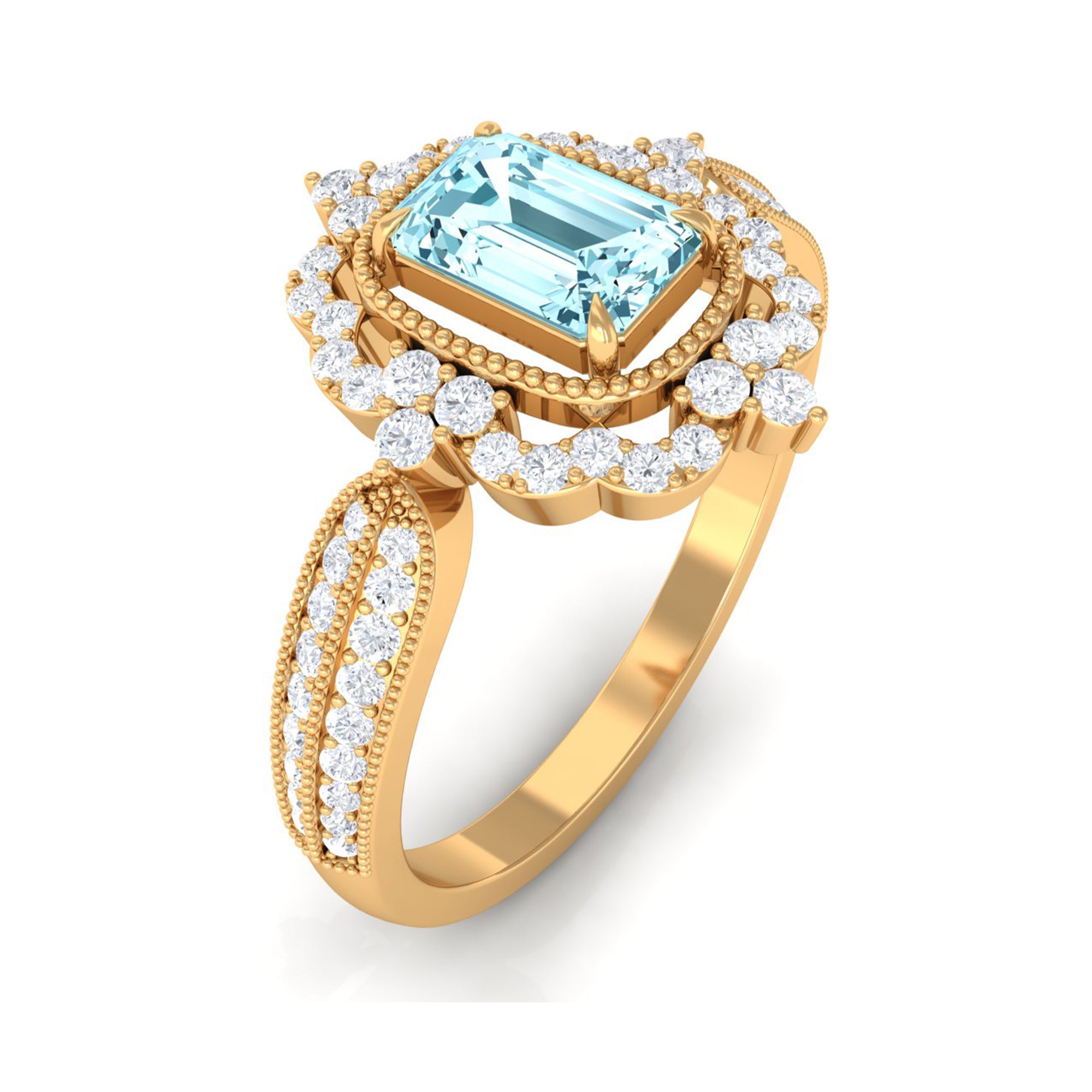 Give your beloved this enchanting Vintage Inspired Engagement Ring, a masterpiece that captures the essence of timeless romance. At its center lies a 4X6 mm Emerald Cut Aquamarine set in Claw Setting, its serene blue hue reflecting the calm and purity of true love. Surrounding the center stone is a delicate Diamond Halo embraced by intricate Beaded detailing, adding a touch of old-world charm that feels both regal and romantic. The band, adorned with Diamond accents and graceful beadwork, completes the look with sophistication and artistry. Every detail of this Emerald Cut Engagement Ring with Aquamarine is carefully crafted to evoke the beauty of antique design while celebrating the modern elegance of enduring devotion. Perfect for the woman who adores both history and sparkle, this Aquamarine Diamond Engagement Ring is a radiant reminder that love grows more beautiful with time. Presented in a signature jewelry box and available in various ring sizes, this Aquamarine Engagement Ring is ready to mark the beginning of your forever. Elegant, graceful and deeply symbolic, this ring is a timeless promise wrapped in the gentle glow of vintage romance.