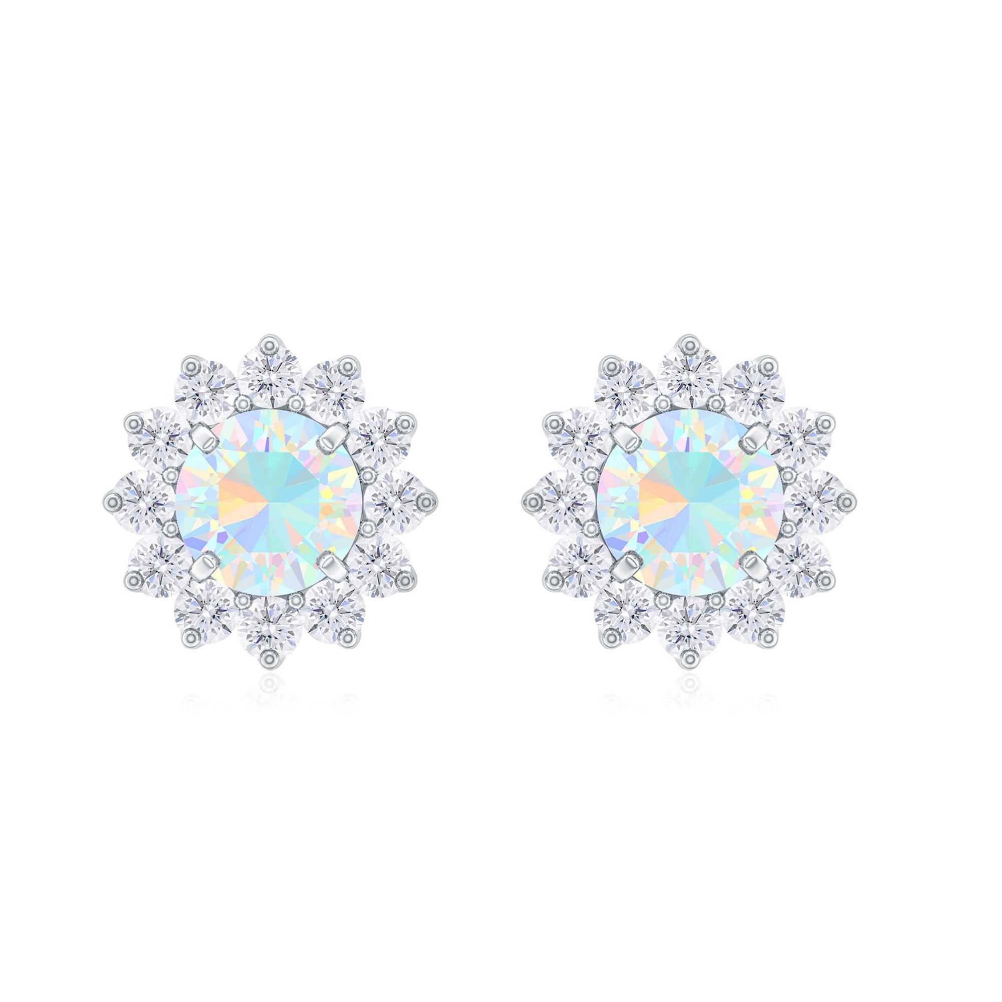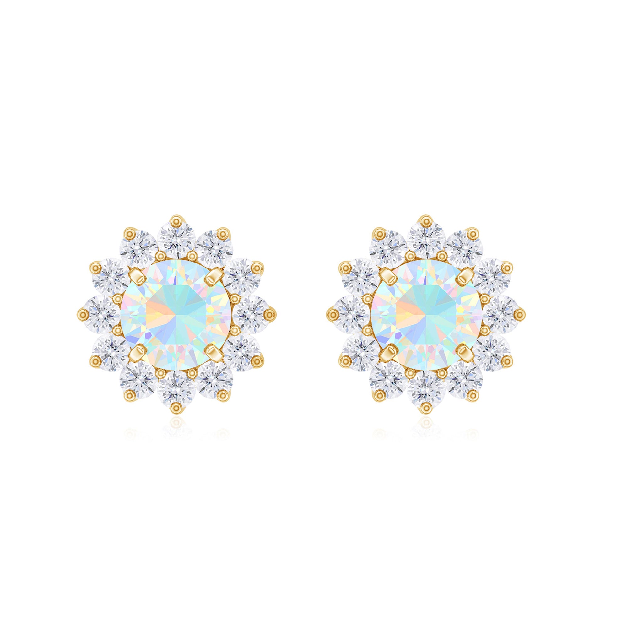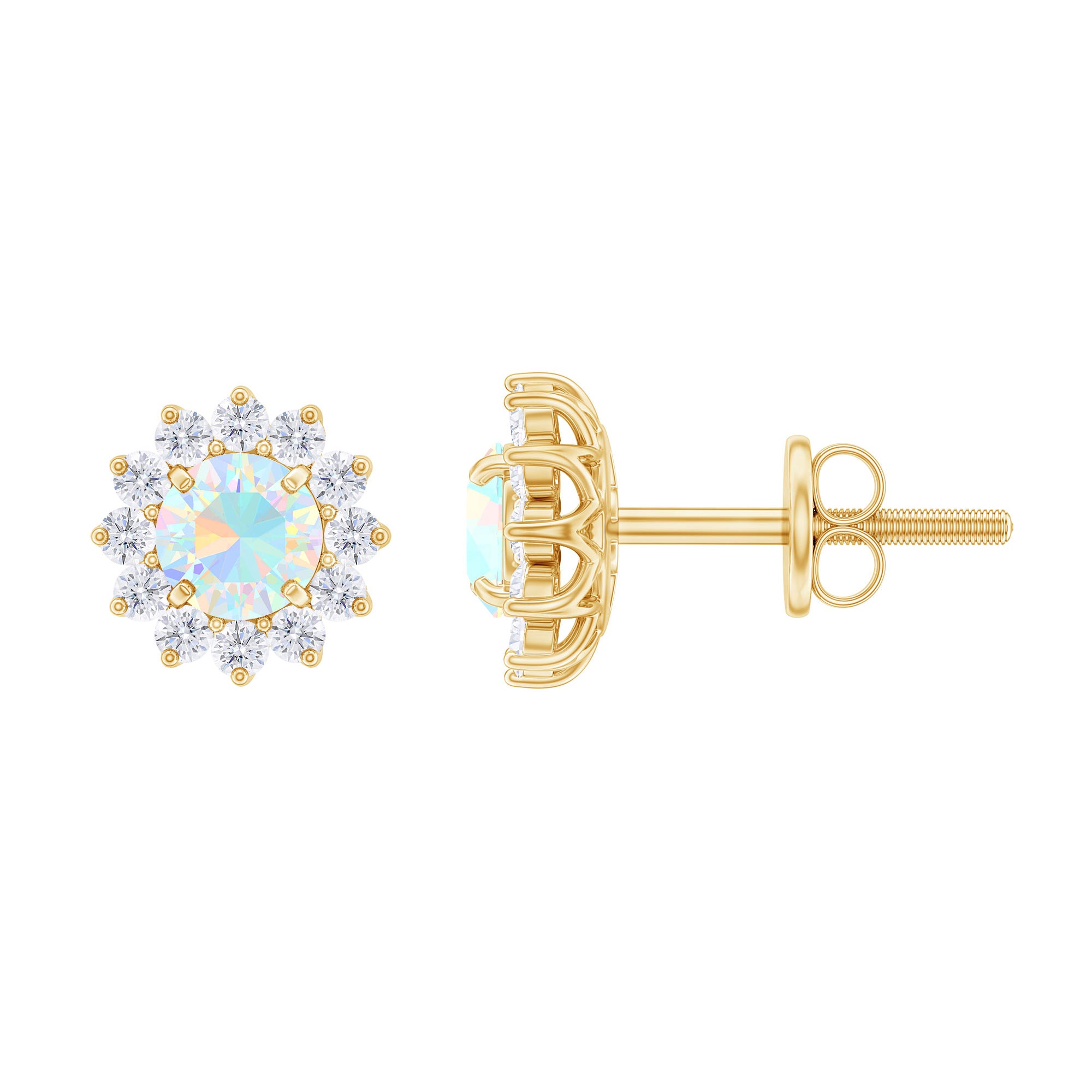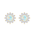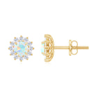 These timeless Flower Stud Earrings will beautifully elevate your looks. They are embellished with a Round Shape Ethiopian Opal secured in Prong Setting embraced with Round Diamonds as a halo. The Opal Stud Earrings are crafted with Solid Metal and will add glamour to every moment and make it worth celebrating. These Opal Earrings are an elegant pair that you can wear with any ensemble for years and years to come.