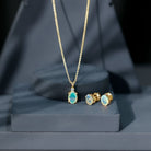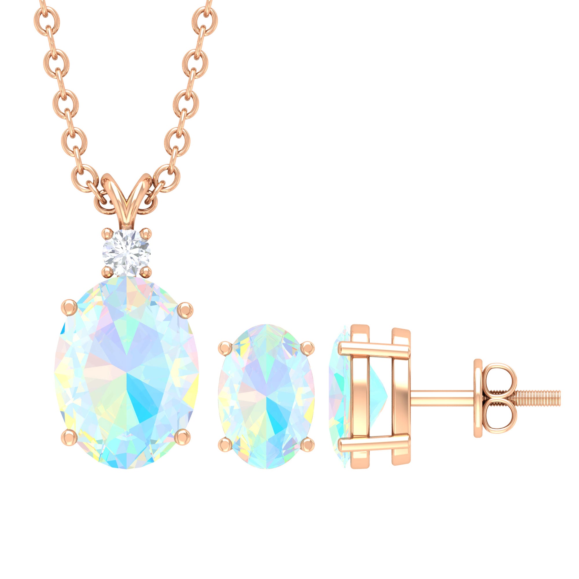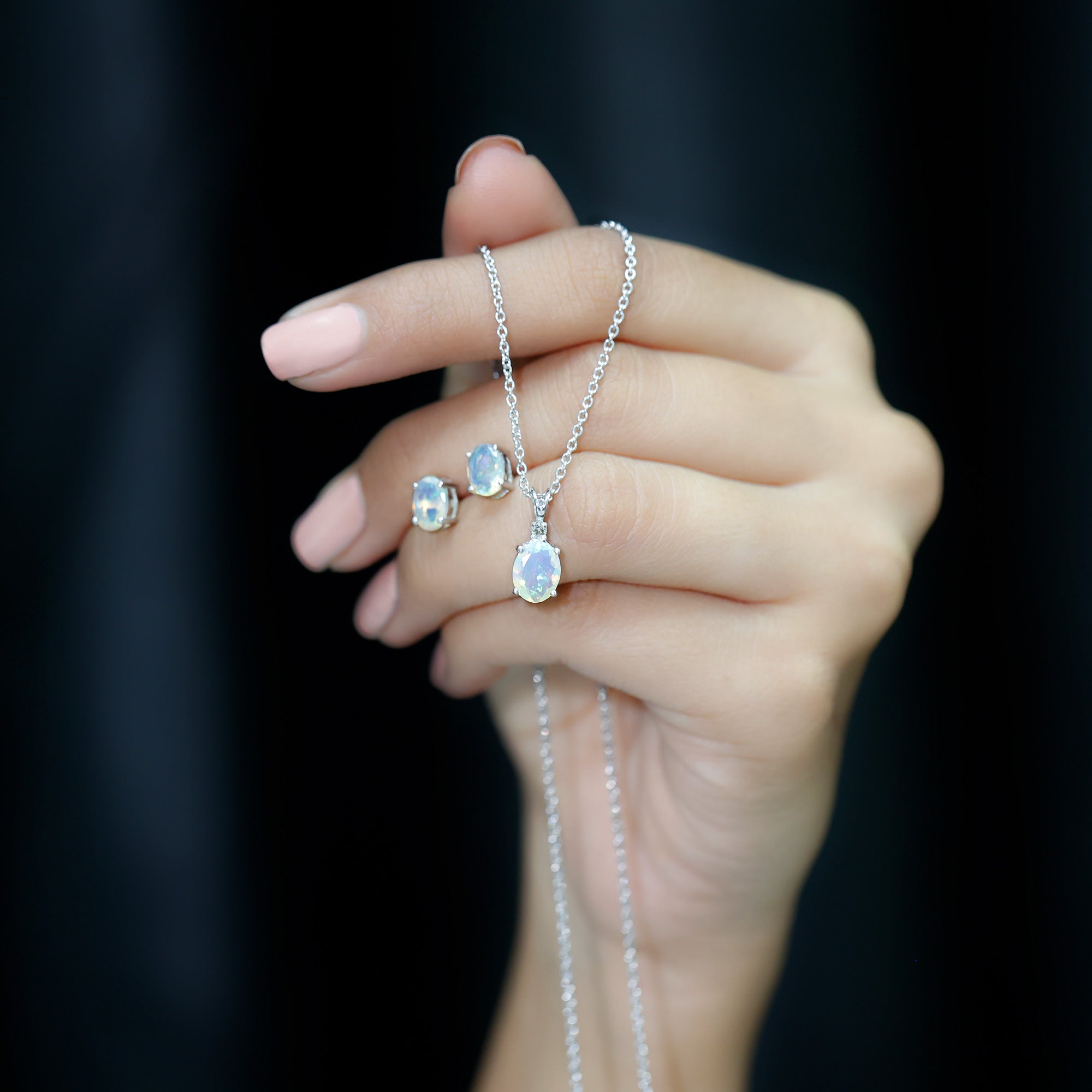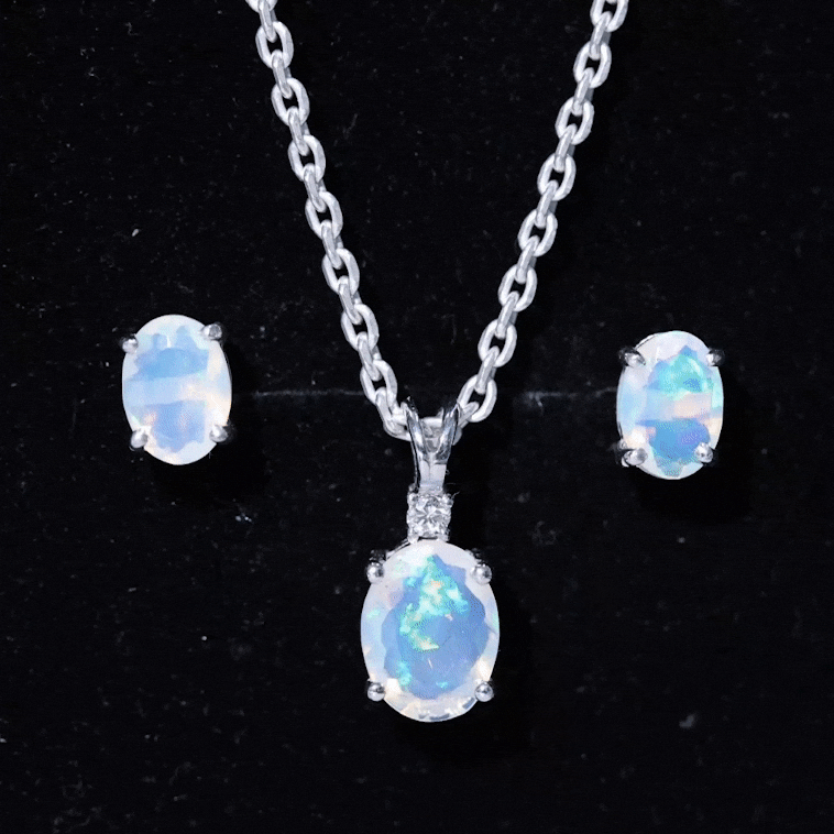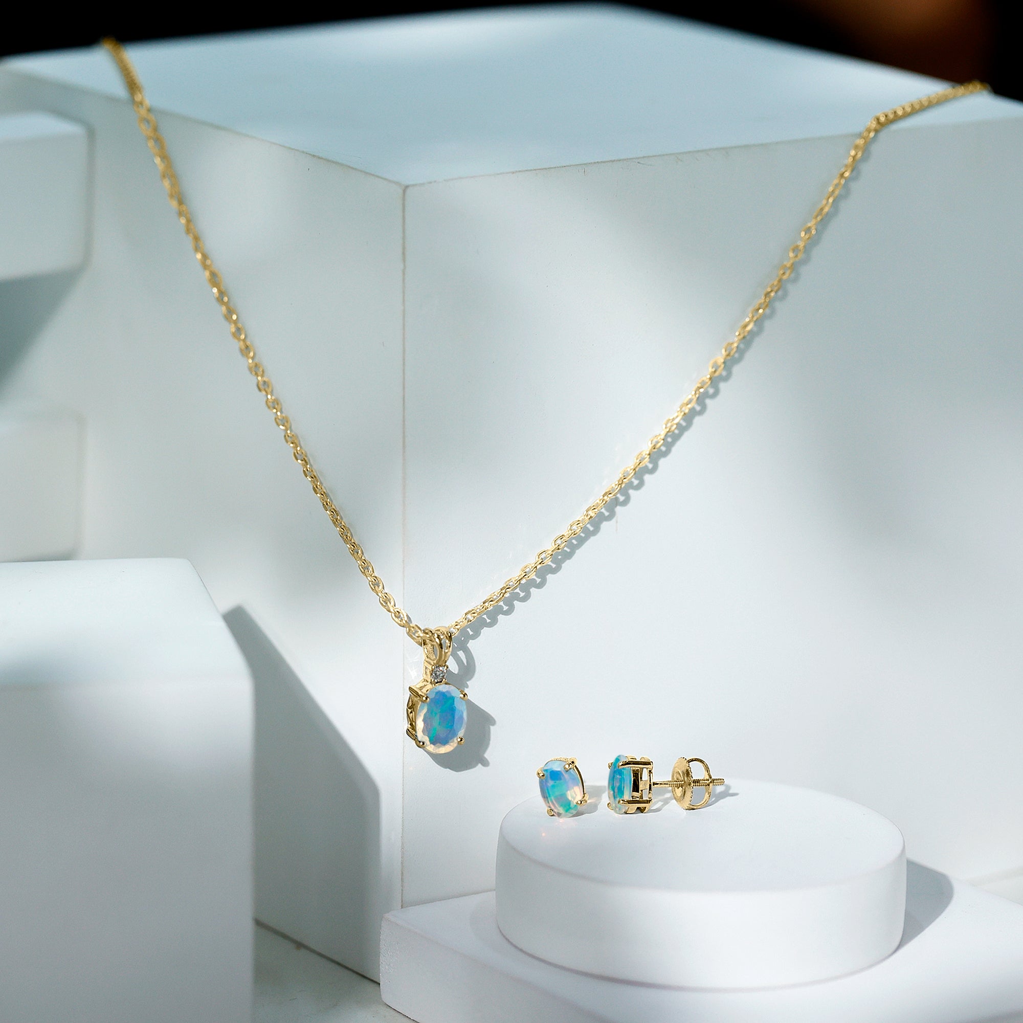 The real Ethiopian opal solitaire jewelry set with diamonds is perfect for any occasion or a casual day out to a formal event. This stunning jewelry set features a real Ethiopian opal solitaire necklace and a pair of matching stud earrings along with a sparkling 2 mm diamond on top. The opal is a beautiful gemstone with a unique play of color, and the diamond adds a touch of luxury. It is also a great choice for an engagement or wedding ring set.