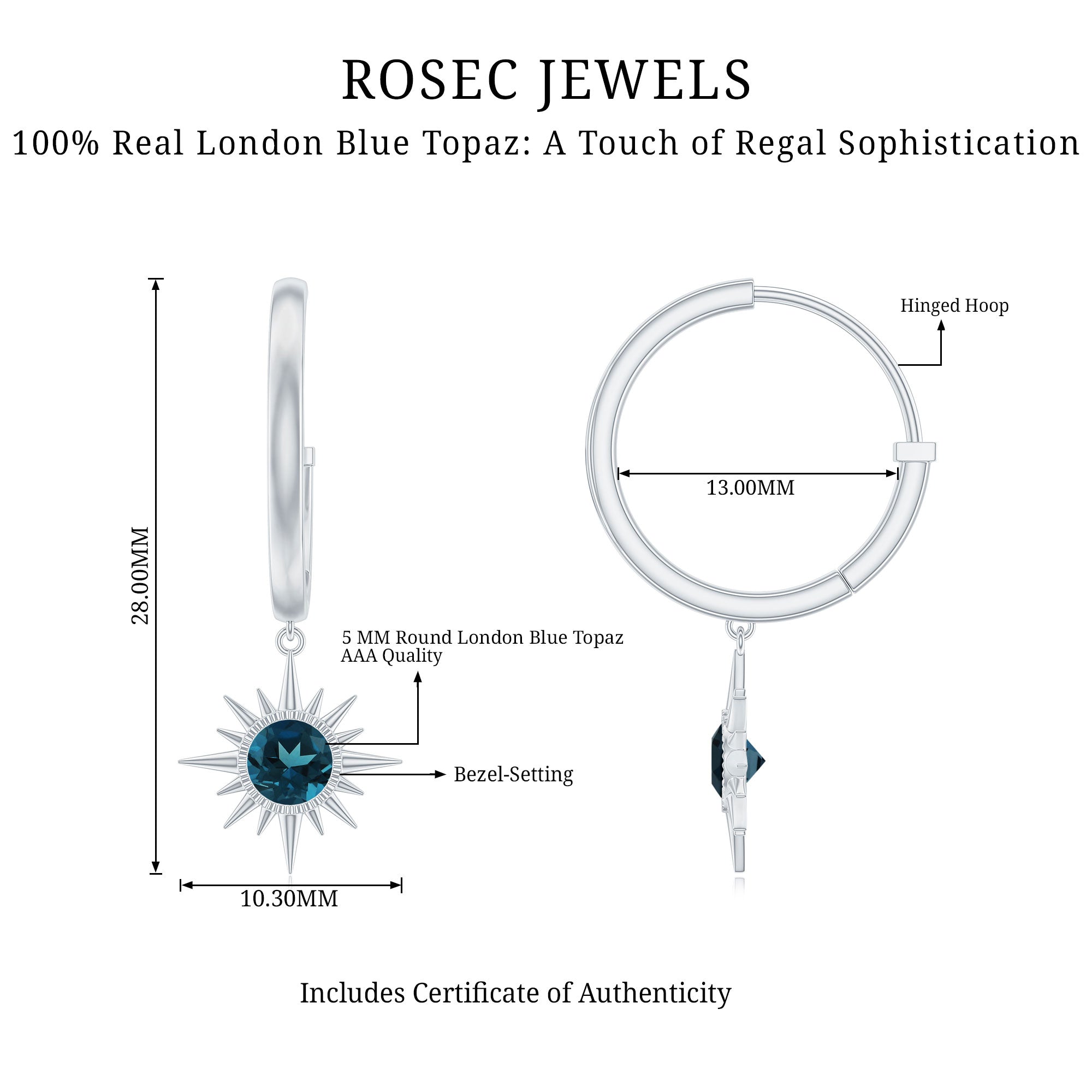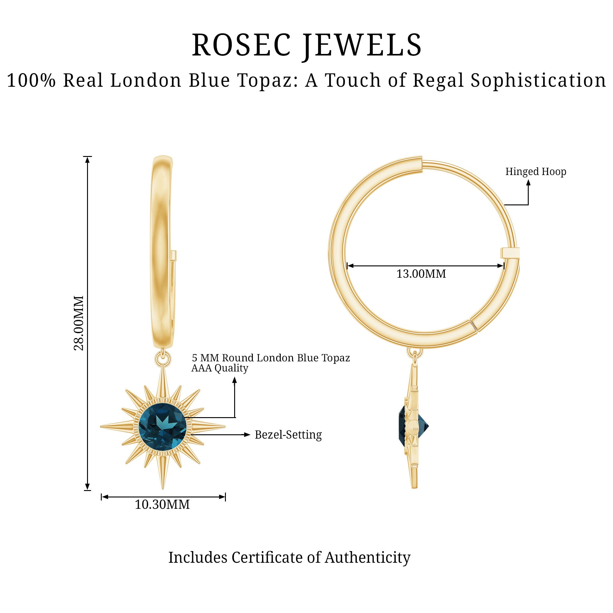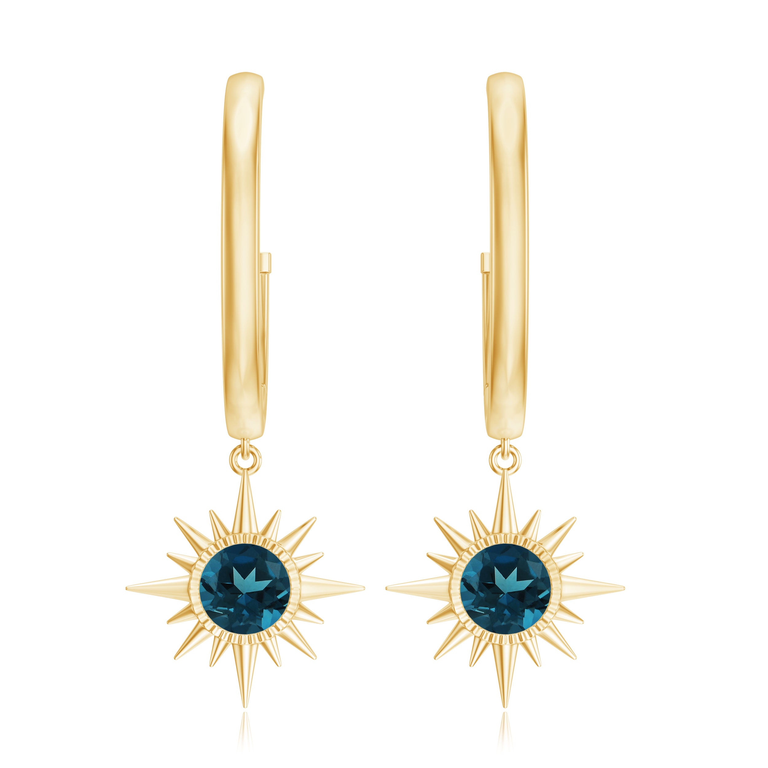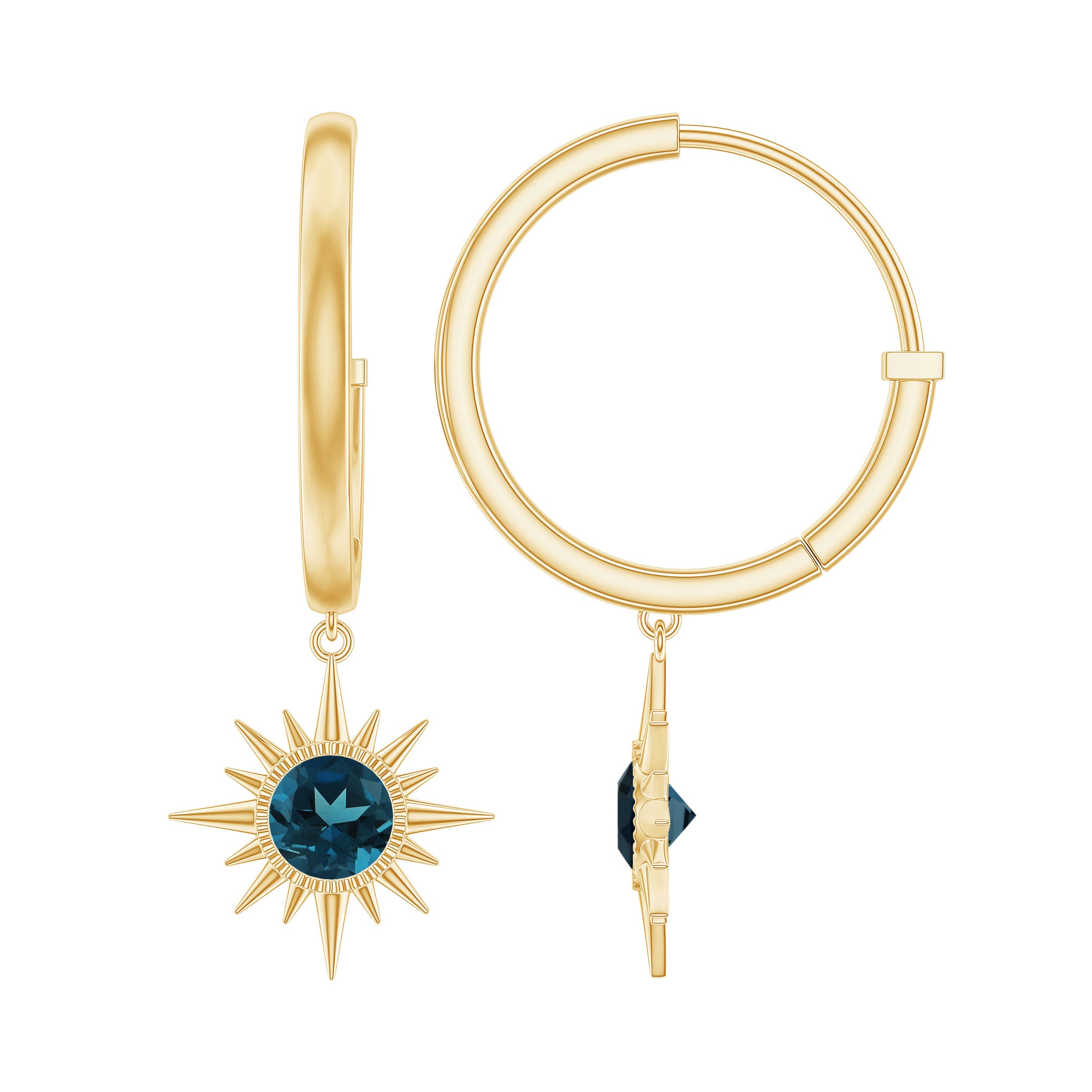 Elevate your style with these Sunburst Earrings, designed to bring a sparkle to any outfit. The Hinged Hoop Earrings feature a 5 MM round cut London blue topaz, set in bezel setting. The stone sits at the center of a sunburst design, giving the Blue Topaz Hoop Earrings a radiant and eye-catching appeal. The hoop drop design allows the earrings to move naturally, catching attention with every turn. Their size and shape make them suitable for both casual wear and special occasions, adding a subtle yet striking touch of style. Every London Blue Topaz is carefully selected for its AAA quality, ensuring a beautiful, certified gemstone in each earring. The secure setting keeps the stones in place while providing a polished appearance. Smooth edges and thoughtful craftsmanship make these London Blue Topaz Earrings comfortable for long wear, whether during the day or evening events. These Sunburst Drop Earrings arrive in a signature jewelry box, ready to be gifted for birthdays, anniversaries, or meaningful moments. Their versatile design pairs well with a variety of outfits and styles, making them a standout piece in any jewelry collection.