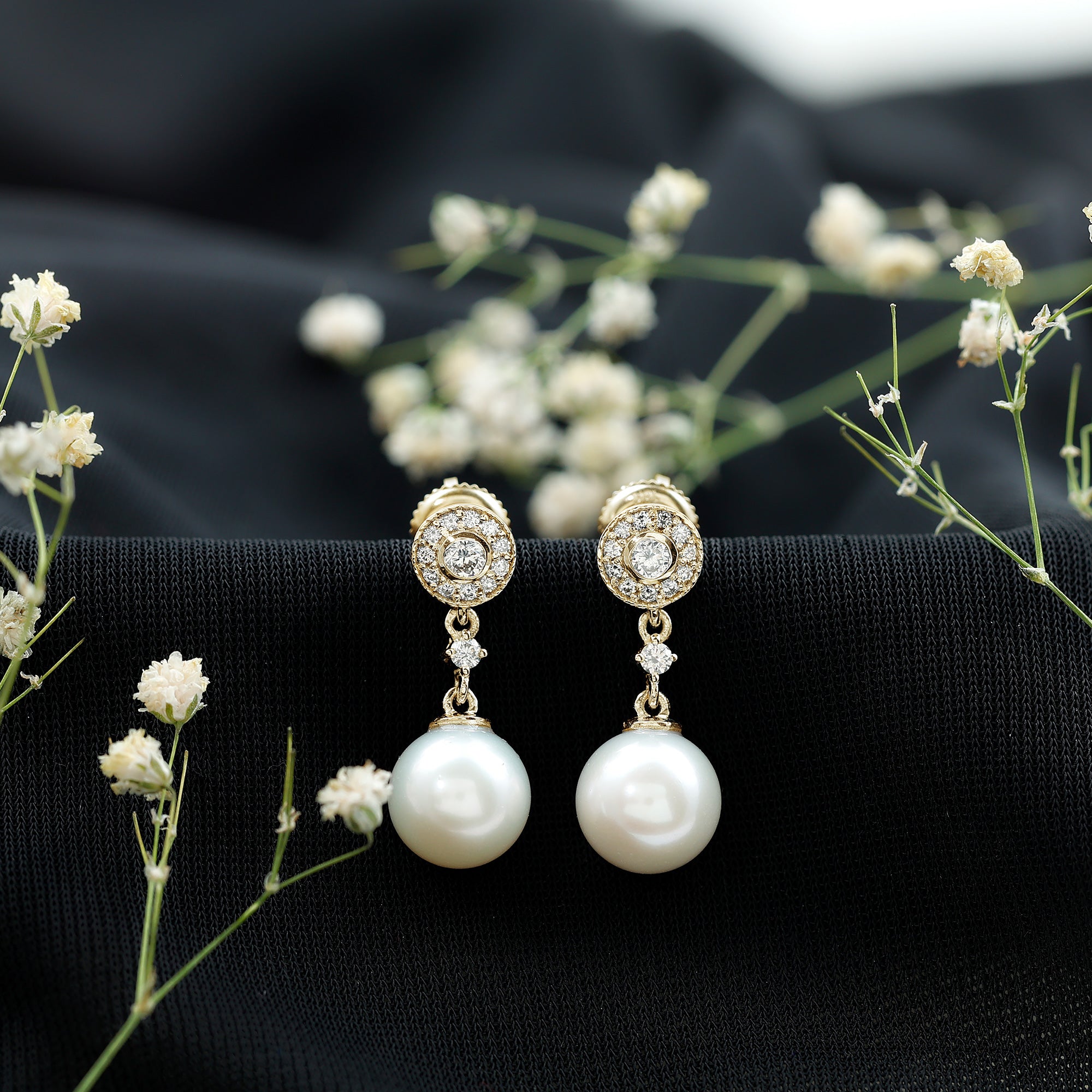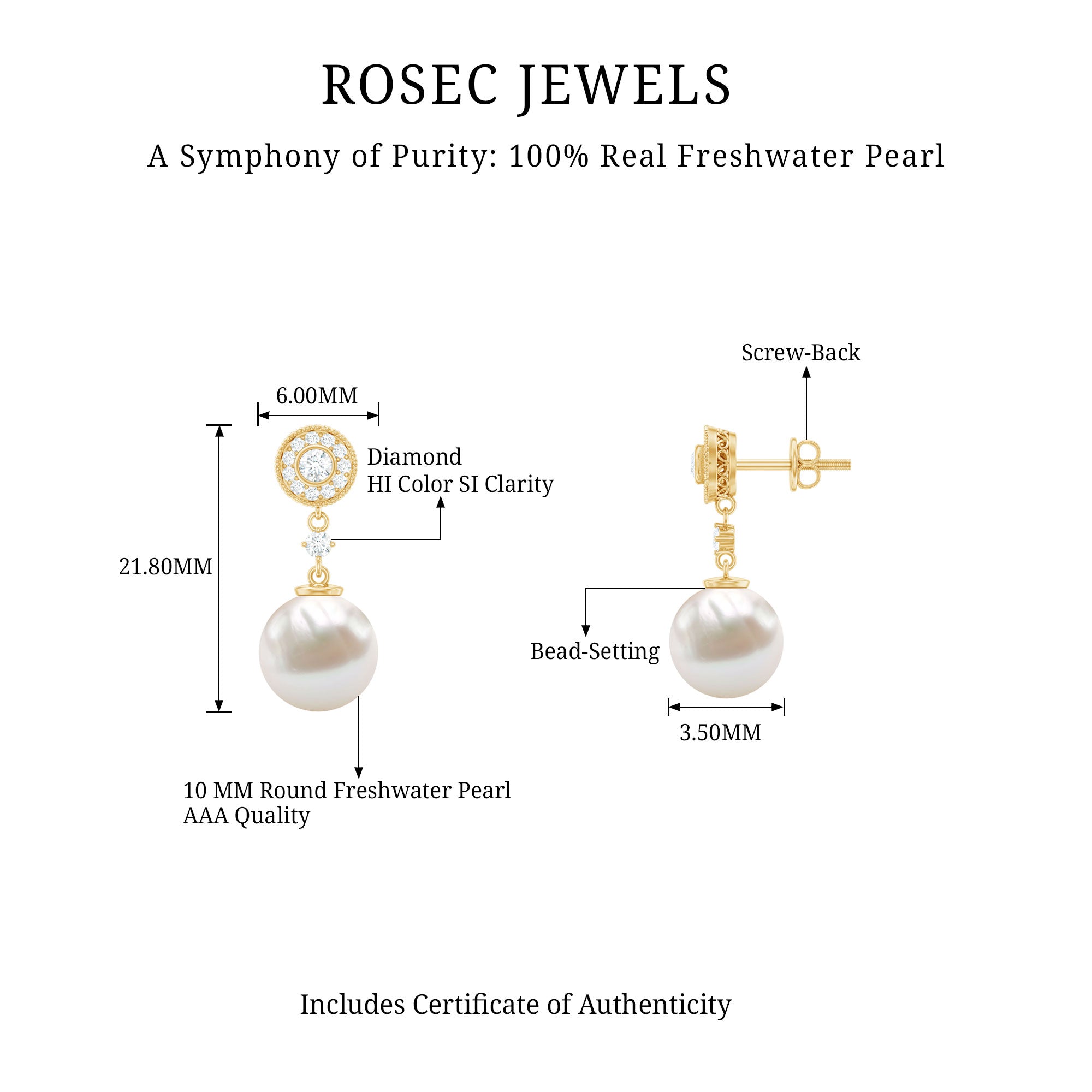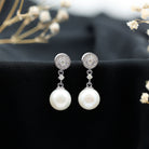 Celebrate timeless beauty with these exquisite Bridal Drop Earrings, thoughtfully designed to bring vintage charm to your most cherished moments. The Dangle Drop Earrings feature a classic round stud adorned with dainty diamonds. A detailed rope frame surrounds the stud, adding texture and old-world elegance to the design. Suspended below is a luminous 10MM freshwater pearl, chosen for its smooth surface and radiant glow. The pearl drop is connected to the stud by a single sparkling diamond, creating a graceful transition that adds movement and sophistication to the Pearl and Diamond Earrings. Available in a variety of metal choices, these Wedding Earrings for Bride can be customized to match your personal style or wedding look. The secure screw-back closure offers comfort and stability, allowing you to enjoy your special day with confidence and ease. Perfect for brides seeking a blend of classic elegance and refined detail, these Pearl Drop Earrings elevate any bridal ensemble.