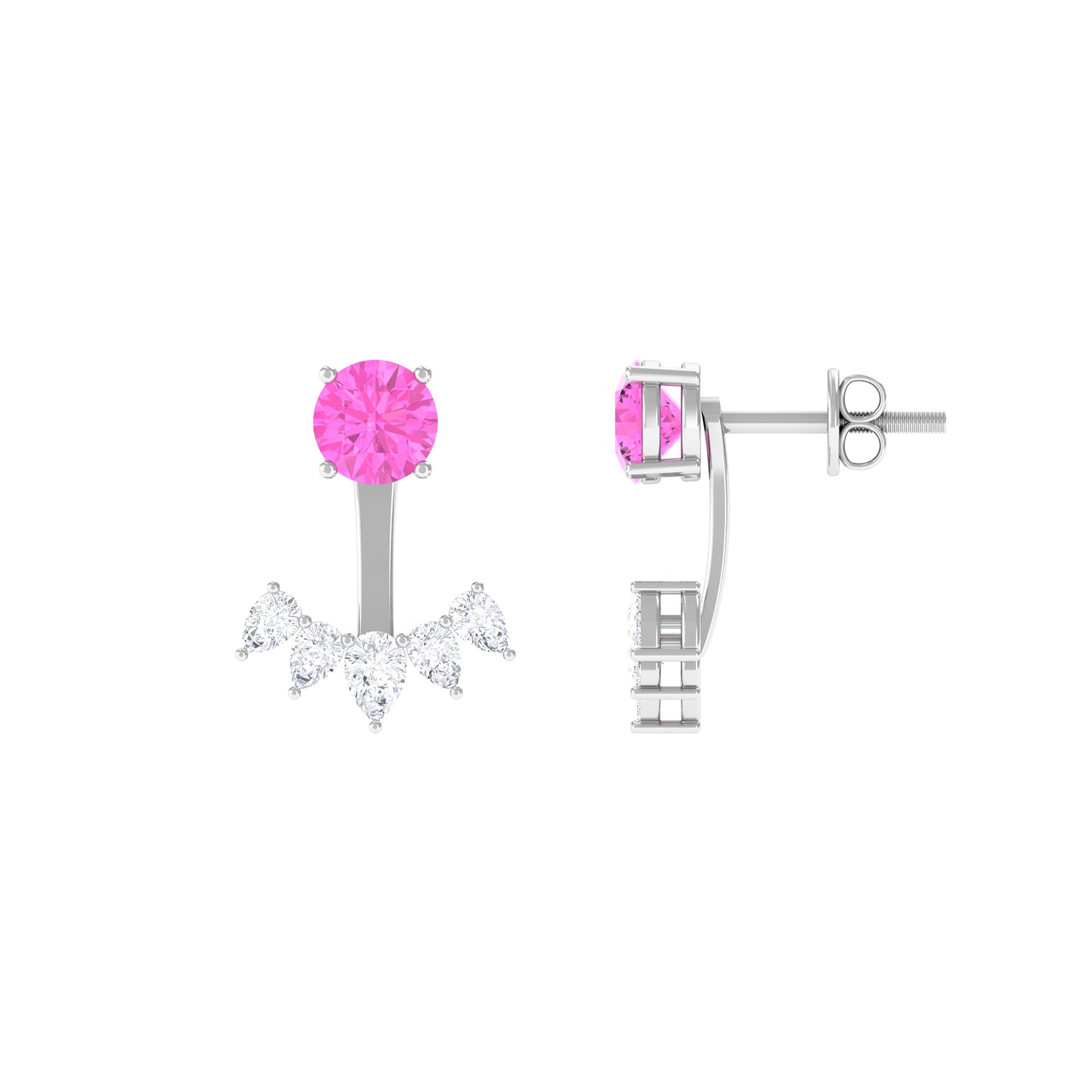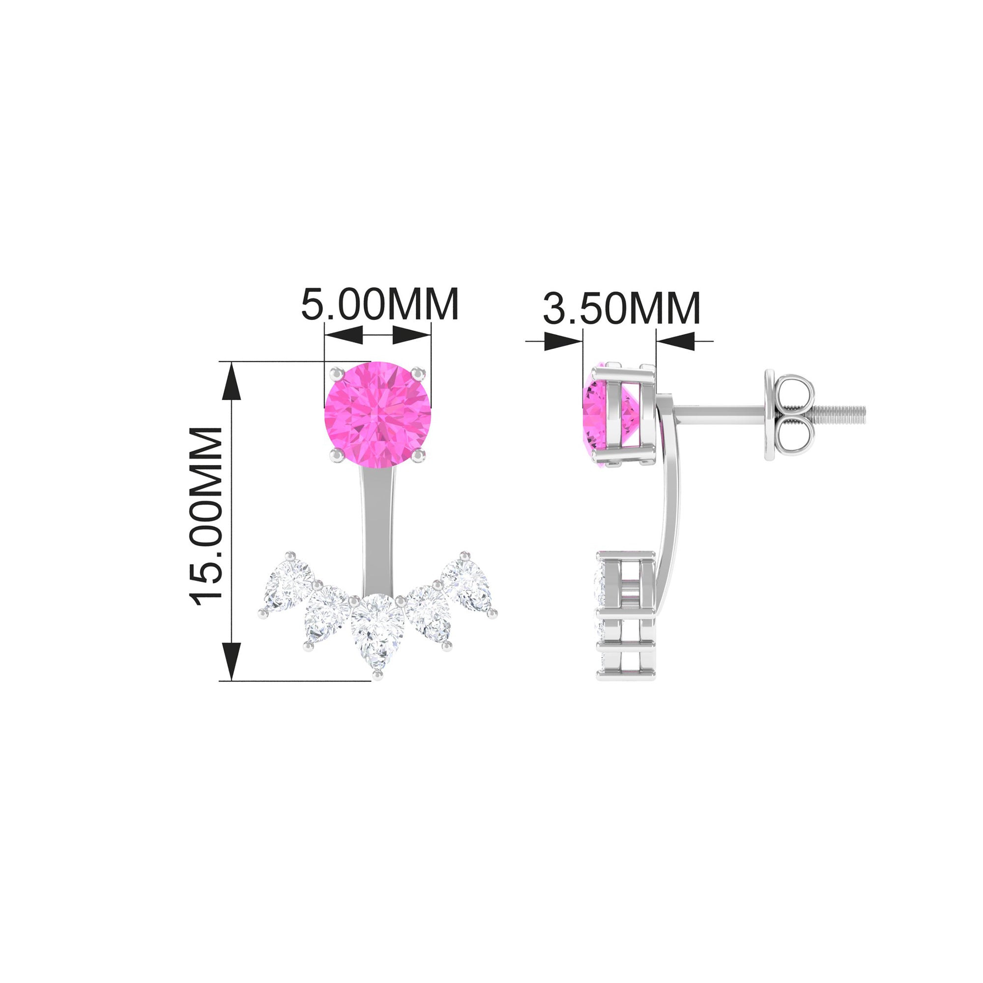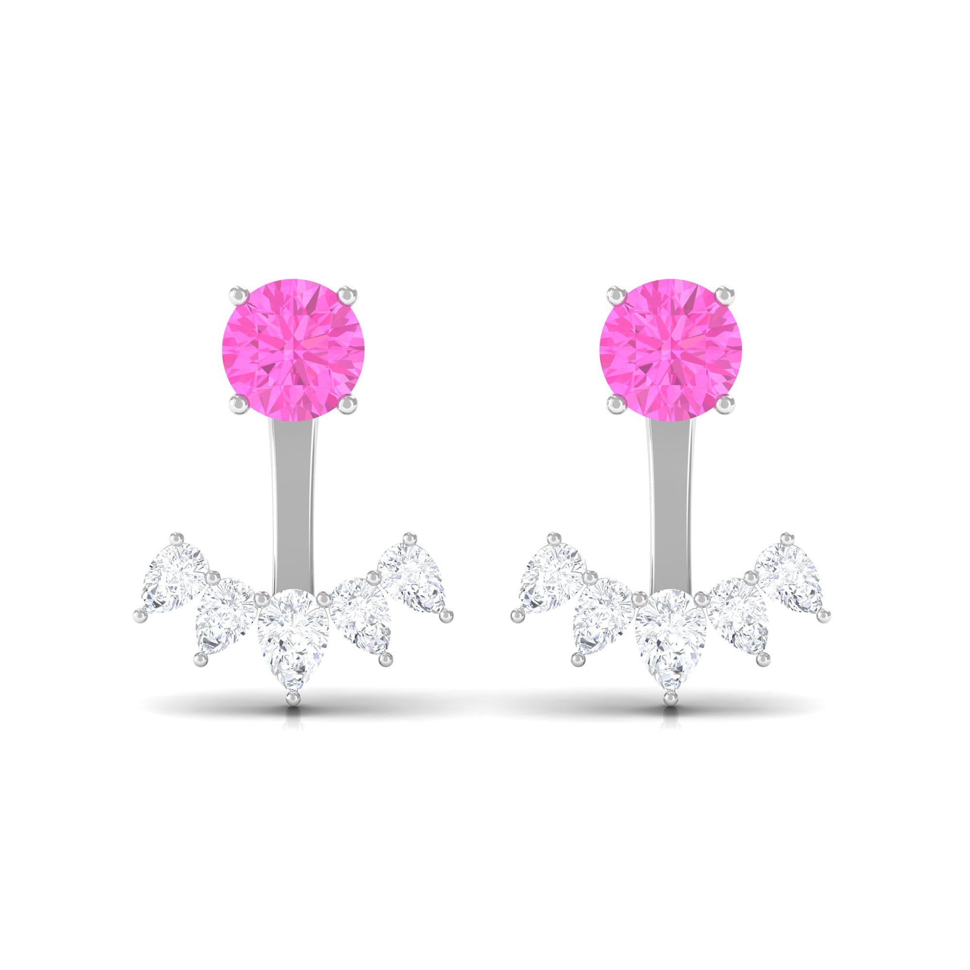 These Jacket Earrings feature a Round Cut Pink Sapphire set at the front within a Prong Setting, complemented by pear cut Moissanite stones at the back. Meticulously fashioned from high-quality Metal, these earrings are a testament to your elegant style.