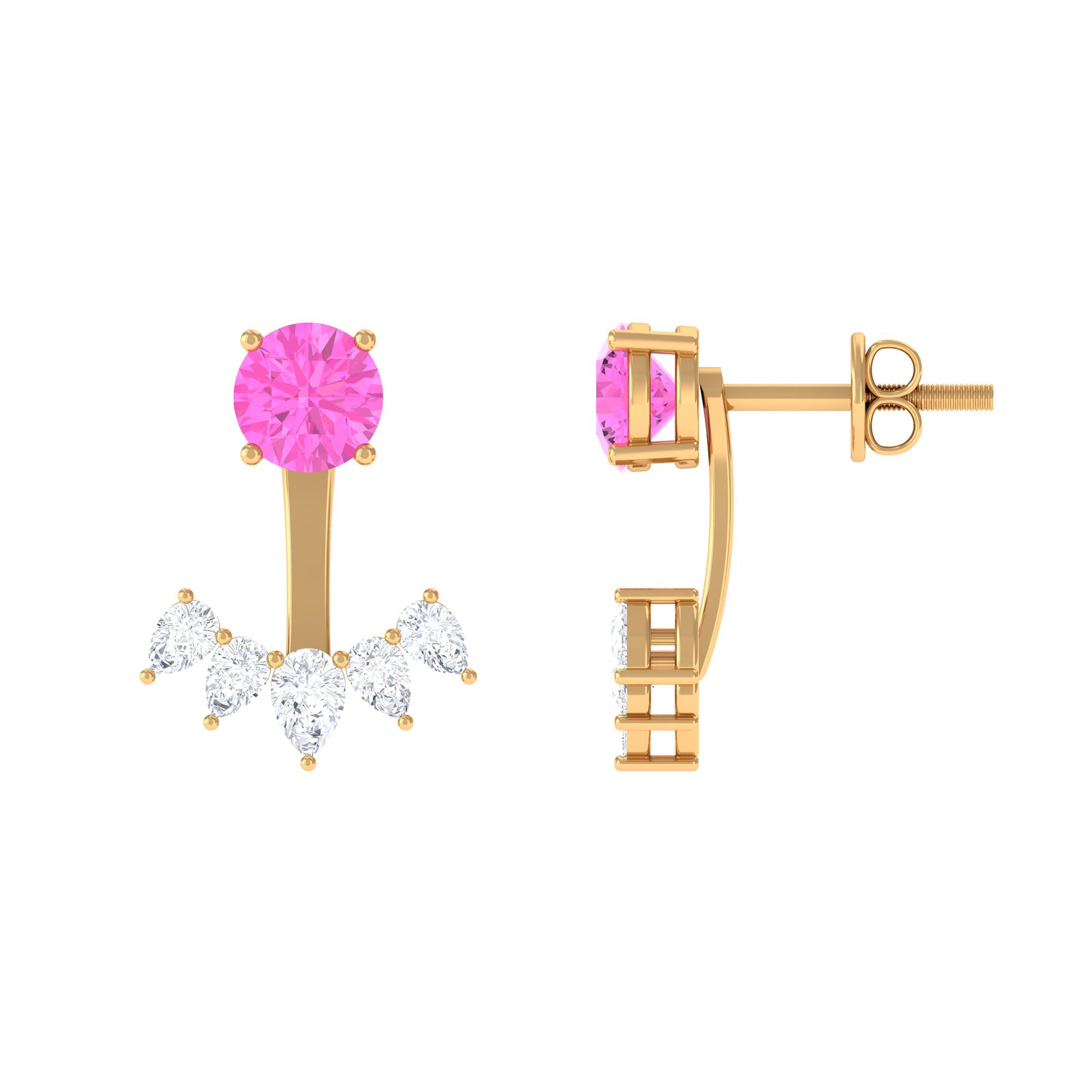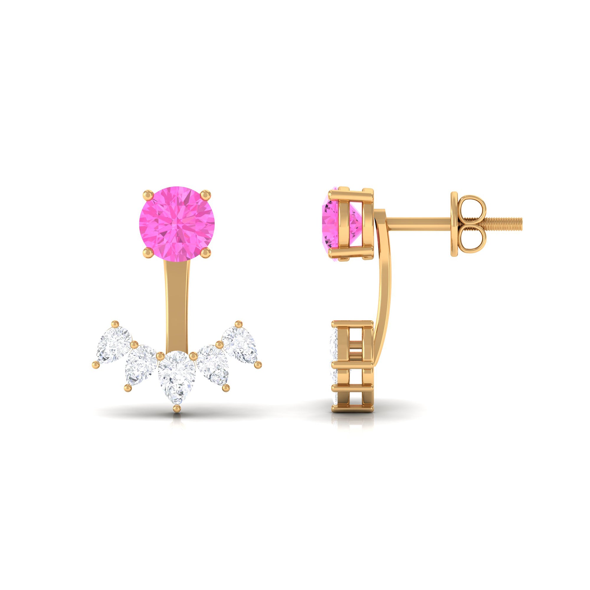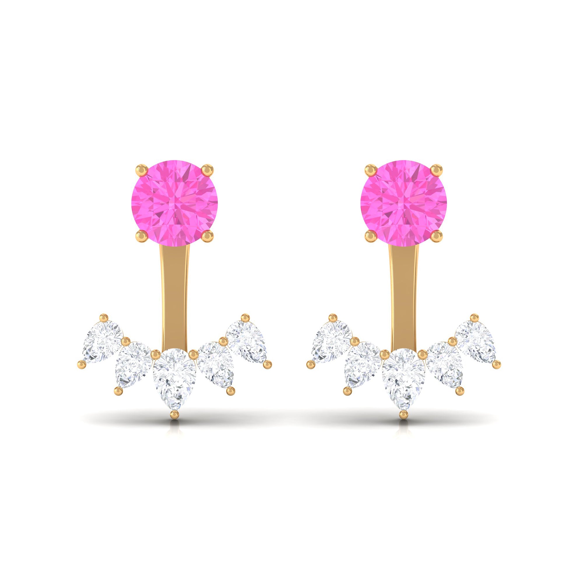 These Jacket Earrings feature a Round Cut Pink Sapphire set at the front within a Prong Setting, complemented by pear cut Moissanite stones at the back. Meticulously fashioned from high-quality Metal, these earrings are a testament to your elegant style.