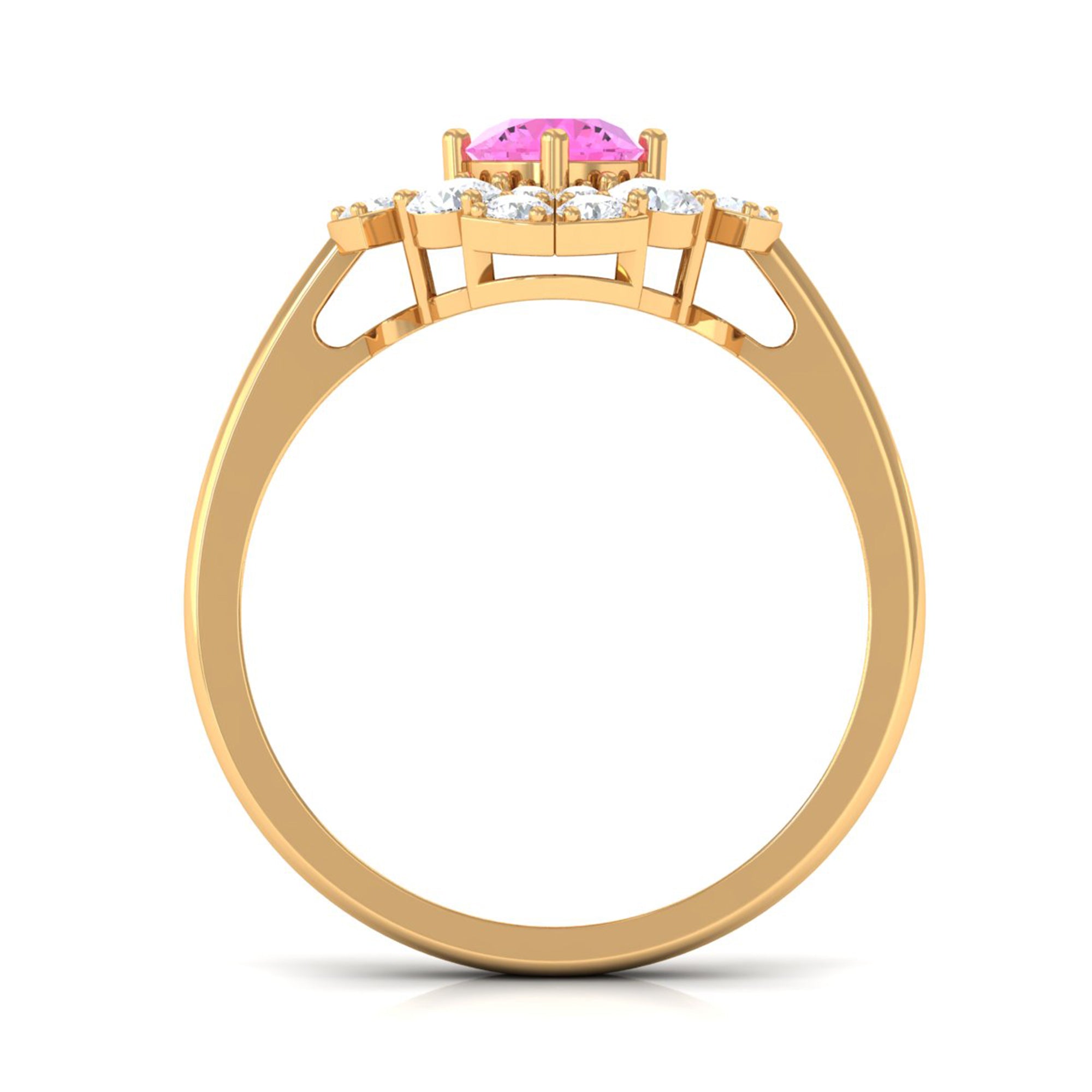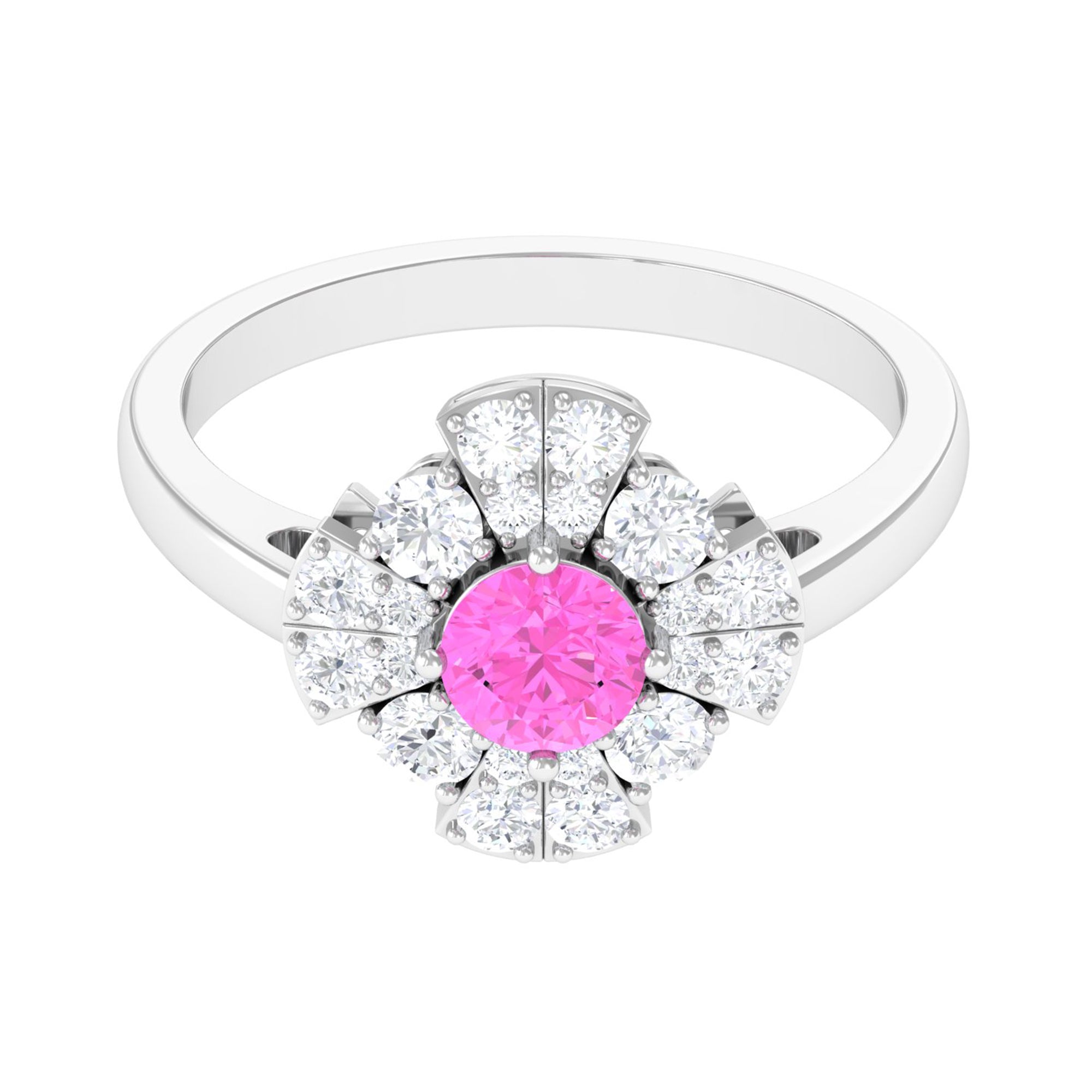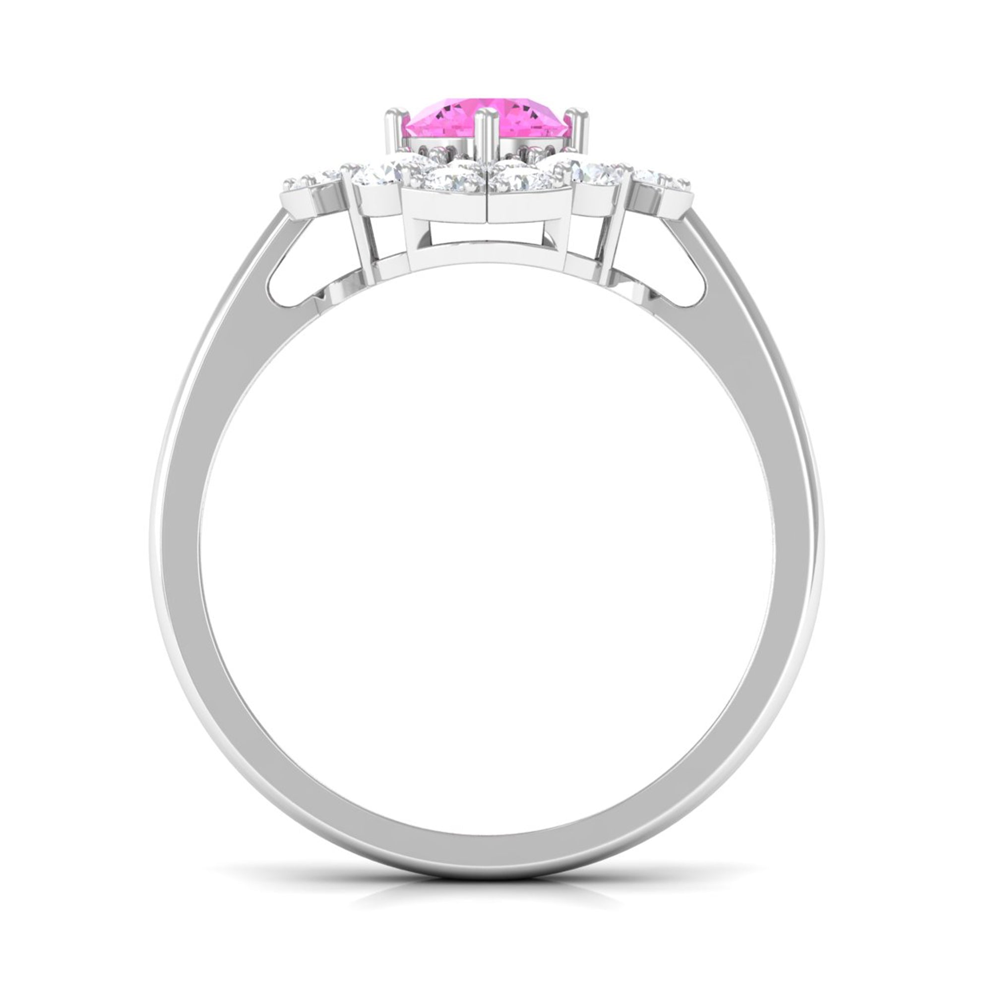 Celebrate your lifelong commitment and express your devotion with the enchanting Floral Engagement Ring. This exquisite piece features a mesmerizing Round Shape Pink Sapphire at its center, encircled by dazzling Diamond stones arranged in a captivating flower motif. The alluring design of this ring is sure to captivate the beholder, showcasing its unique and enticing appearance.