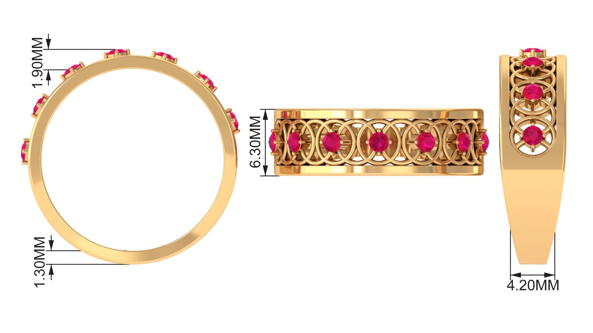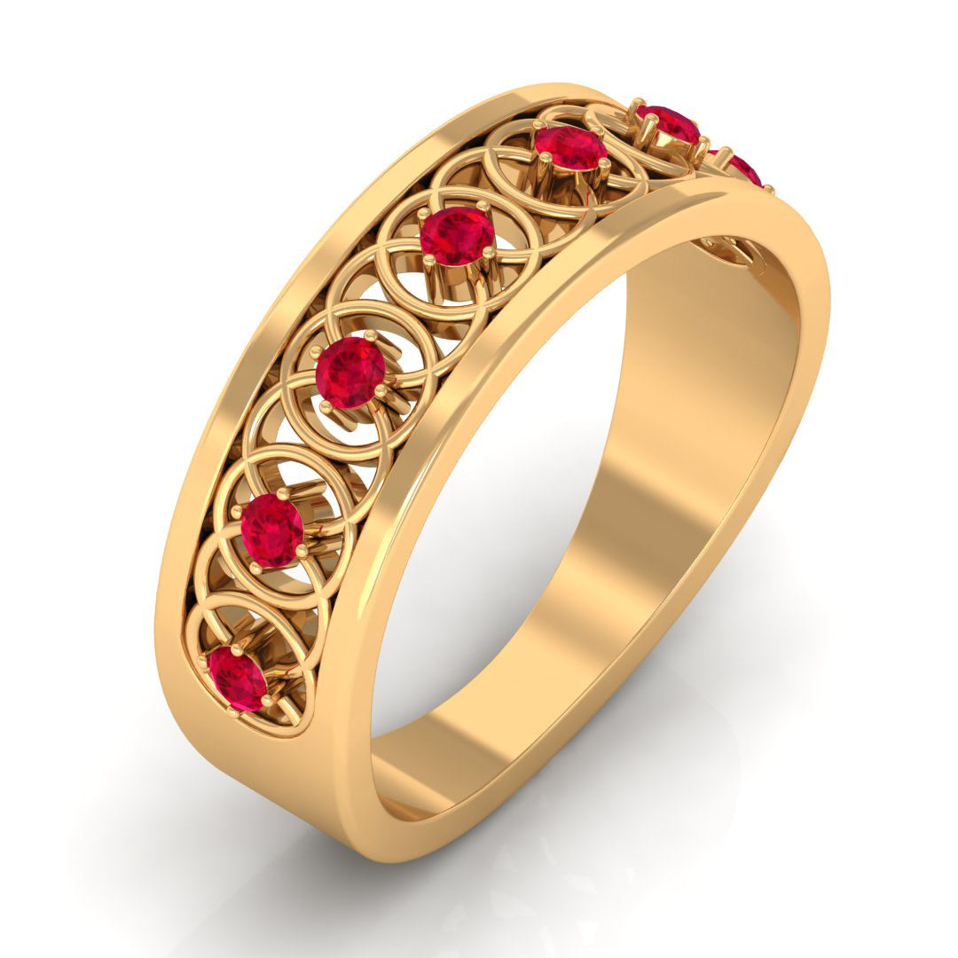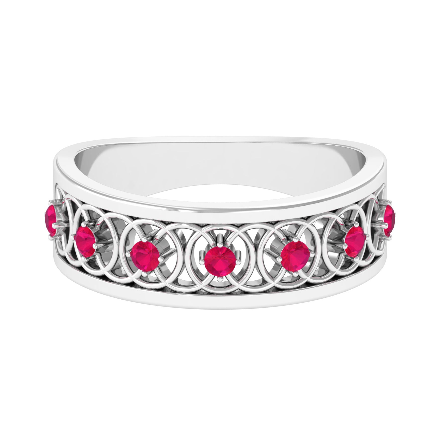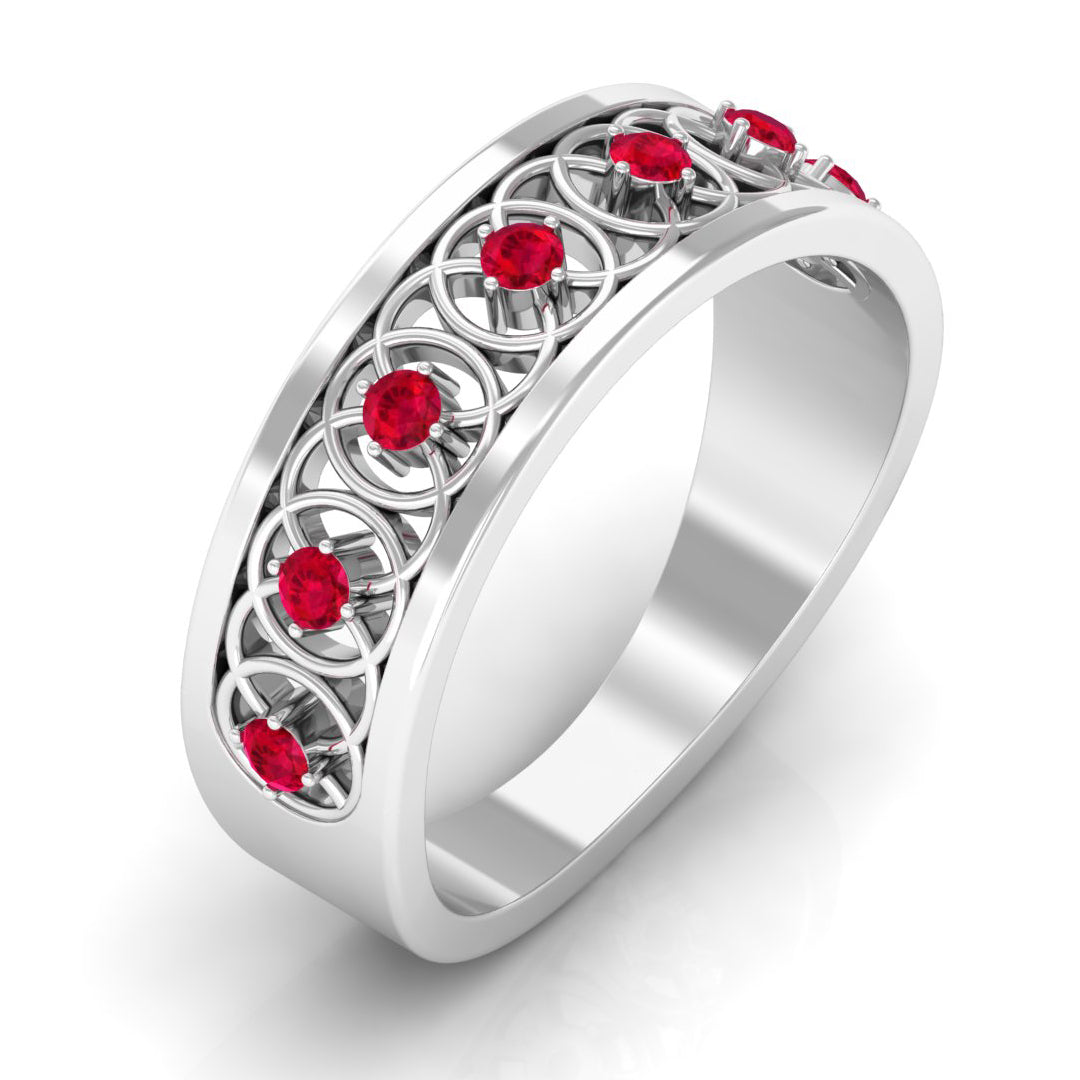 This stunning Half Eternity Band features Round Shape Ruby secured in Prong Setting, spaced out halfway around the band and Celtic Design adding a touch of uniqueness. Grab this Ruby Celtic Band Ring for your special one as it makes a perfect Birthday Gift, Anniversary Gift, or Graduation Gift for Her.
