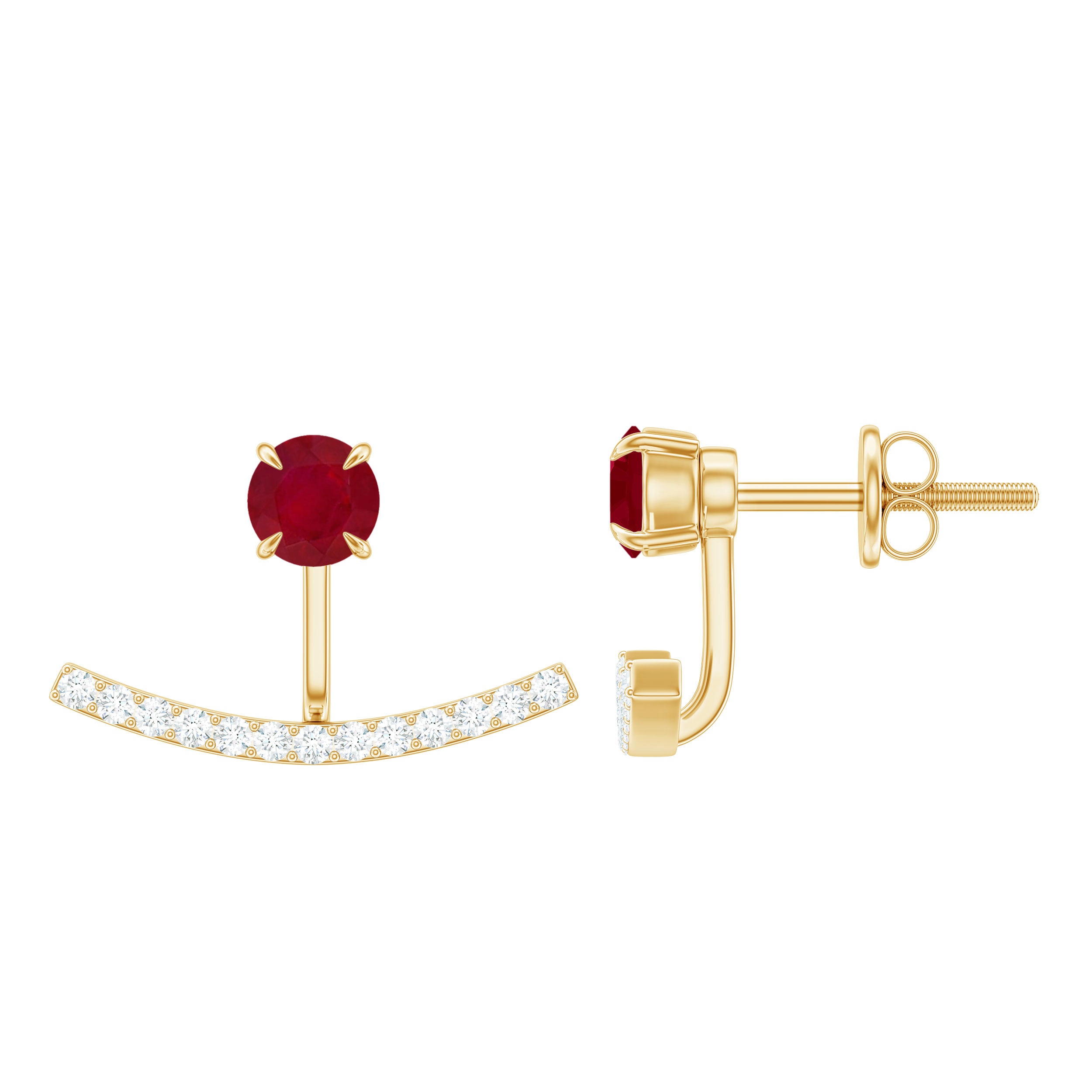 The Ruby Front Back Earrings are a gorgeous pair designed to create alluring looks as they can be worn together or separately. The Ear Jacket Earrings are crafted in Hallmarked Metal and adorned with Round Shape Ruby at the front and dainty Round Diamonds embellished on the jacket. The Double Sided Earrings come with a Screw Back Closure to comfortably secure them in place. Celebrate a special milestone in your relationship by getting our beautiful Red Ruby Earrings for your better half as an anniversary gift.