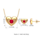 Celebrate love and elegance with our Lovely Heart Necklace and Earrings Set. Both pieces are adorned with a captivating Round Shape Ruby as a solitaire, delicately cradled in a secure Bezel setting, creating a stunning and harmonious design that radiates timeless beauty.