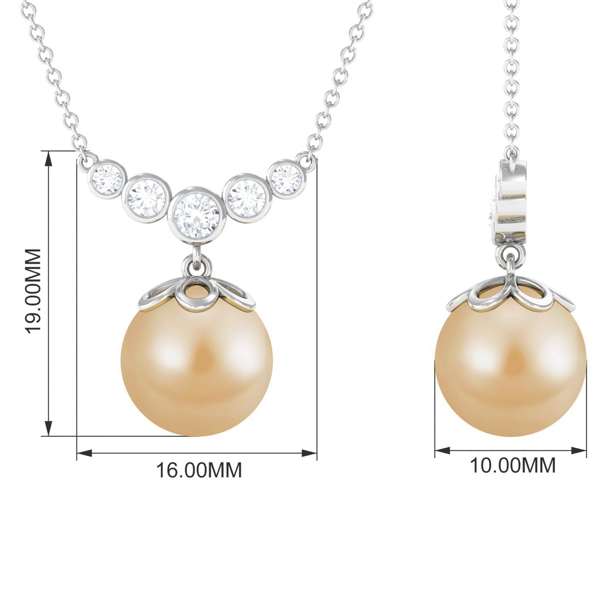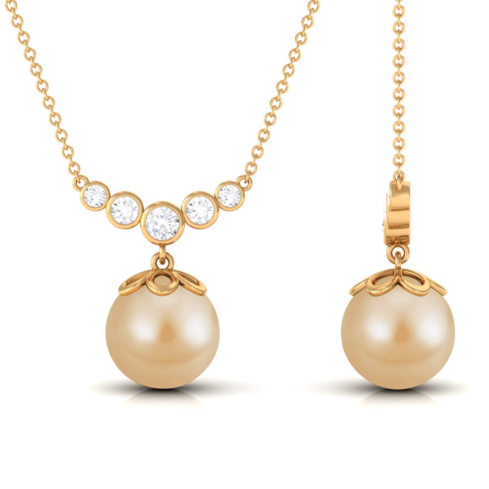 Introducing our remarkable designer necklace featuring a round South Sea pearl, exuding an aura of refined elegance. The centerpiece of this necklace, the lustrous pearl, is complemented by bezel-set round Diamond stones arranged in a graduated style, forming a captivating curved bar design. Each Diamond stone glistens with brilliance, perfectly accentuating the beauty of the pearl.