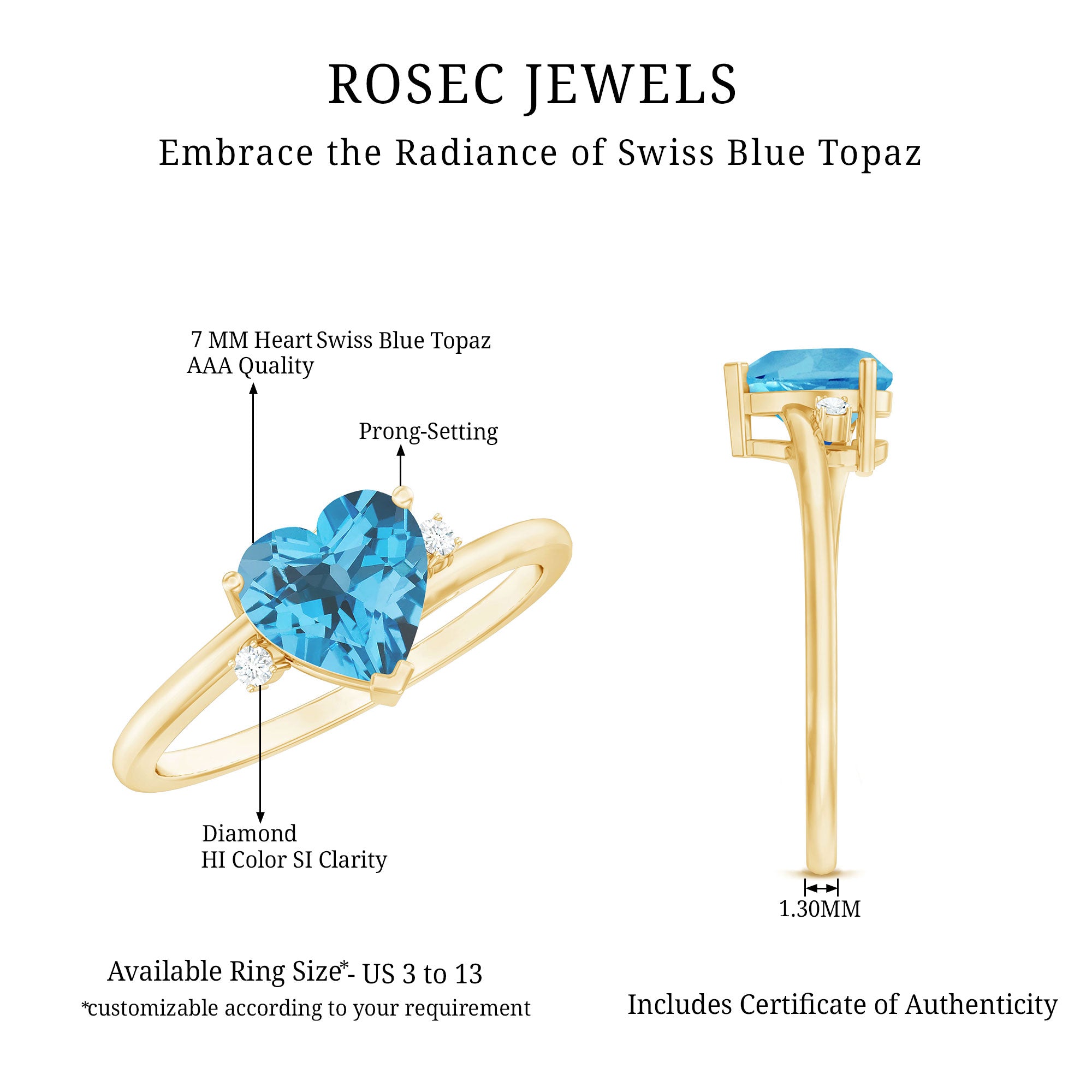 The beauty of a Promise ring lies in its ability to symbolize unwavering commitment between two individuals in love. This exquisite Promise Ring features a Certified heart-shaped Swiss Blue Topaz and round Diamond stones, representing the depth of emotions and devotion shared in a relationship. Crafted with utmost care and attention to detail, this ring serves as a stunning testament to the bond between you and your special someone.