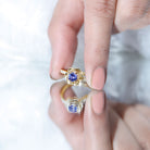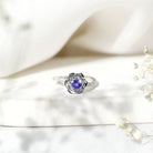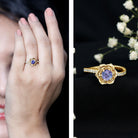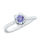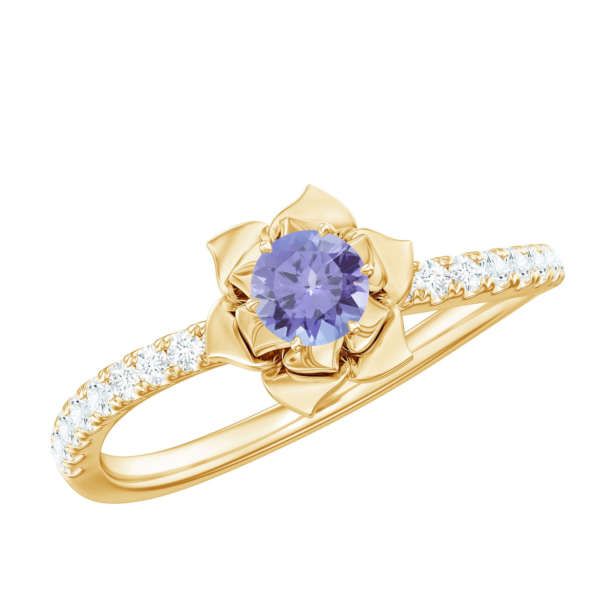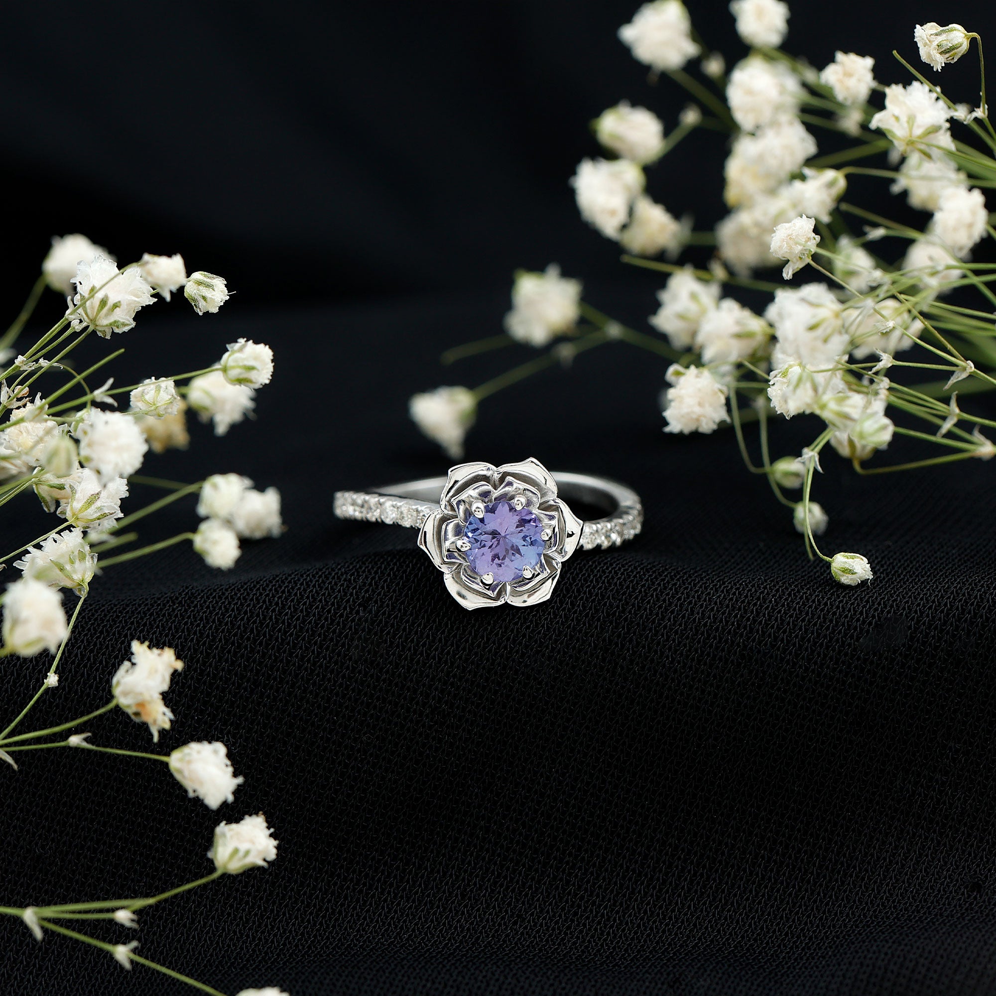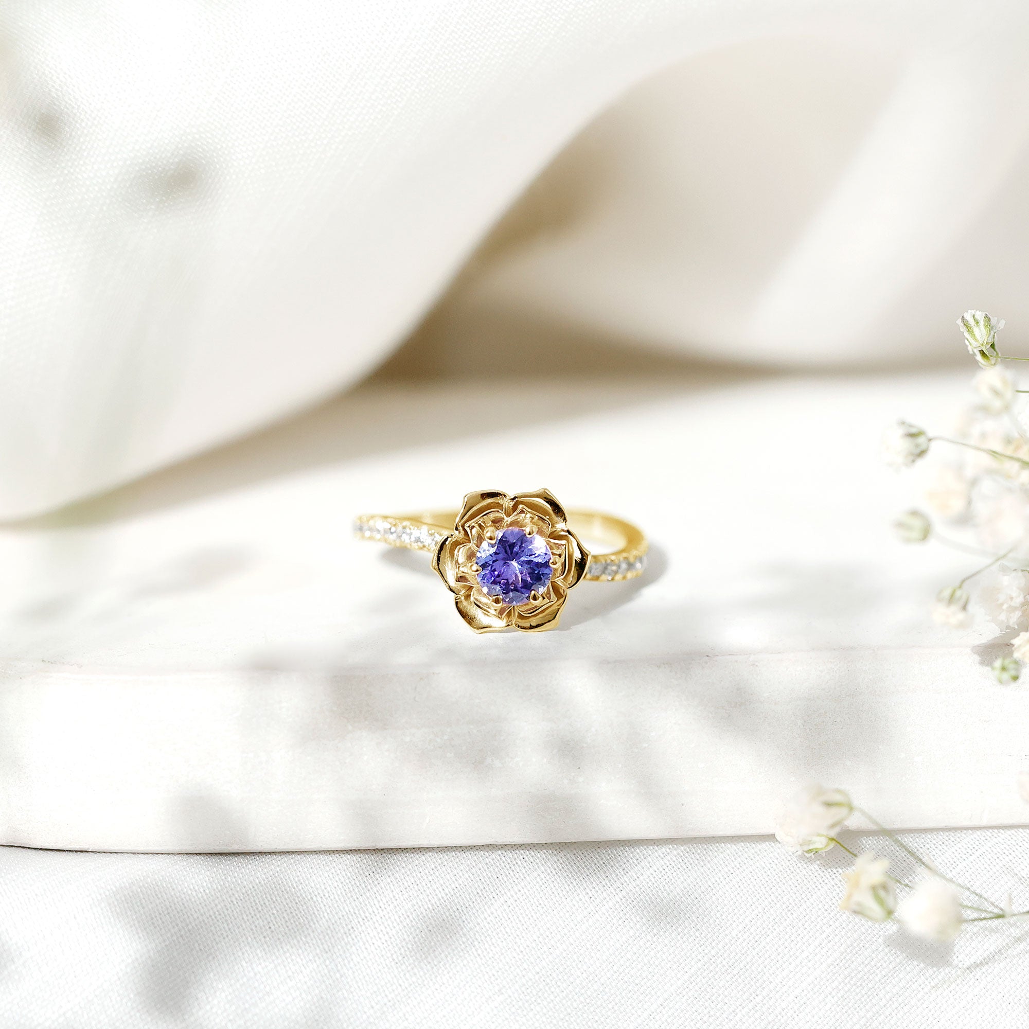 The Perfect Combination of Tanzanite and Diamond in this Rose Flower Ring is mesmerizing. The Round Natural Tanzanite is set in Centre of a Gold Petals of Rose Flower in the curved shank. Get this Floral Inspired Engagement Ring for your Blooming Lady Love, this Tanzanite and Diamond Engagement Ring is a stunning jewelry, which she will cherish her whole life.