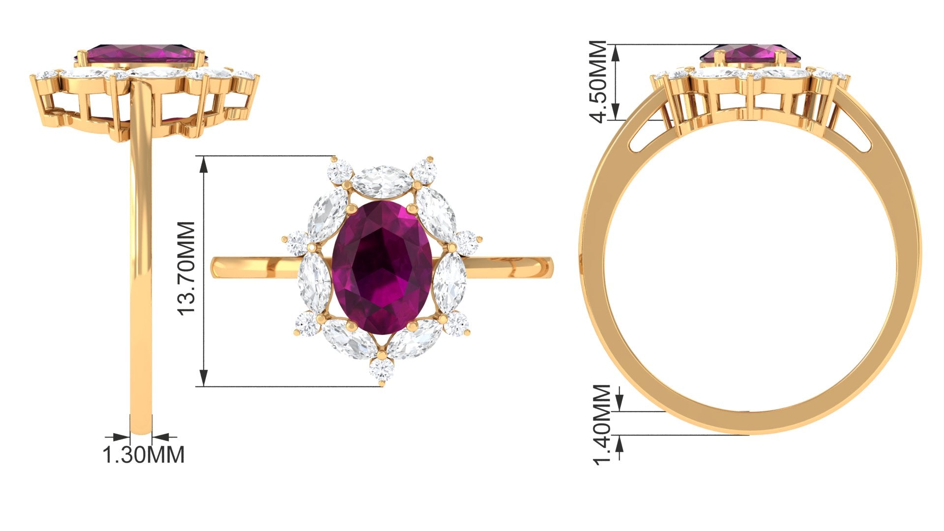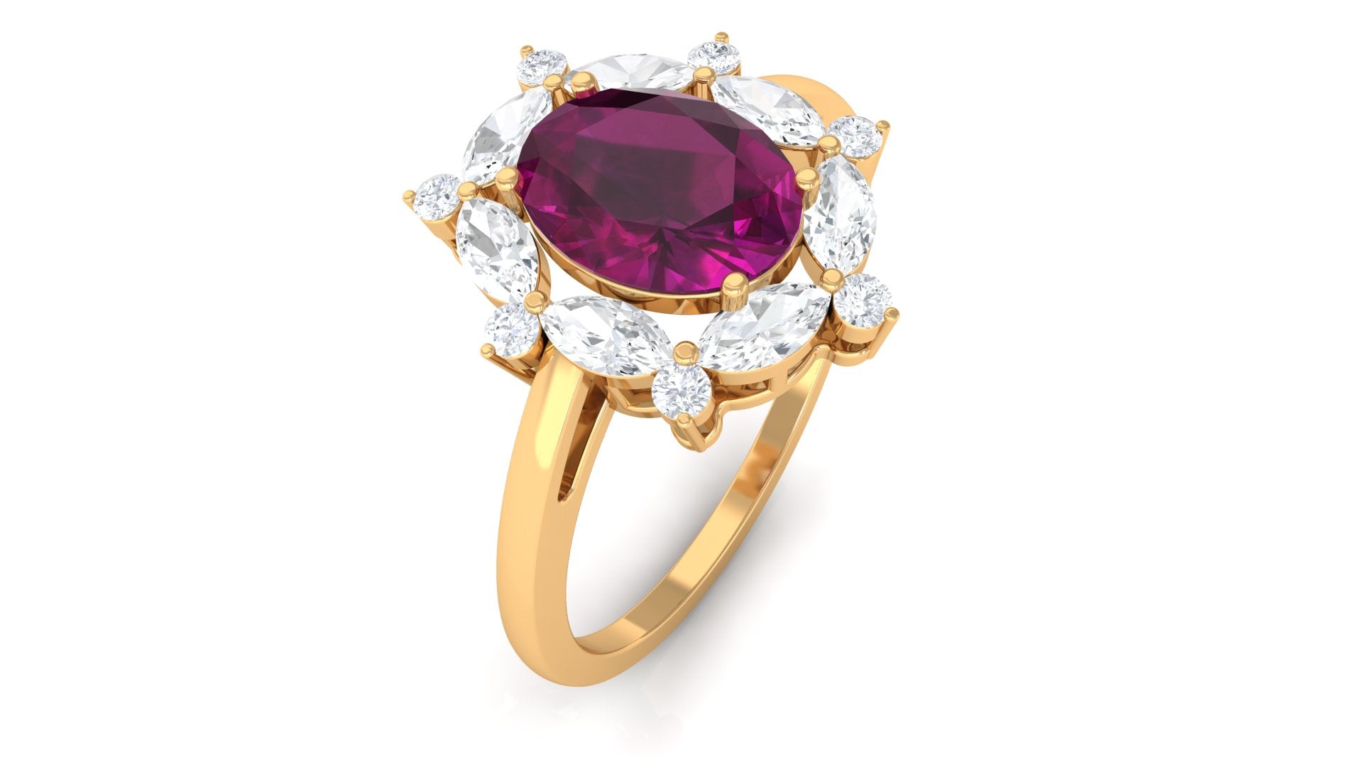 Make a stunning proposal with this elegant Rhodolite Engagement Ring. The ring features an oval cut Rhodolite surrounded by a halo of marquise and round moissanite. The designer halo adds a touch of glamour to this gorgeous piece of jewelry, crafted in beautiful gold. Celebrate your love in style with this stunning engagement ring.