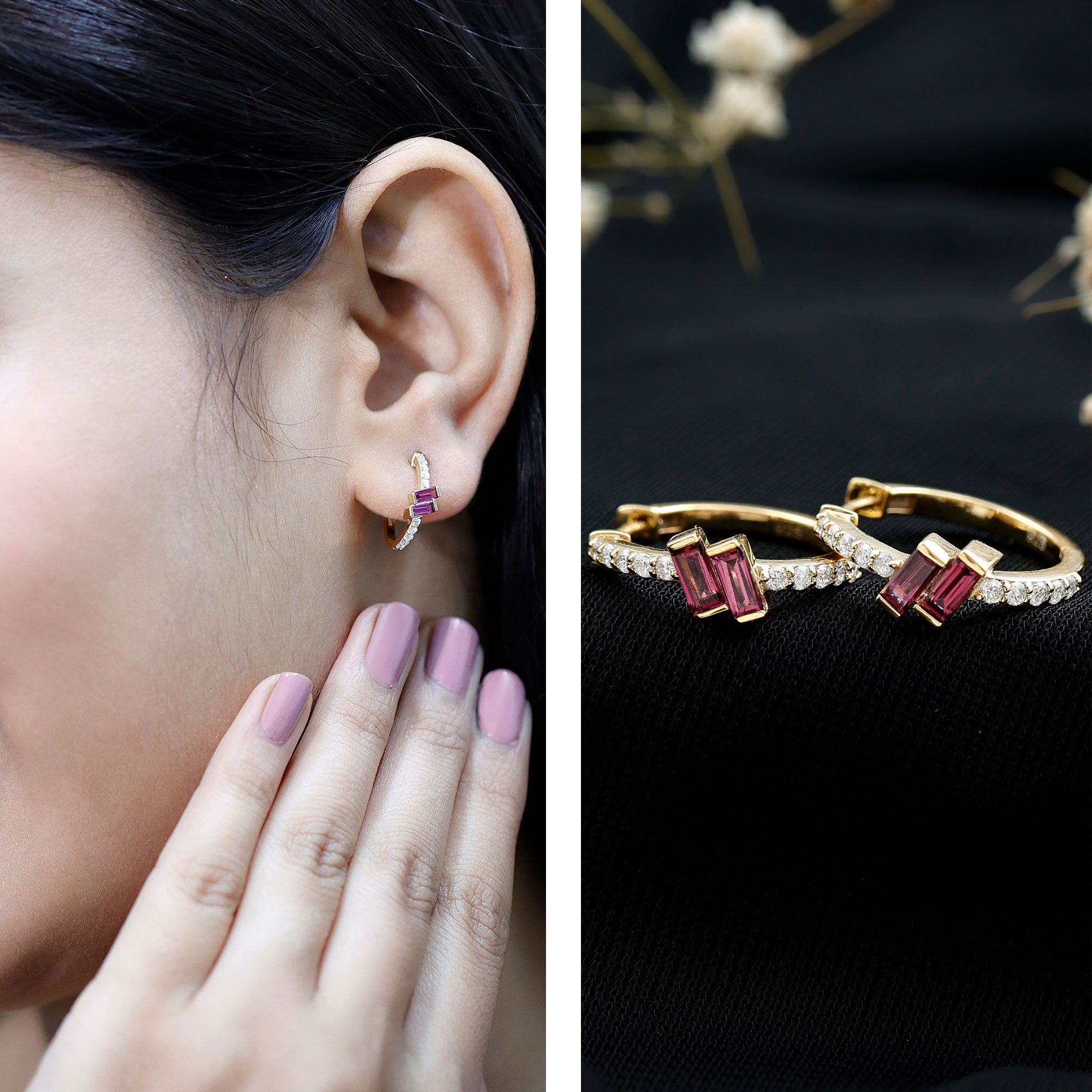 Add a vibrant touch of elegance to your everyday style with these beautifully crafted Rhodolite Hoop Earrings. They feature striking 2X4 MM baguette cut Rhodolite gemstones, securely set in bar setting at the front of the hoop. Decorating the hoop are round lab grown diamonds, carefully placed to a touch of sparkle. Crafted in 14k yellow gold plated sterling silver, the Hinged Hoop Earrings are both durable and lightweight, ensuring all-day comfort without compromising on elegance. These Rhodolite and Diamond Earrings are versatile enough to be worn with anything, from your casual work outfit to your evening wear. Whether you are dressing up for a night out or just want to elevate your daily style, they offer a refined, luxurious touch that fits any mood or occasion. This pair is made with precision and care, featuring AAA quality rhodolite and EF-VS quality lab grown diamonds. Packaged in a signature gift box and accompanied by a certificate of authenticity, these Small Hoops also make a meaningful gift for birthdays, anniversaries, or simply to treat yourself.