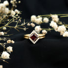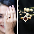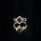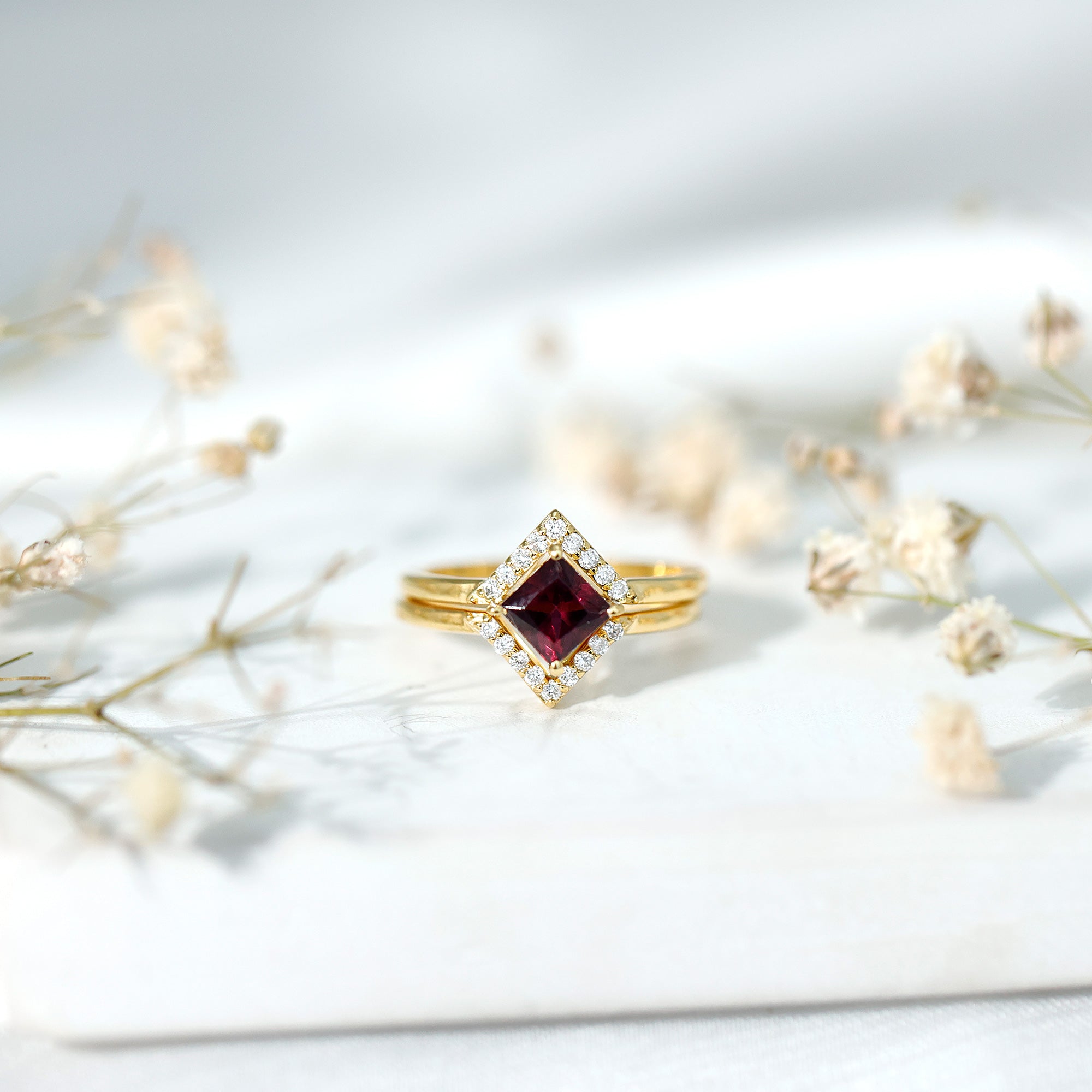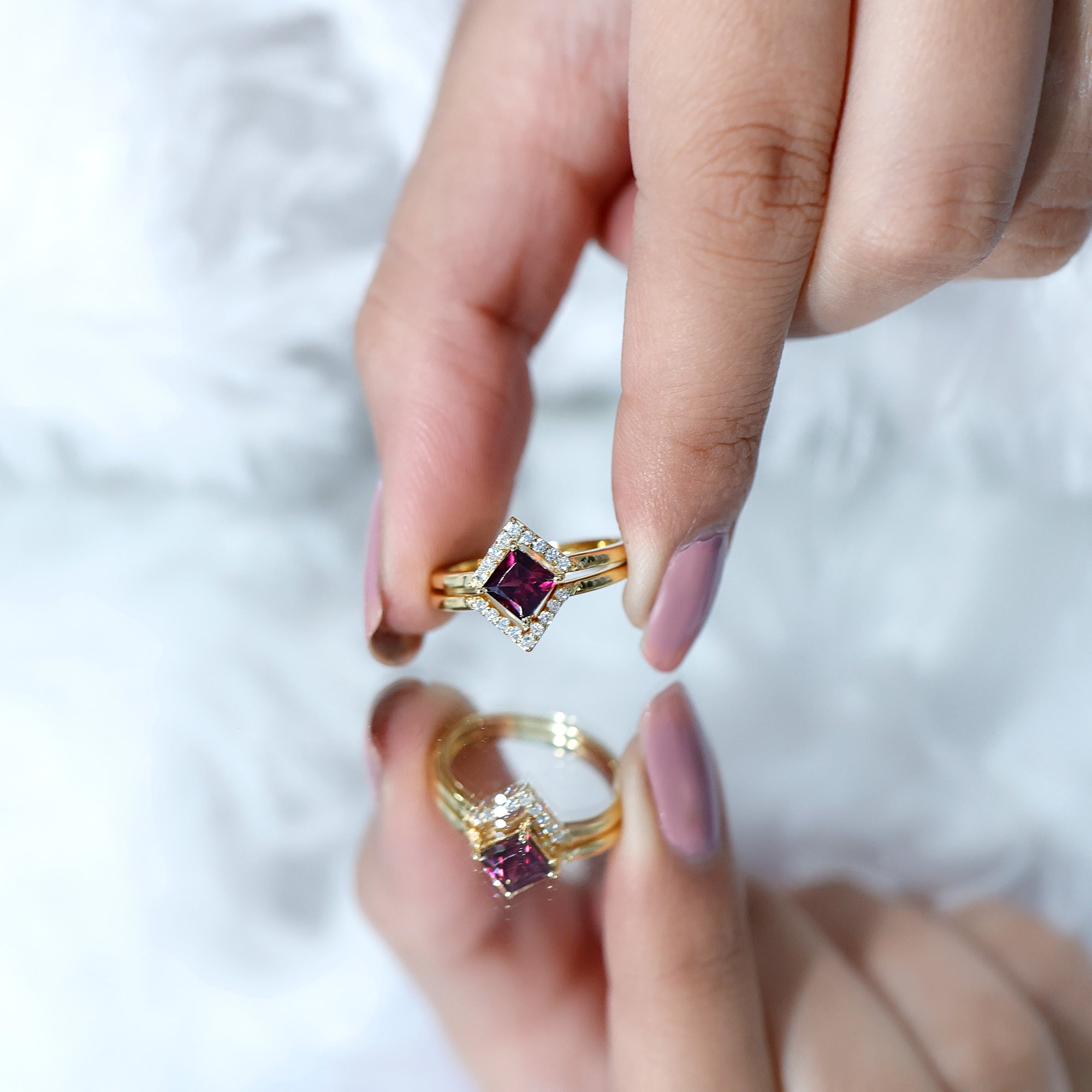 Bold yet elegant, modern yet timeless, this Rhodolite Garnet Wedding Ring Set is made for the kind of love that is anything but ordinary. Crafted in 14k yellow gold plated silver, this 2 Piece Bridal Ring Set beautifully balances classic design with soft emotion. The engagement ring features a stunning 5 MM princess cut rhodolite, held securely in prong setting. Enhancing the center stone are round lab grown diamonds gently hug the base, forming a subtle triangular frame that adds a refined sparkle and visual balance. Paired with it is a perfectly matched V-shaped wedding band, lined with round lab grown diamonds, creating a sleek contrast to the central ring. When stacked together, the two rings nestle into one another effortlessly, symbolizing how two hearts can fit perfectly into one beautiful life. Designed for the modern romantic, this Engagement Ring and Wedding Band Set is thoughtfully made. The AAA quality rhodolite and EF-VS quality lab grown diamonds ensure superior sparkle and durability, making it a keepsake that stands the test of time.
