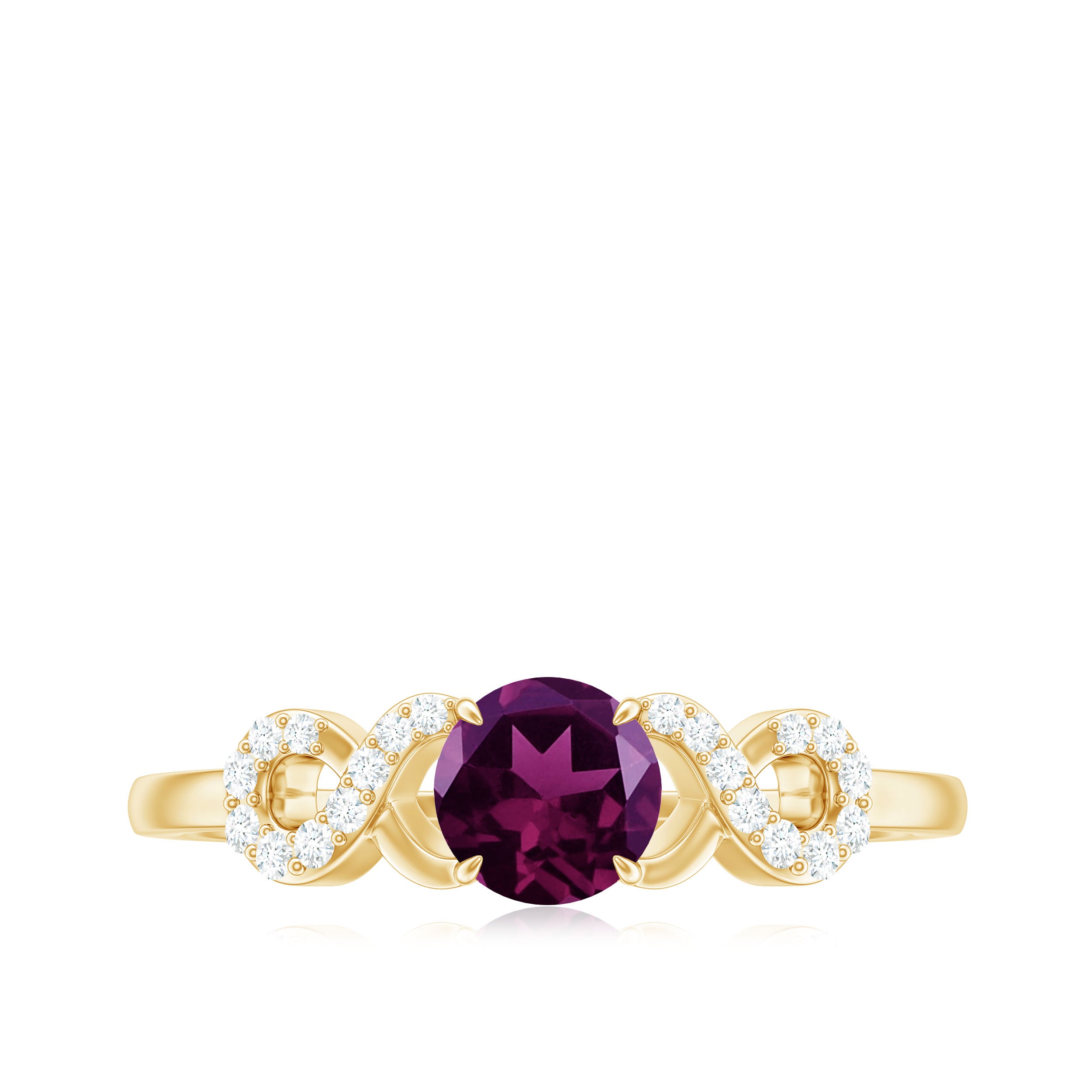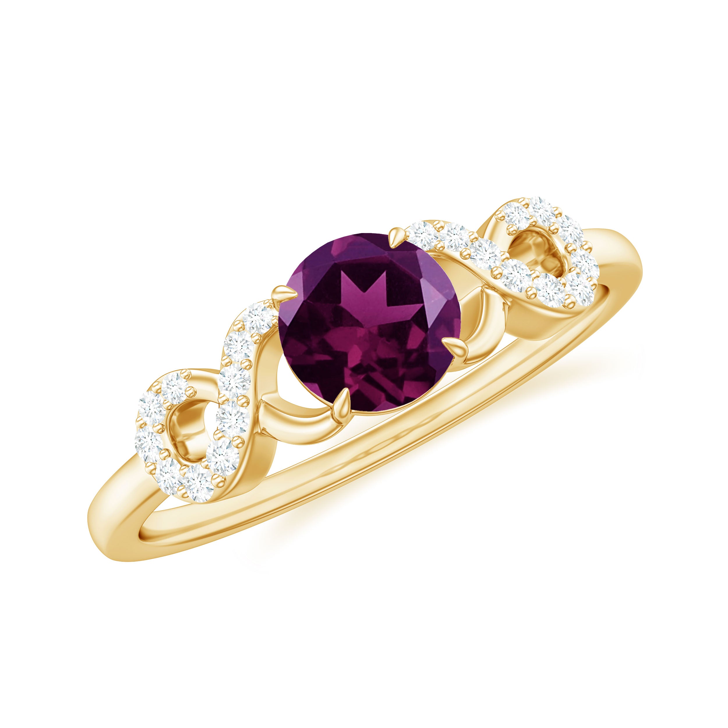 This stylish and fashionable criss cross engagement ring is the perfect match for your love. The solitaire ring is adorned with a round-shaped Rhodolite stone set as a solitaire in a claw setting, and features round Diamond stones set over a criss cross shank.
