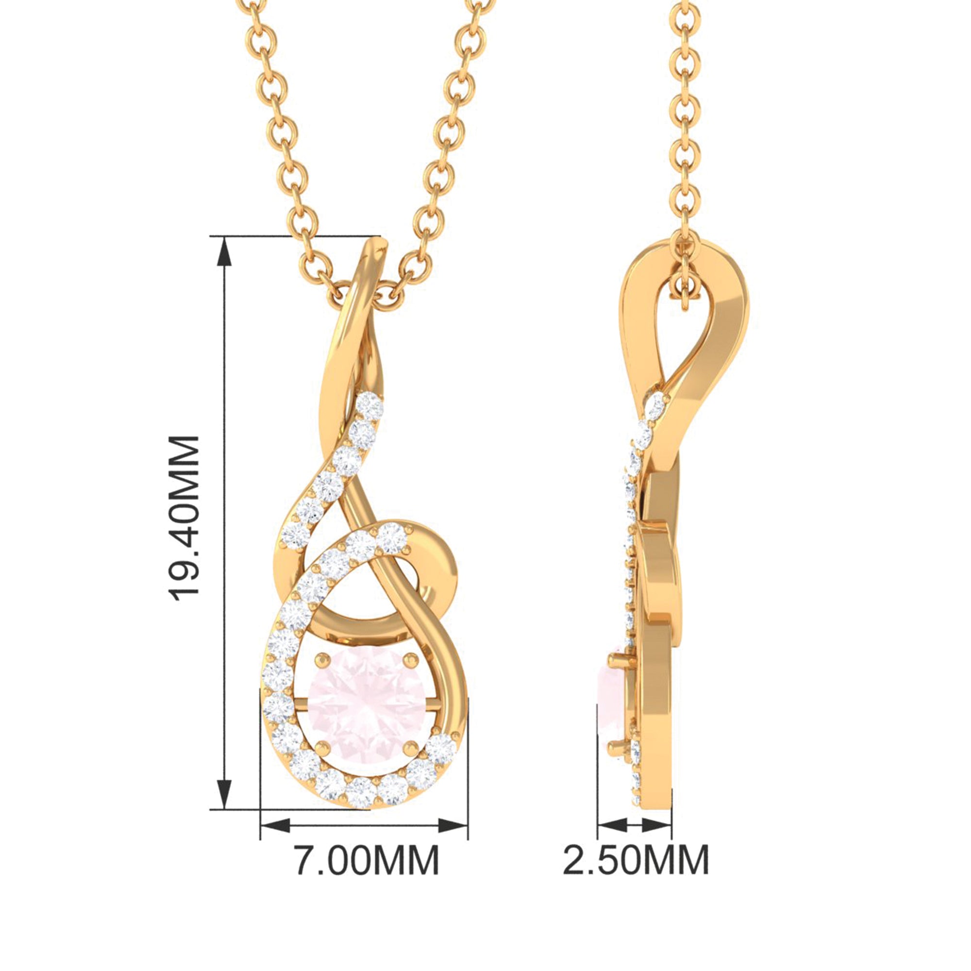 The rose quartz twisted pendant with diamond is a whimsical melody of love and grace. The twisted design of the pendant evokes the feeling of a dance, and the rose quartz gemstone shimmers with a soft, ethereal glow. This stunning piece features a 5 MM round rose quartz center stone encased in a twisted design encrusted with small sparkling diamonds. Wearing this pendant, you will feel like a fairy princess, dancing through a garden of love and enchantment.