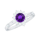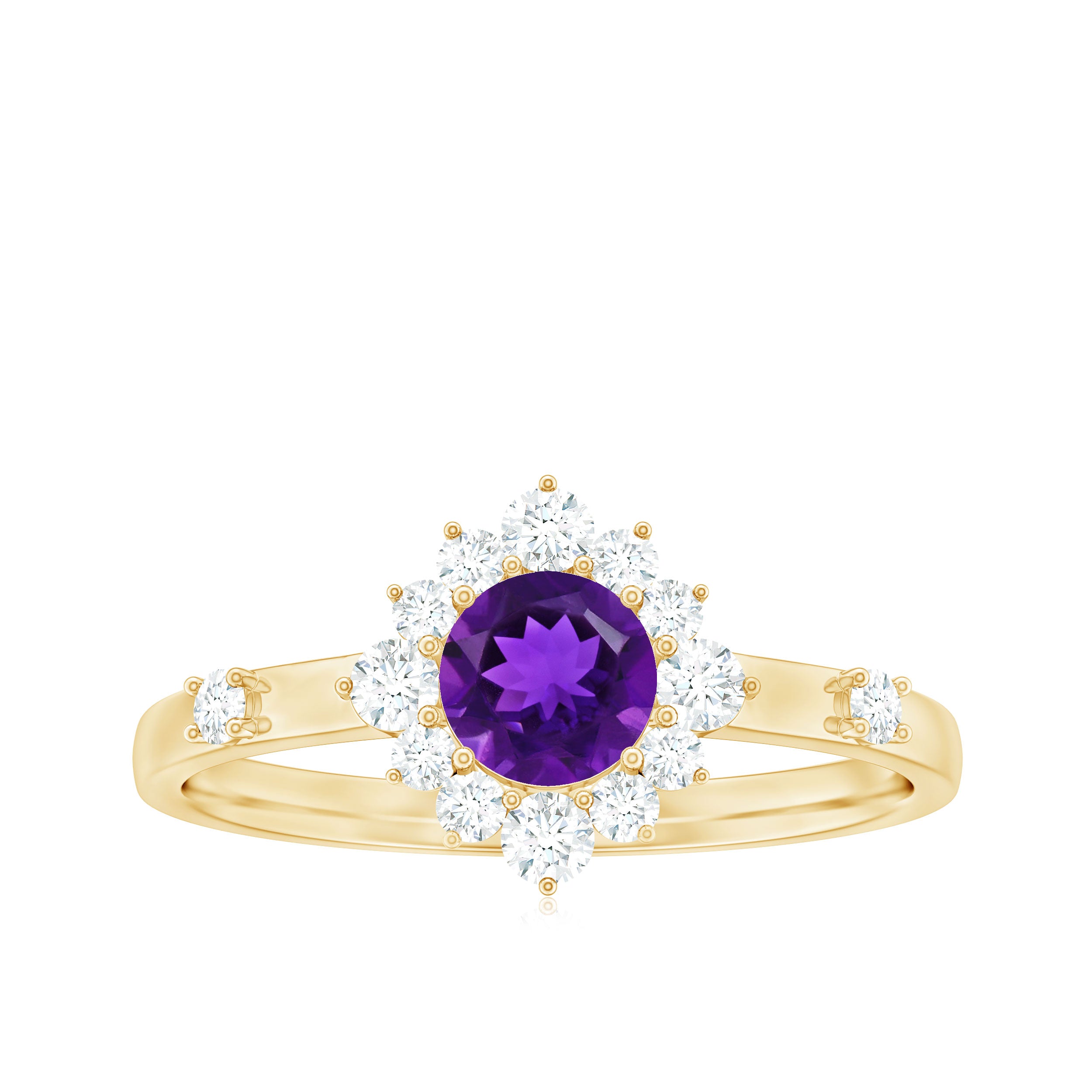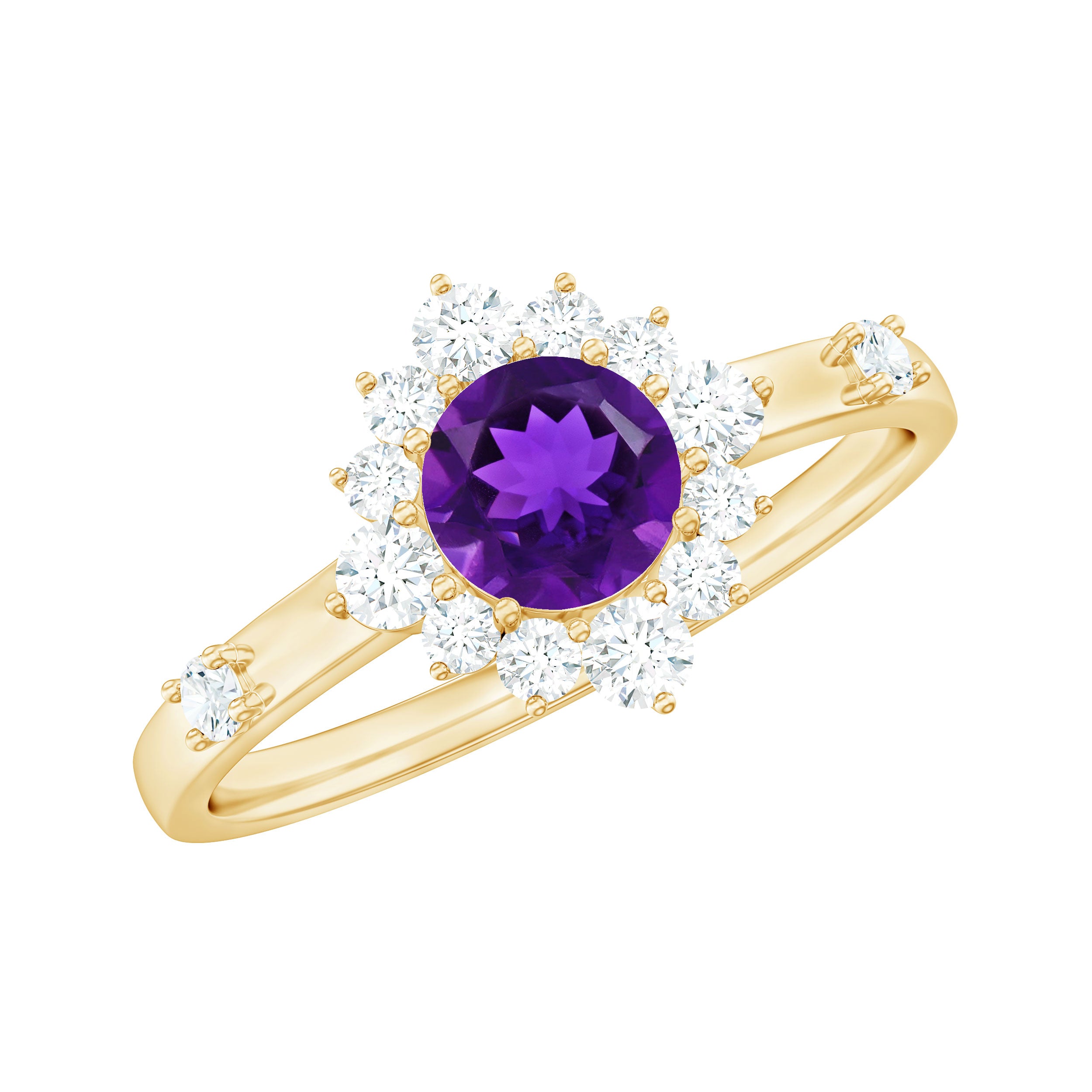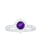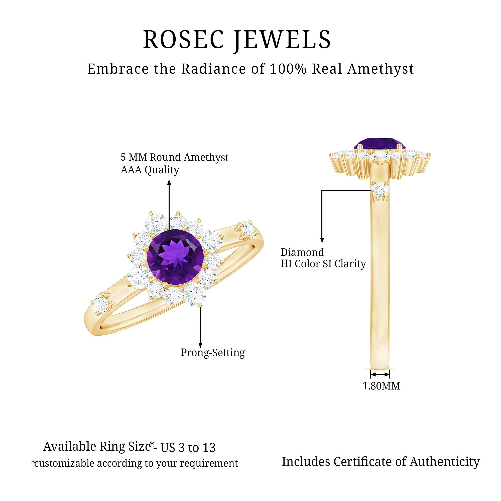 Fancy everything floral and royal? Look no further than this Amethyst Flower Halo Ring! Making it stand out for its vibrant allure, the 5 MM Round Shape Amethyst held by Prong Setting sits pretty at the center. The floral halo of Round Shape Diamond surrounds it, mimicking the ever-blooming petals of a full-grown flower, evoking a sense of surreality. The band is further shimmered up with Round Shape Diamonds on either sides. A modern day classic, this Certified Amethyst Flower Ring strikes the perfect balance between elegant and statement-making.