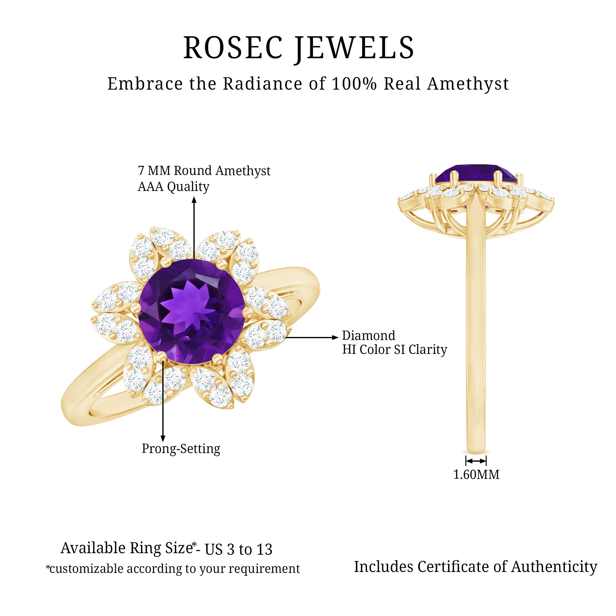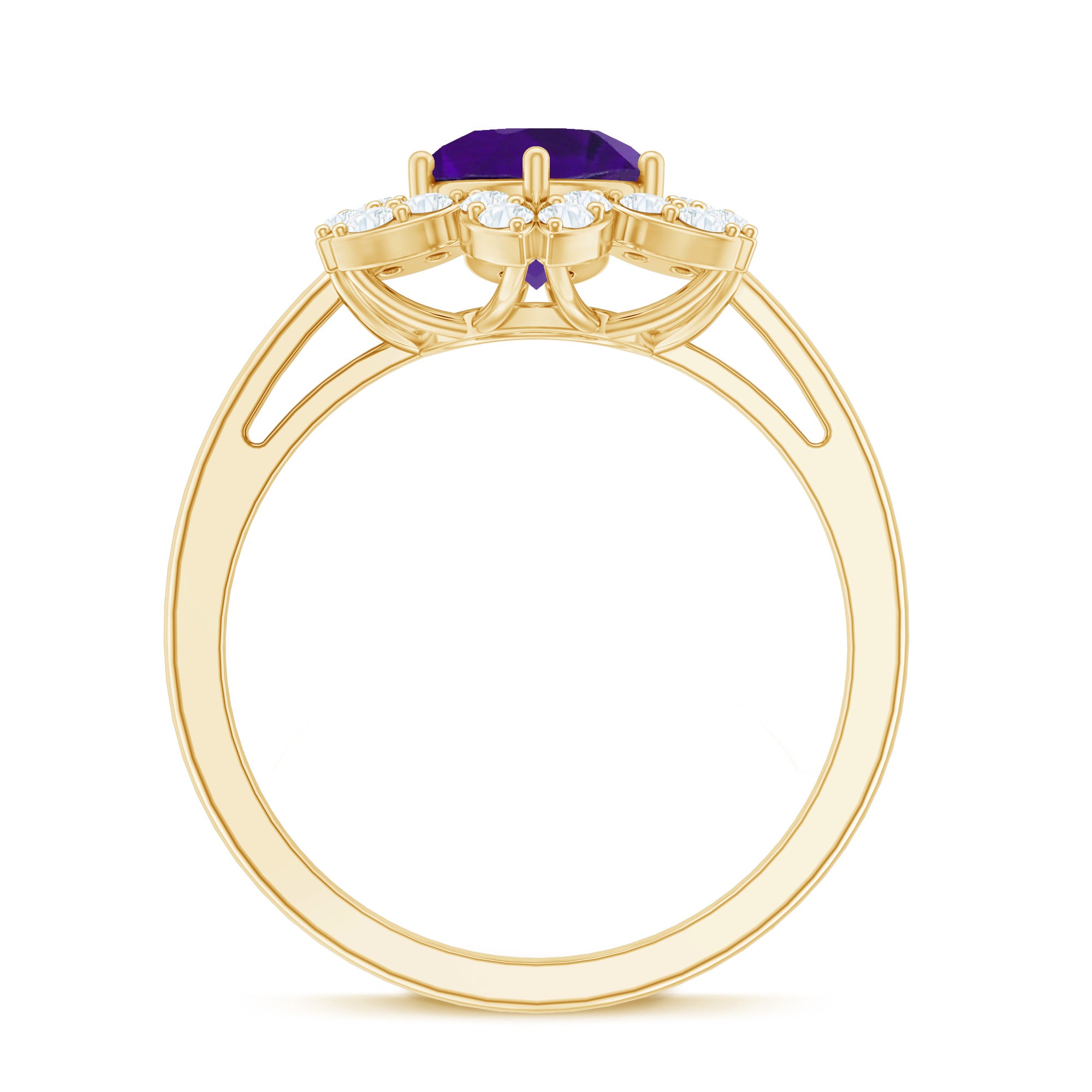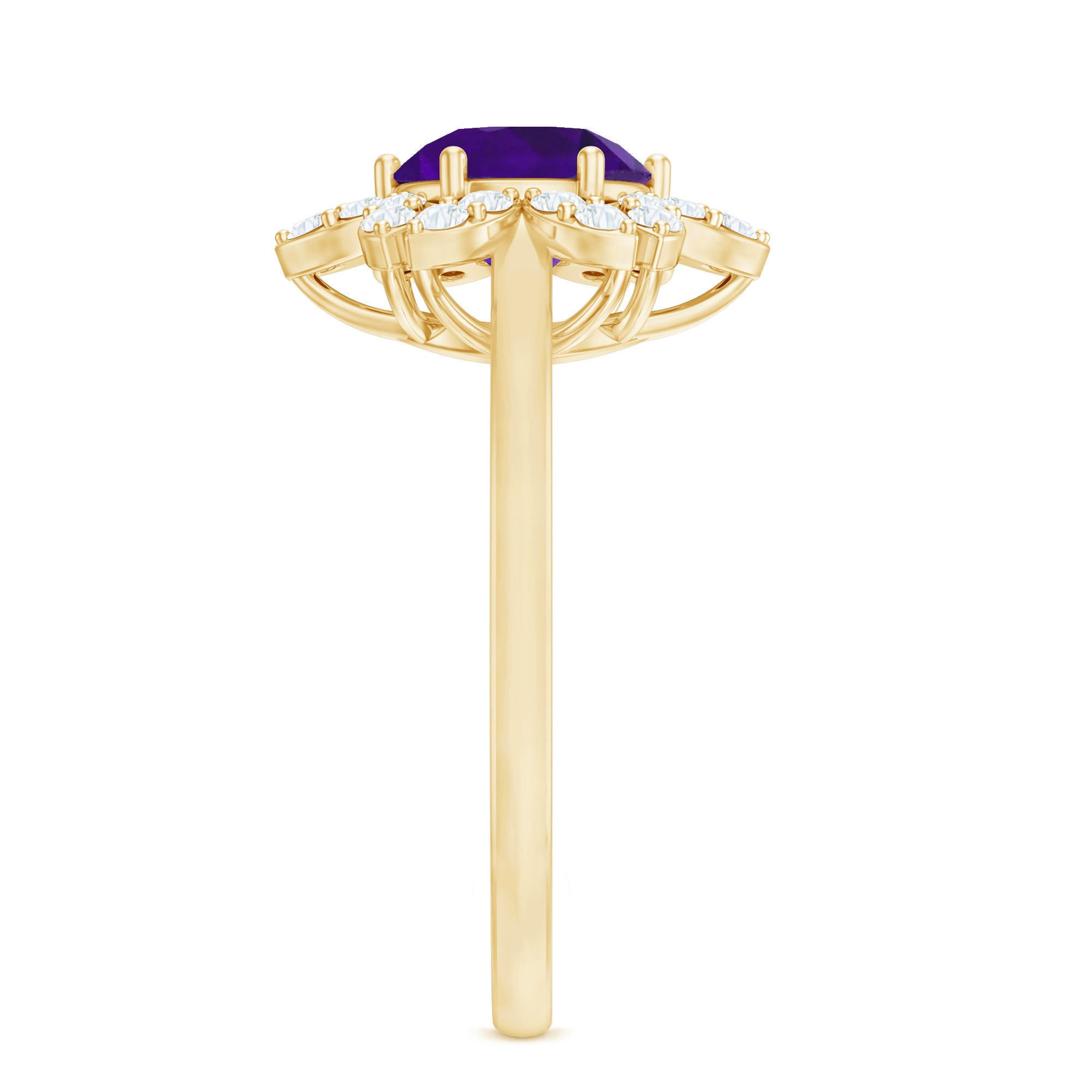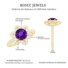 Intensify your love with this Flower Engagement Ring that represents eternal love. This Engagement Ring is adorned with Round Shape Amethyst in the center in a 6-prong setting with Round Diamond in a Halo. This Amethyst Engagement Ring is mounted in Gold Metal.