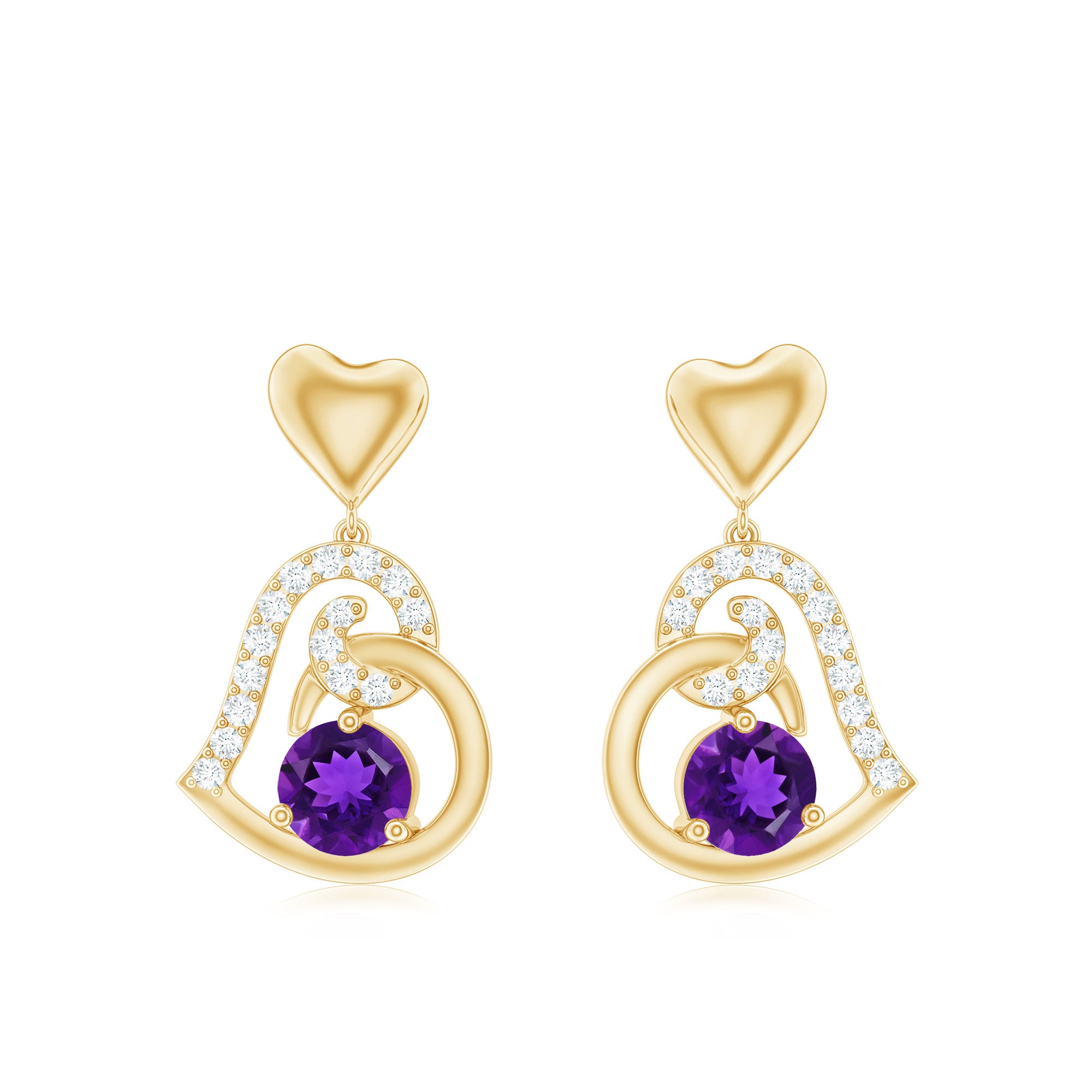 Present these Heart Drop Earrings as a sparkling testament to love, elegance and timeless beauty. Each earring features a 5 mm Round Shape Amethyst placed in an open heart frame, delicately lined with dazzling Diamond stones that catch the light with every movement. Dangling gracefully from a heart motif, these Amethyst Drop Earrings create a romantic cascade of shimmer, perfectly capturing the essence of affection and devotion. The rich purple hue of the Amethyst symbolizes passion and wisdom, while the sparkling Diamond stones add a touch of celestial brilliance, making these Amethyst Heart Earrings a captivating statement for any occasion. Crafted with a secure Screw Back Closure, they offer comfort without compromising style, allowing her to wear them all day or night with confidence. Beautifully presented in a signature jewelry box, these Amethyst Earrings for Women make an unforgettable gift for anniversaries, birthdays or simply as a heartfelt surprise. Romantic, sophisticated and endlessly versatile, these Amethyst Diamond Earrings are a celebration of love and a timeless treasure designed to make her heart flutter every time they catch the light.