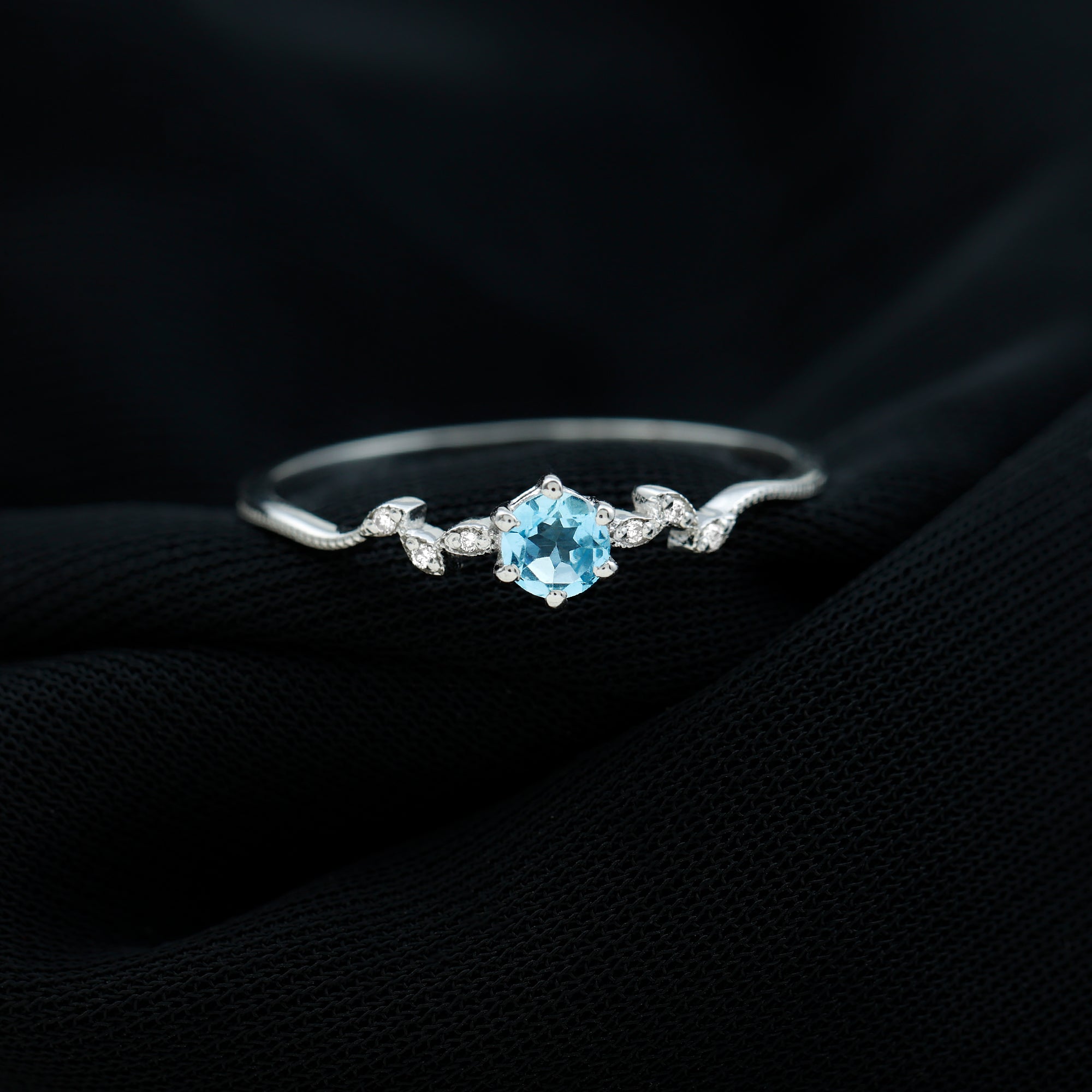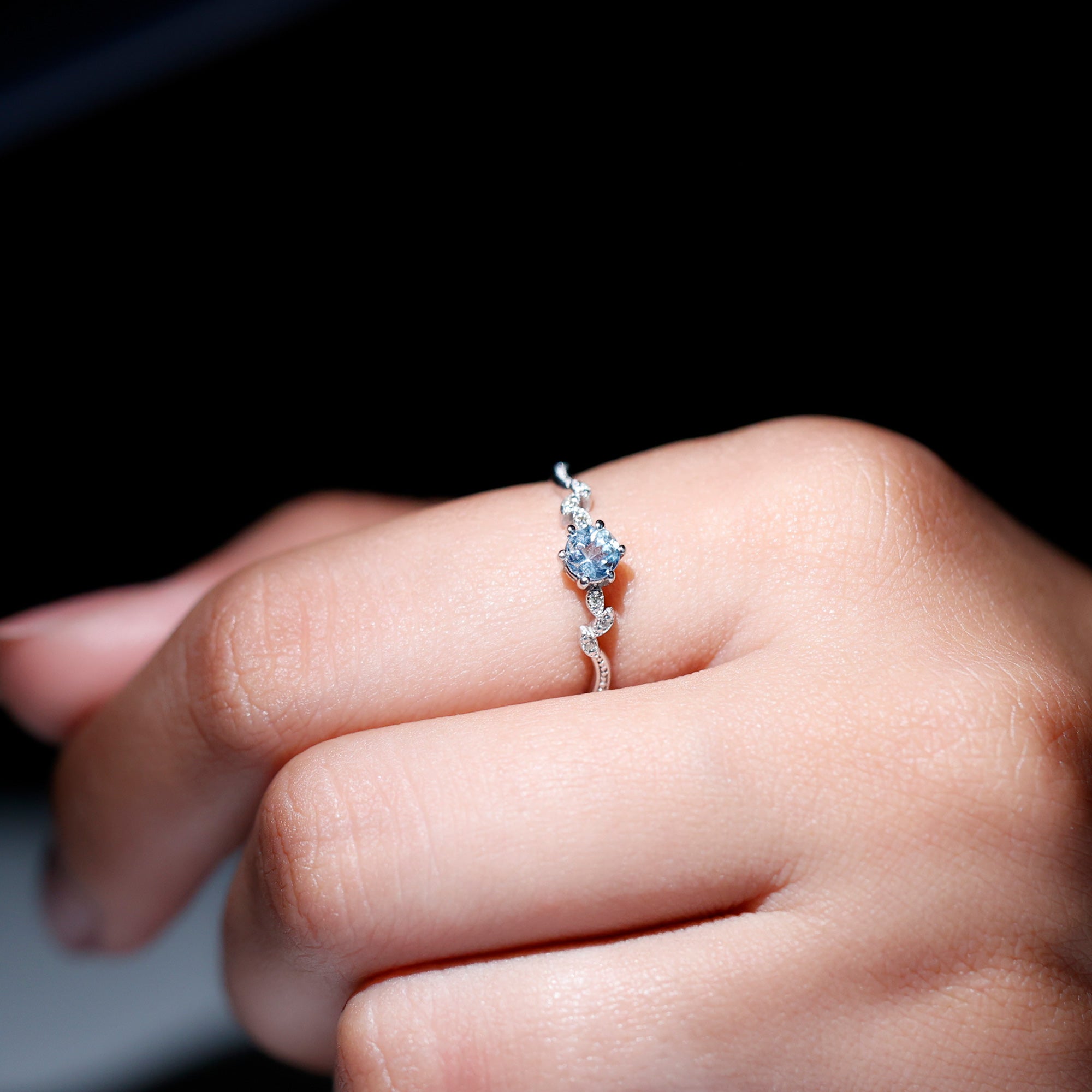 Embrace elegance and sophistication with this dainty Aquamarine Ring, perfect for everyday wear. The 4 MM Round Cut Aquamarine is set in a secured Prong Setting, with a Diamond-adorned leaf branch and Beaded details all over on the Promise Ring, creates a stunning and unique piece. This Round Promise Ring beholds the shine of AAA Quality Aquamarine and HI-SI Quality Diamonds which makes it perfect for making the promise of love. This Certified Aquamarine Ring will be delivered in the classic jewelry box with the certificate of gemstone authentication.