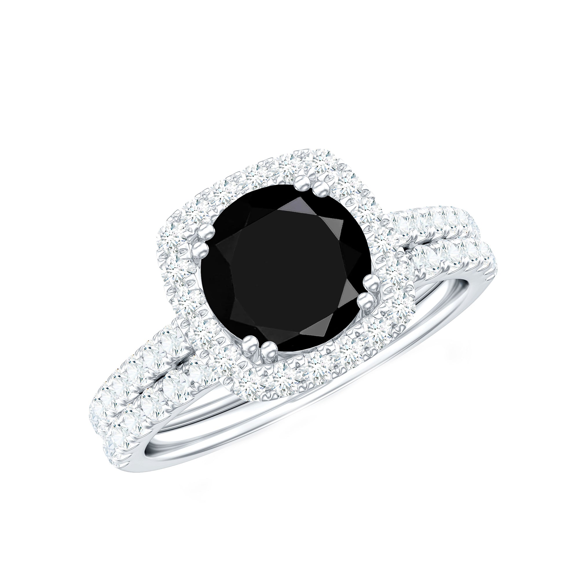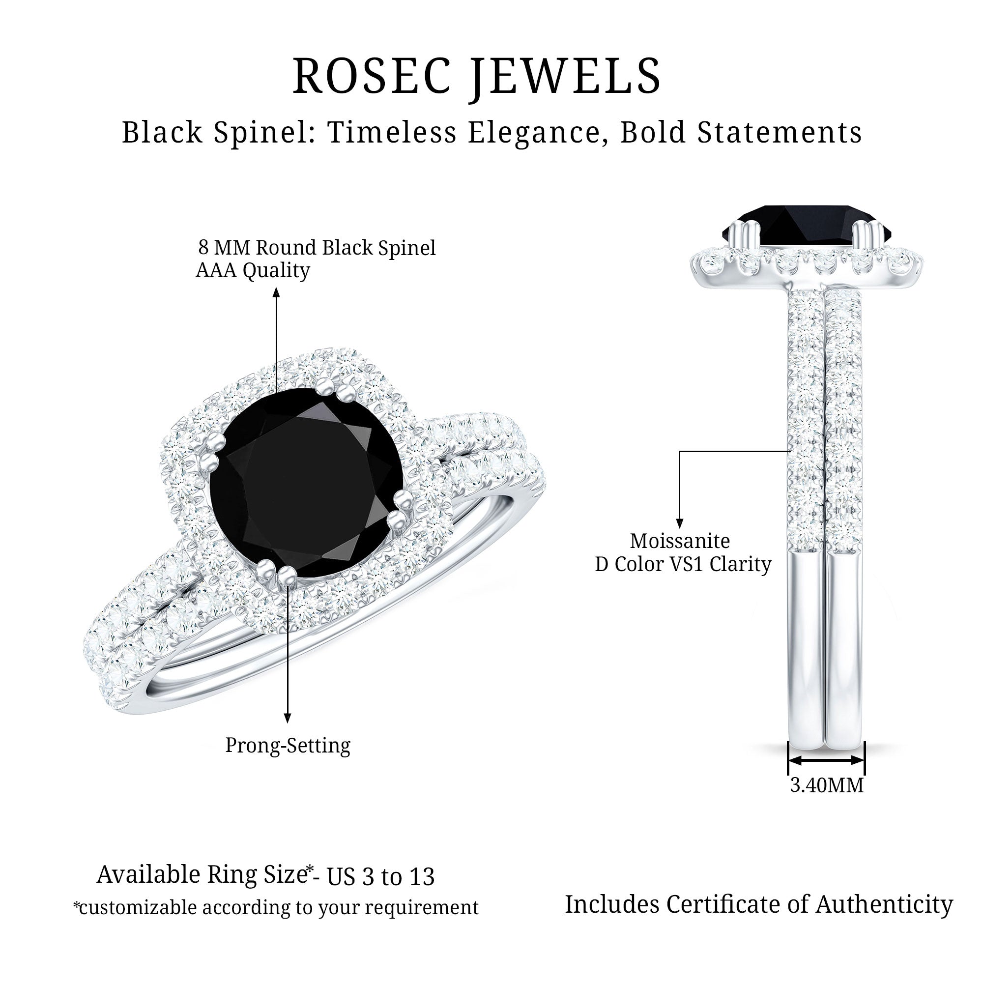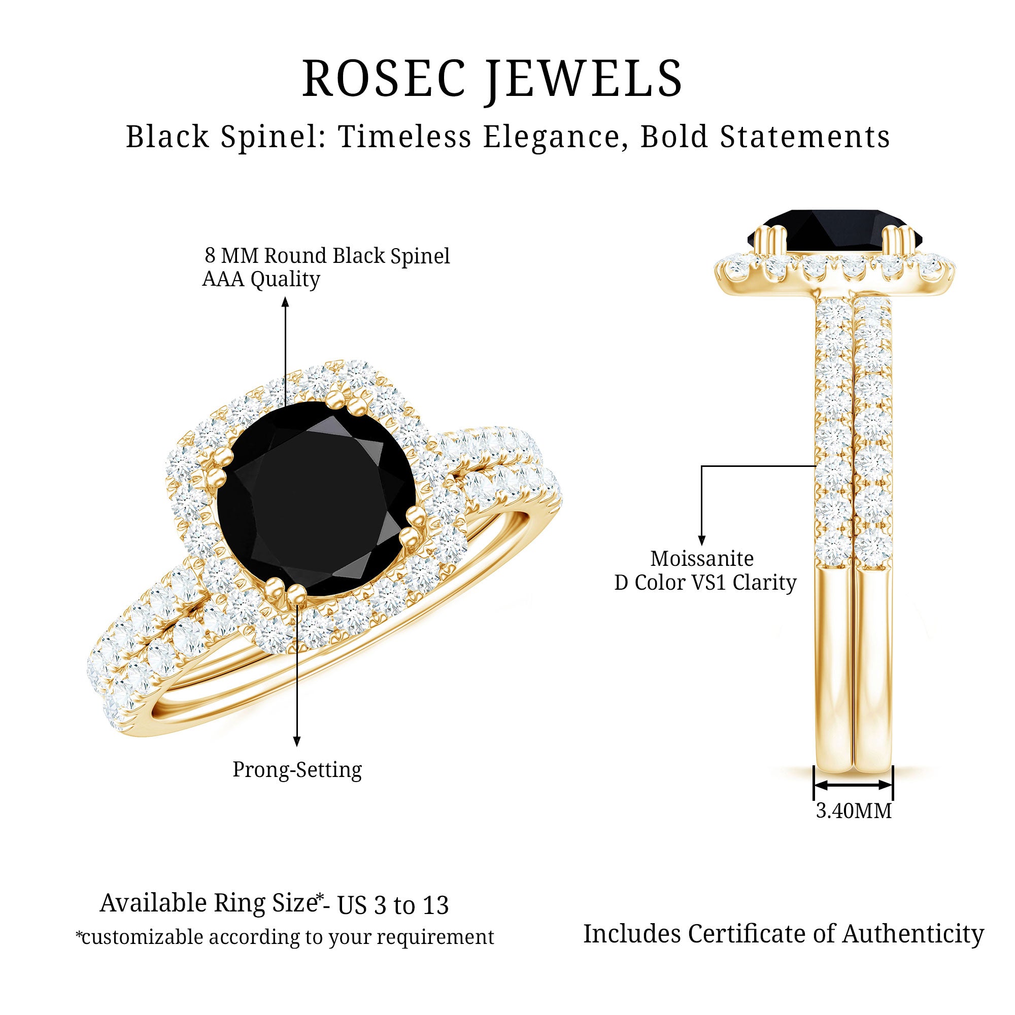 With the Round Cut Black Spinel in the center in Double Prong Setting and Moissanite on the Band is a timeless piece of your jewelry collection.