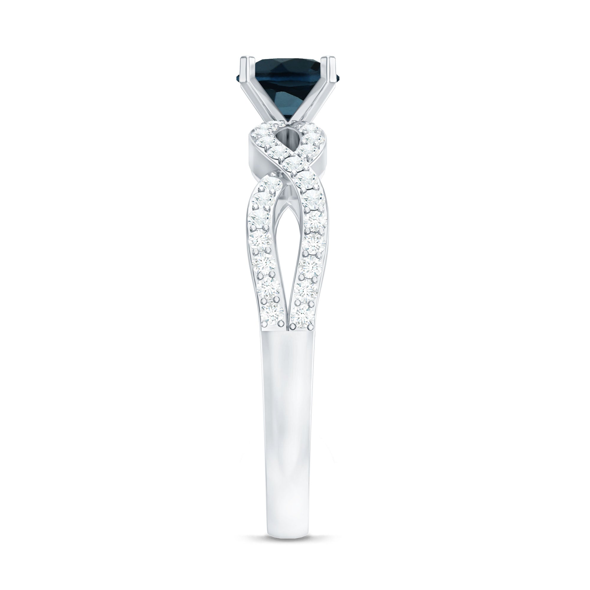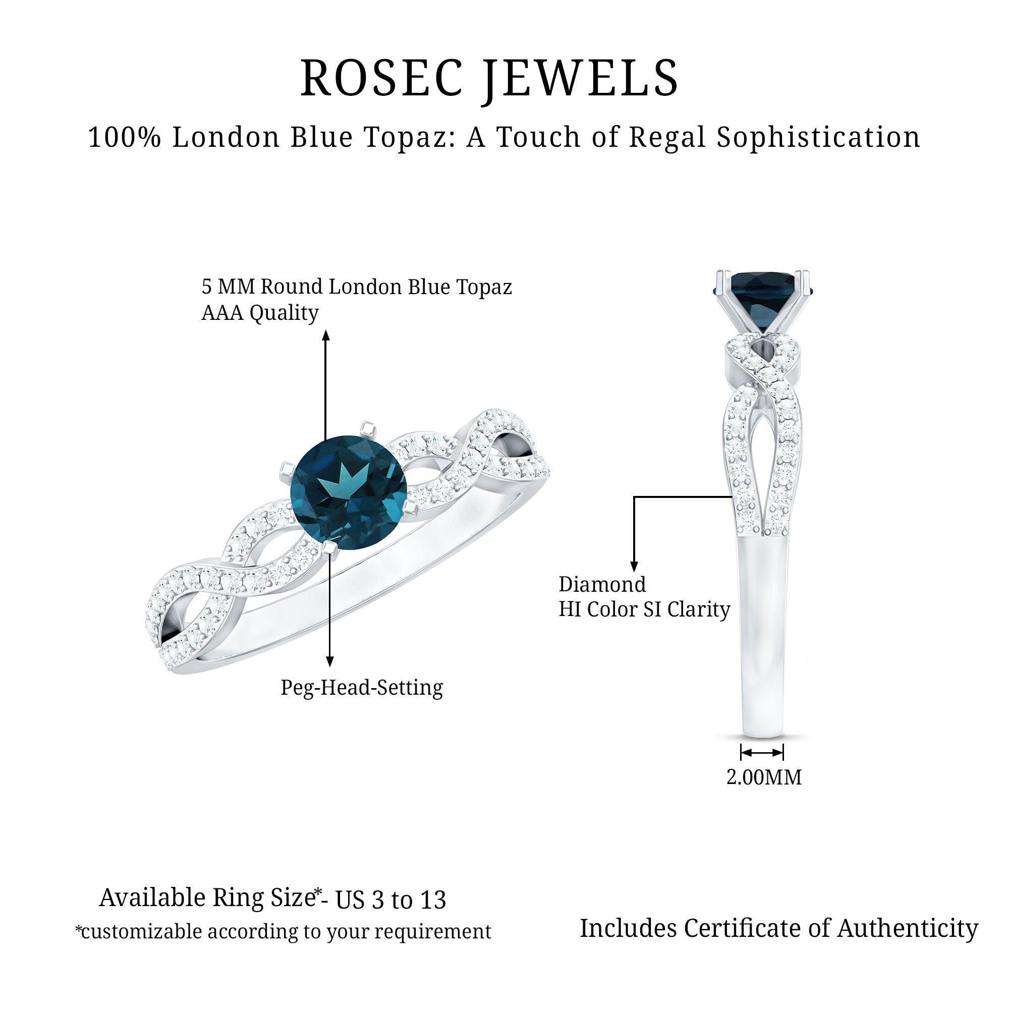 If you are looking for a ring that says FOREVER in the most beautiful way, this London Blue Topaz Engagement Ring might just be the one. It features a 5 MM round cut london blue topaz, carefully held in prong setting that lets the stone shine. The infinity style band gently twists and stands for forever love and the journey two people take together. To make this Infinity Band Engagement Ring even more stunning, the band is decorated with tiny and sparkling diamonds that add soft shimmer and highlight the center stone. The mix of shine and thoughtful design gives this piece a romantic and graceful look that works for everyday wear and special moments alike. Crafted with care using AAA quality London Blue Topaz and HI-SI quality diamonds, this Crossover Ring is made to last and be cherished for years. It is available in a wide range of ring sizes, so you can get the perfect fit. Whether you are planning a big moment or just want to show someone how much they mean to you, this Blue Topaz and Diamond Ring brings beauty, comfort, and meaning all in one. It also comes with a certificate of authenticity for the gemstone, giving you peace of mind that you are getting something truly special.