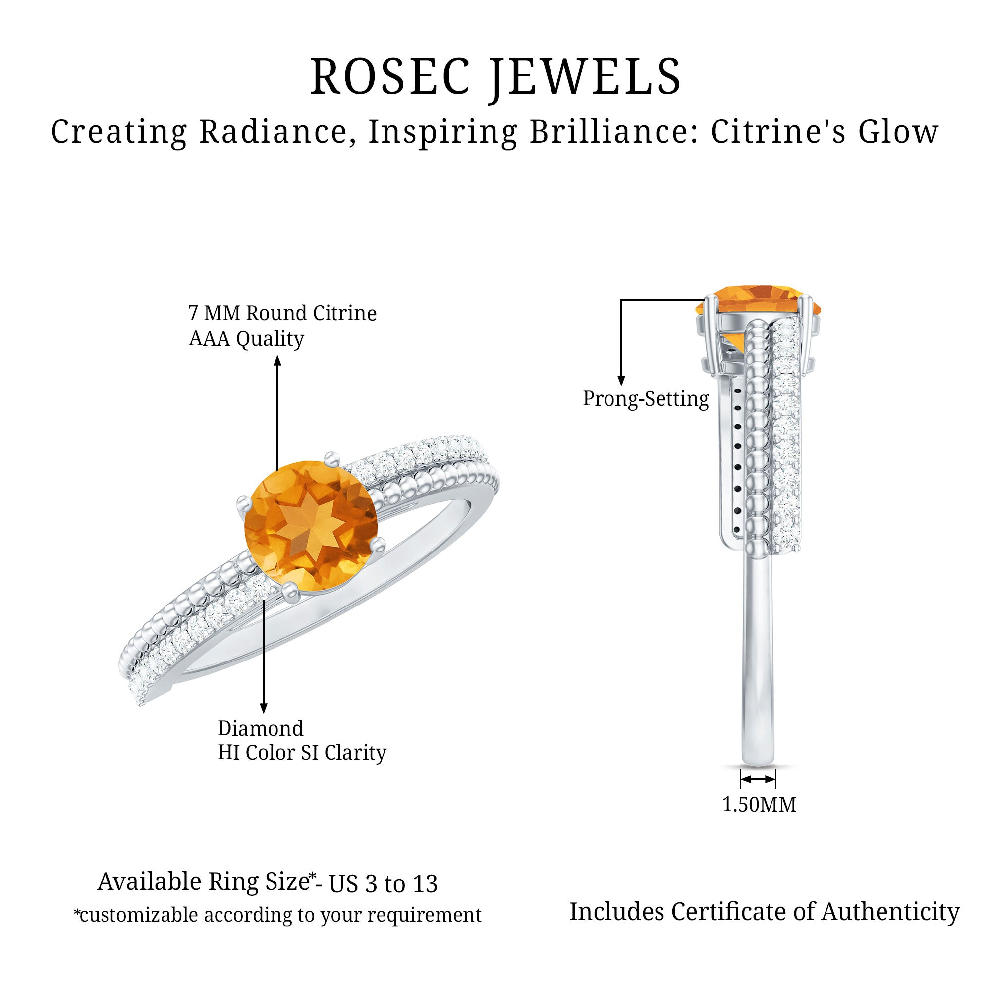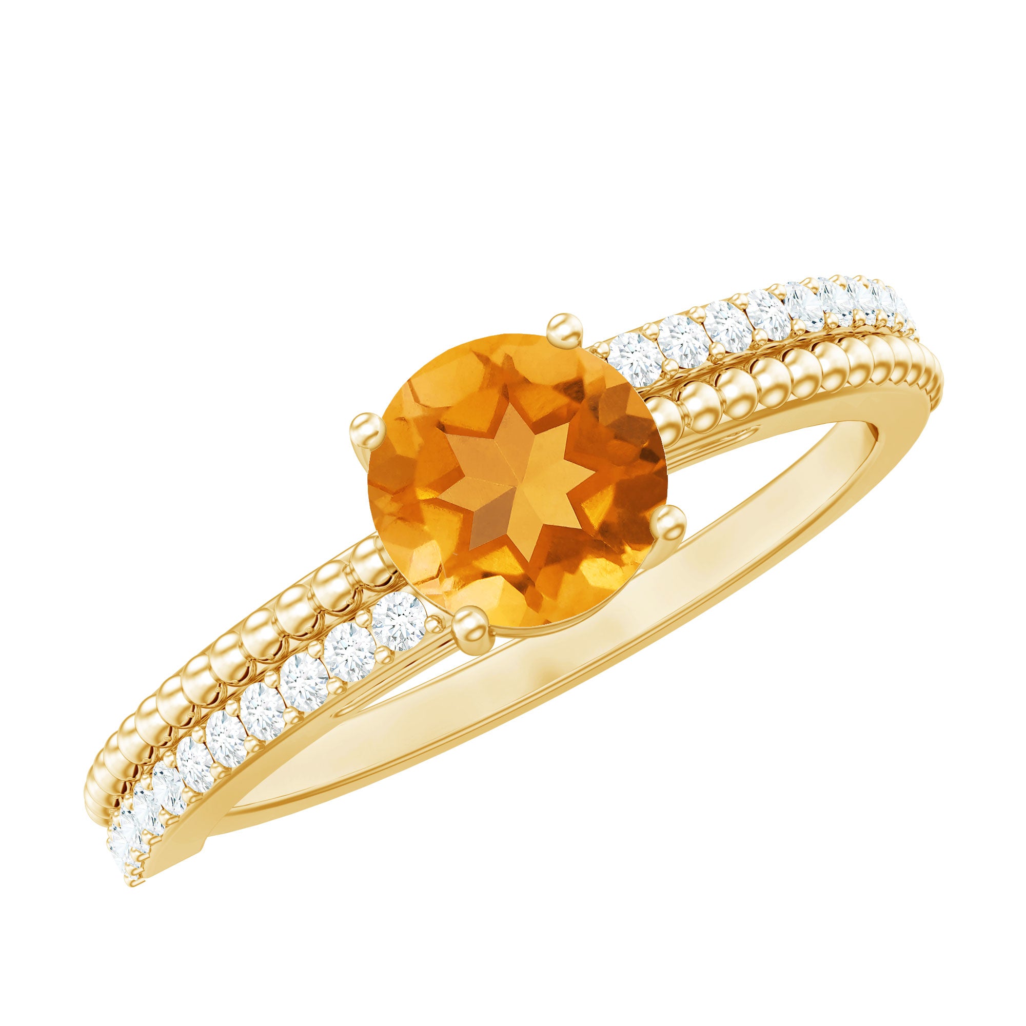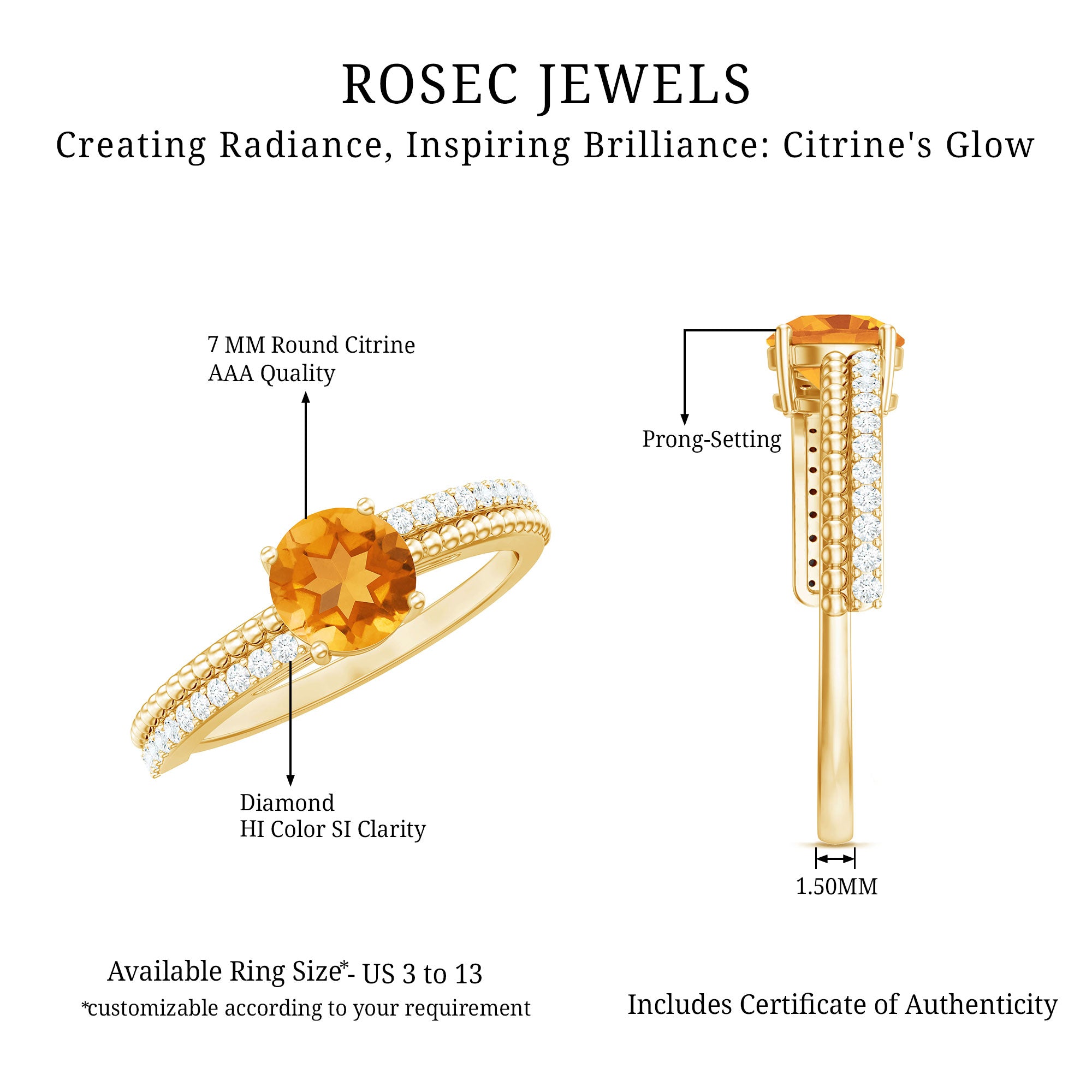 The stunning Solitaire Engagement Ring features a 7 MM Round Shape Citrine secured by 4 Prong Setting and dainty Round Diamonds studded on the shank. Grab this Citrine Ring for your special one and make her heart flutter by presenting this ring as a Birthday or Anniversary Gift.