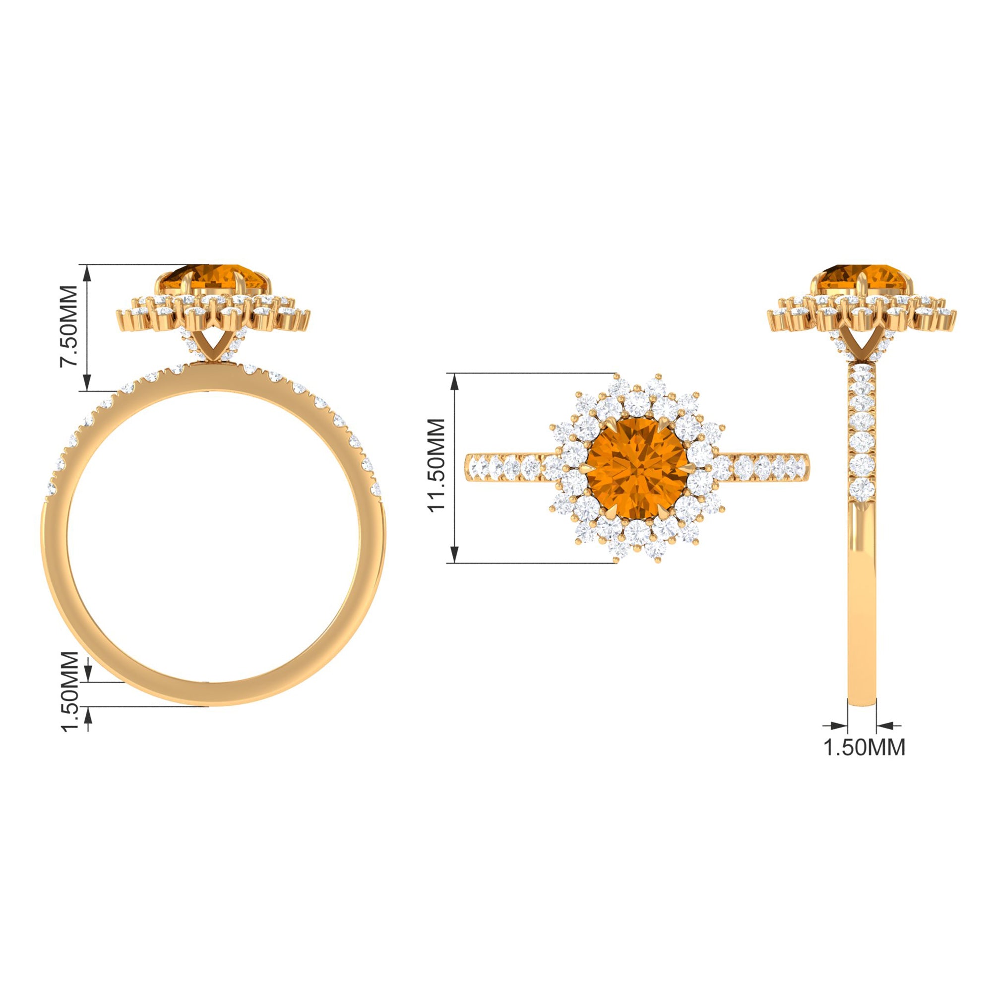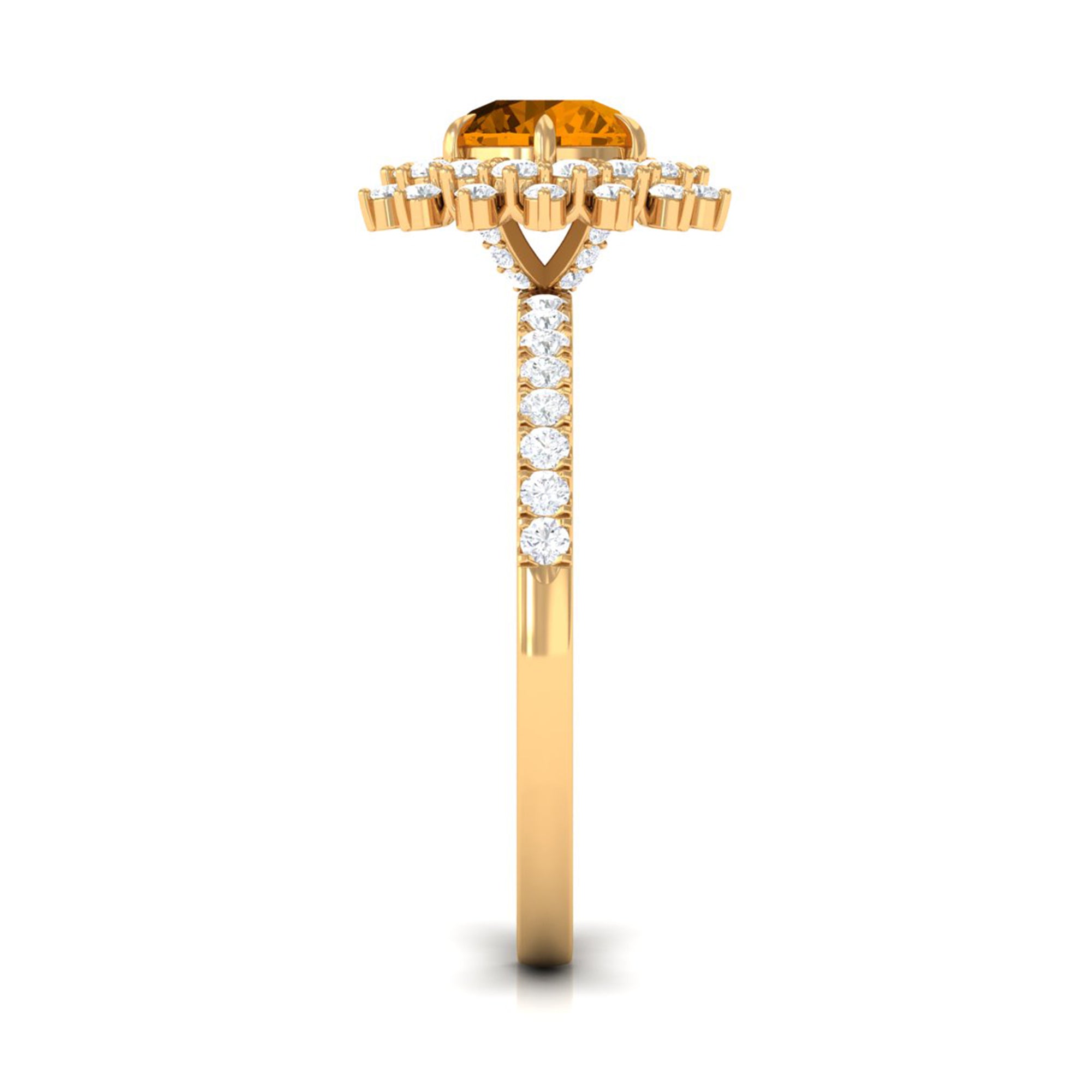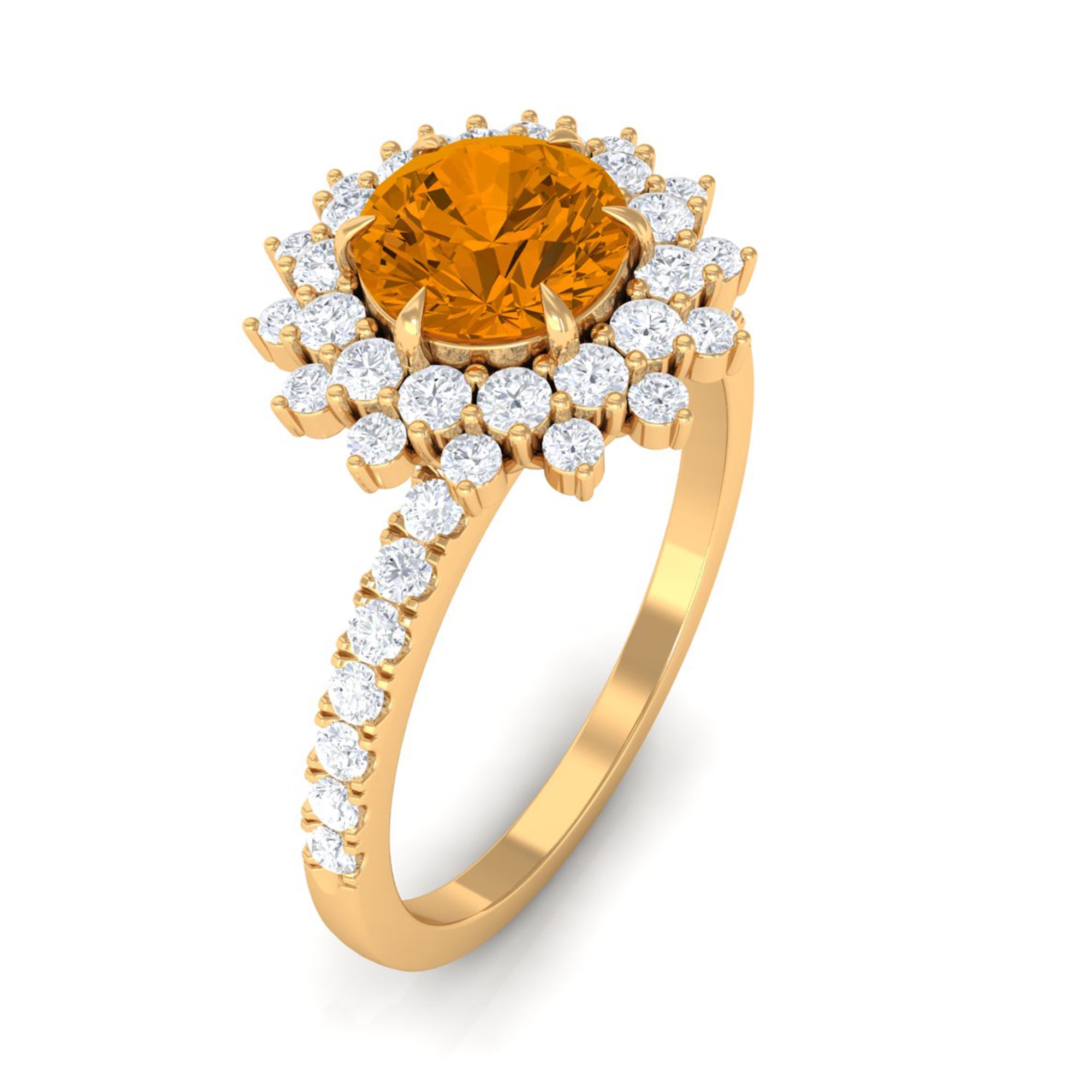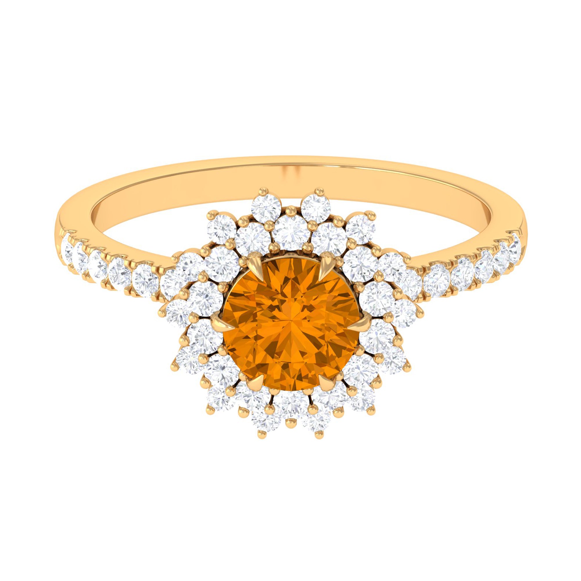 Crafted with a sumptuous appeal, this engagement ring features a stunning round Citrine held in a six-claw prong setting, surrounded by a captivating cluster halo of moissanite stones. The intricate design of this Citrine statement ring exudes a regal appearance and is crafted in gold. Impress your lady with your exquisite taste by gifting her this beautiful Citrine engagement ring.