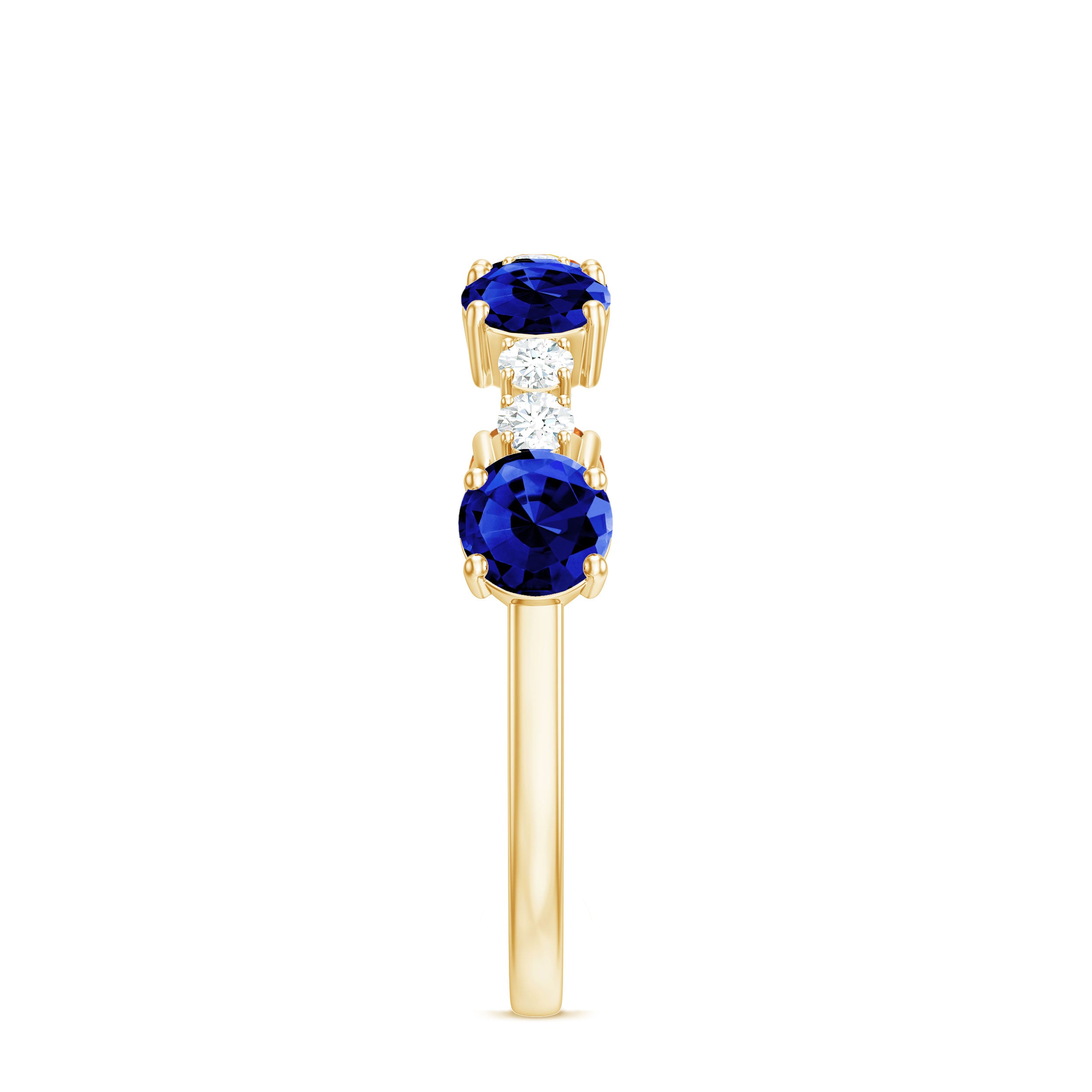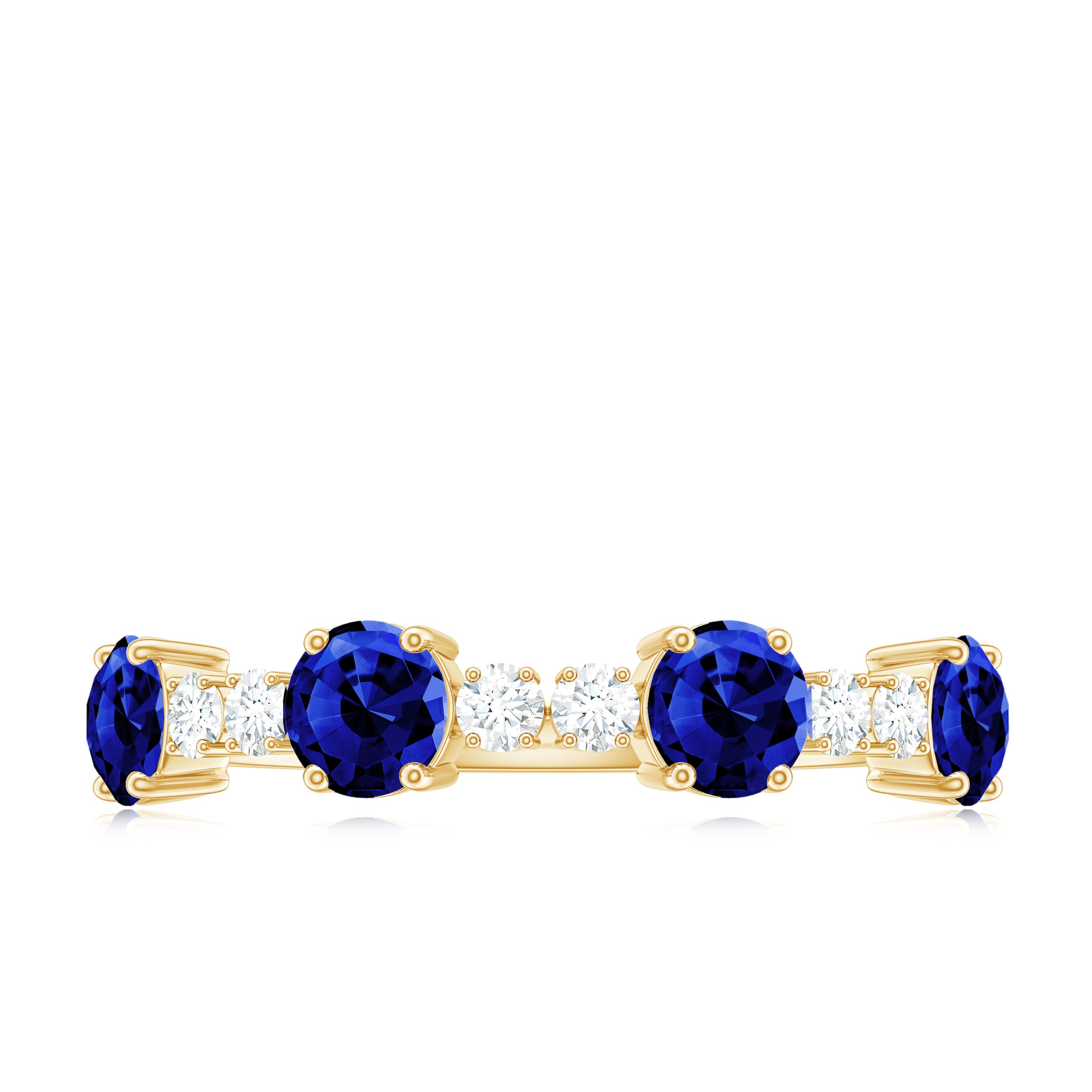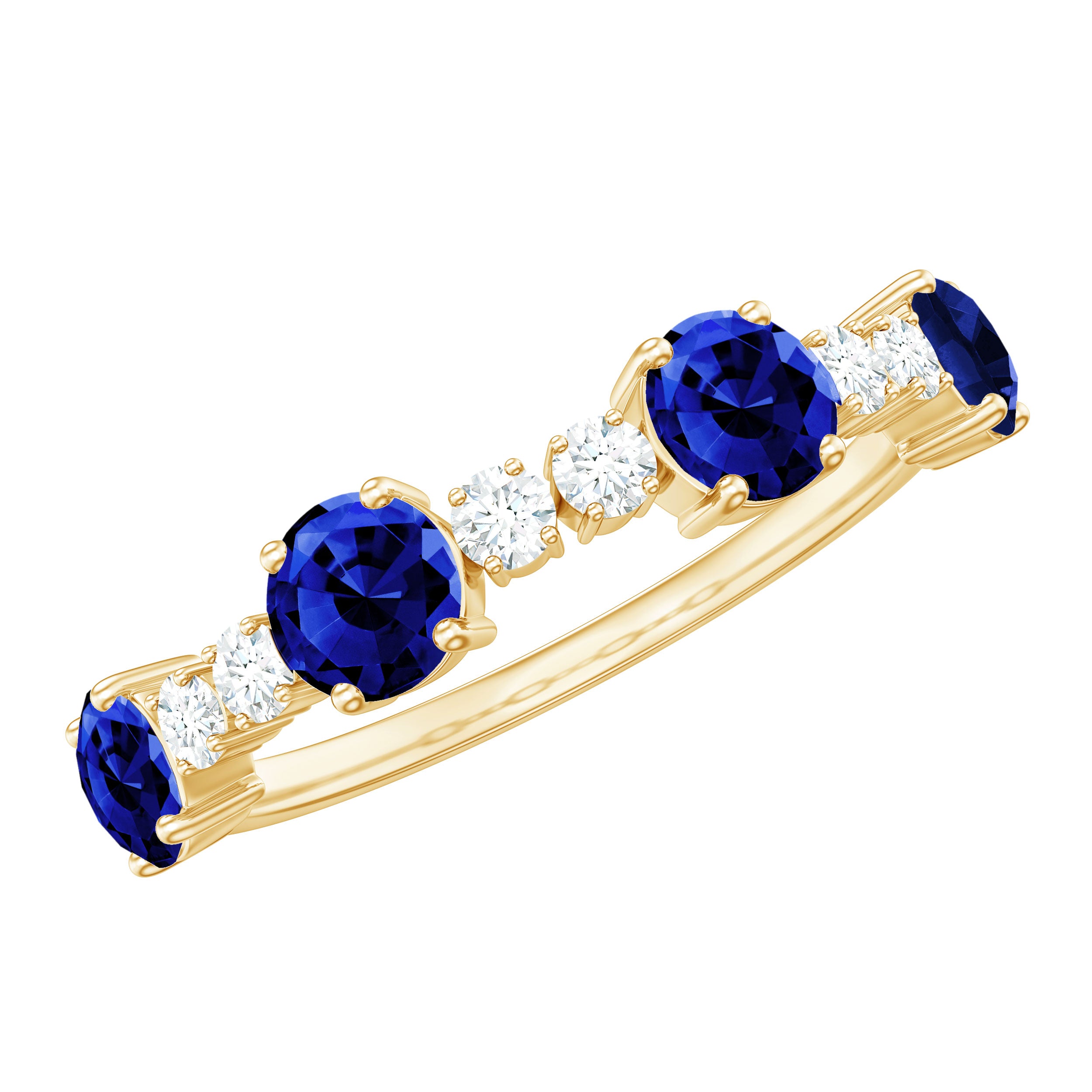 This is a stunning half eternity ring featuring round created blue sapphires and Diamond stones that alternate along the band. The classic band ring is crafted in beautiful gold, giving it a luxurious and sophisticated look. The created blue sapphire and Diamond are expertly set in the prong setting, adding a pop of color and sparkle. Whether youre looking for a special gift, or simply a new piece of jewelry to add to your collection, this round created blue sapphire eternity ring in gold is a gorgeous choice.