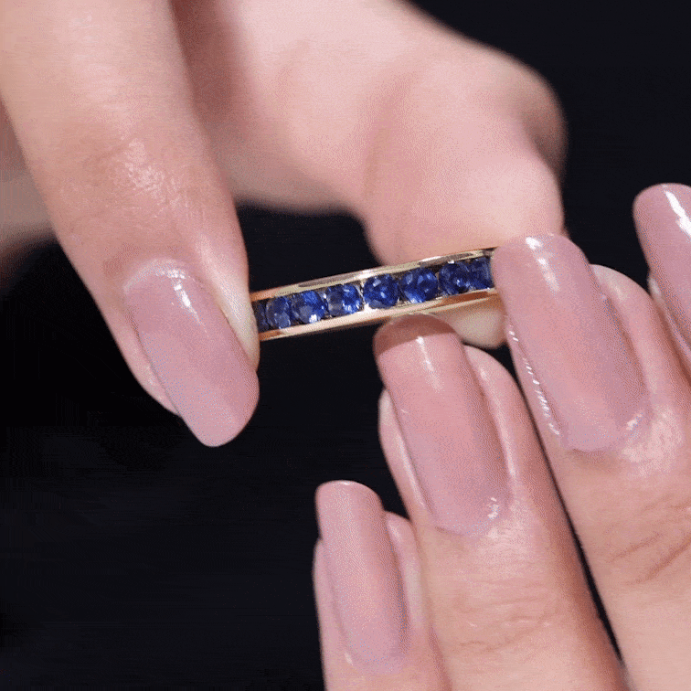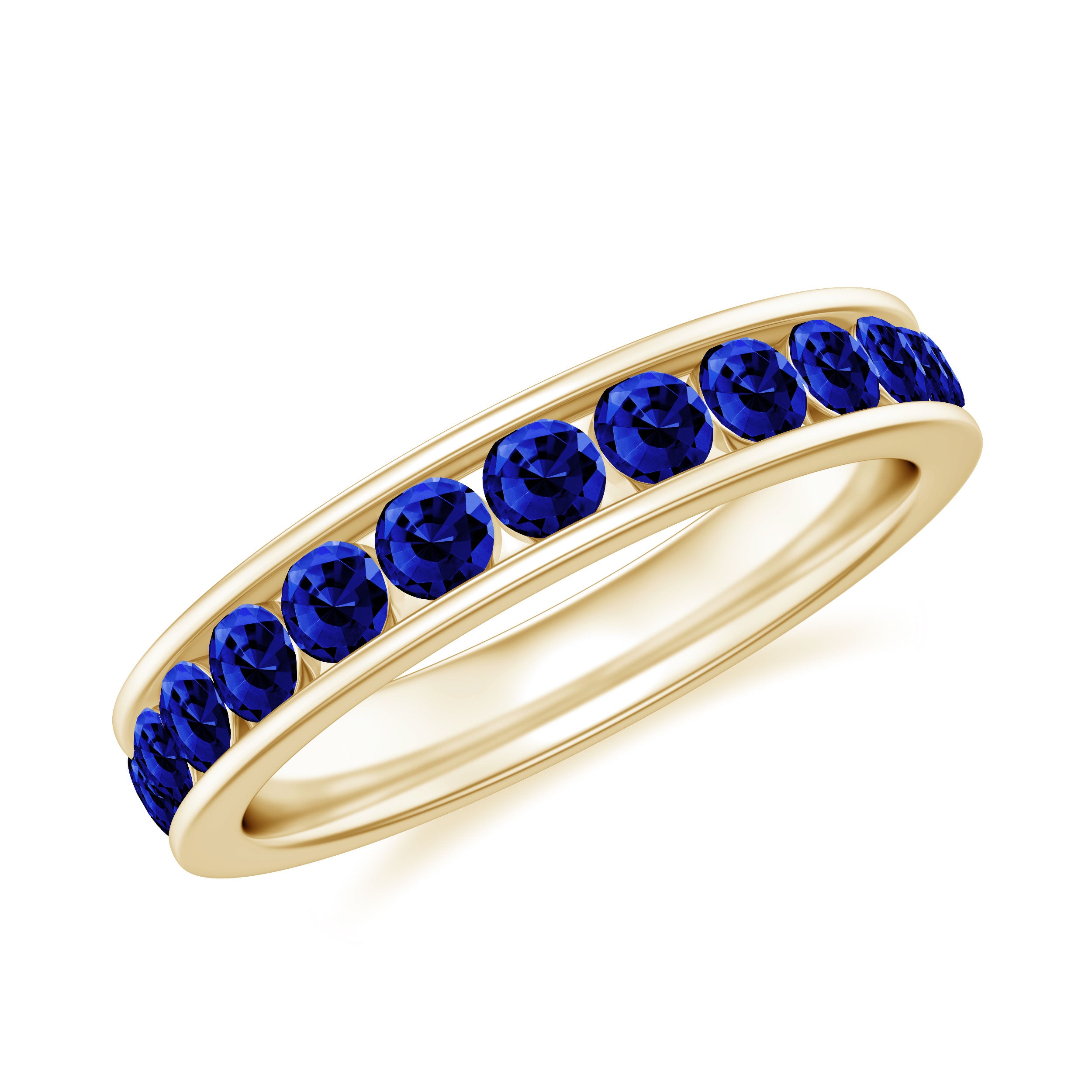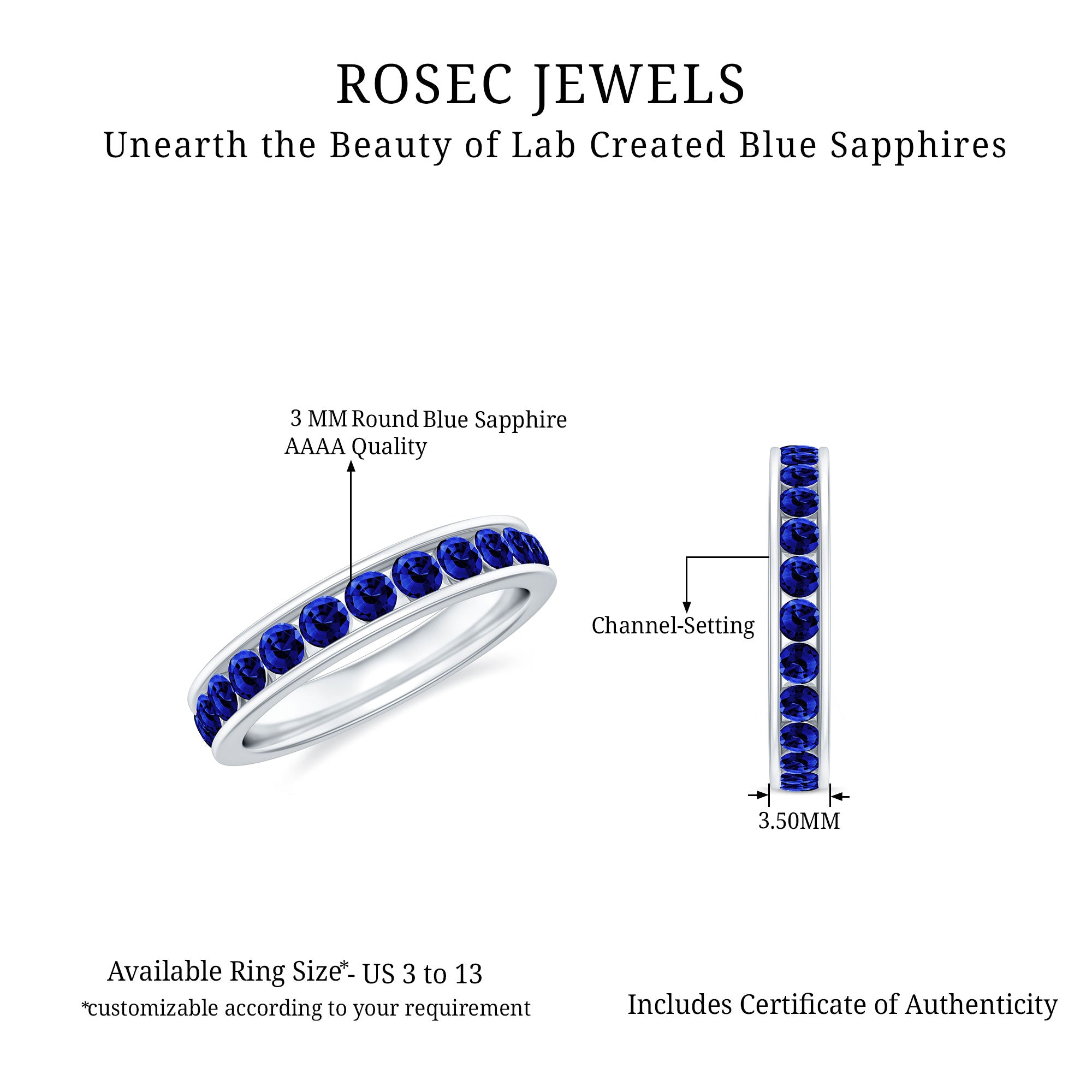 Introducing a stunning Lab Created Blue Sapphire Eternity Ring. This unique piece is adorned with round cut lab-created blue sapphires set in a channel setting on an eternity band ring. It is crafted from gold, making it a perfect addition to your jewelry collection.